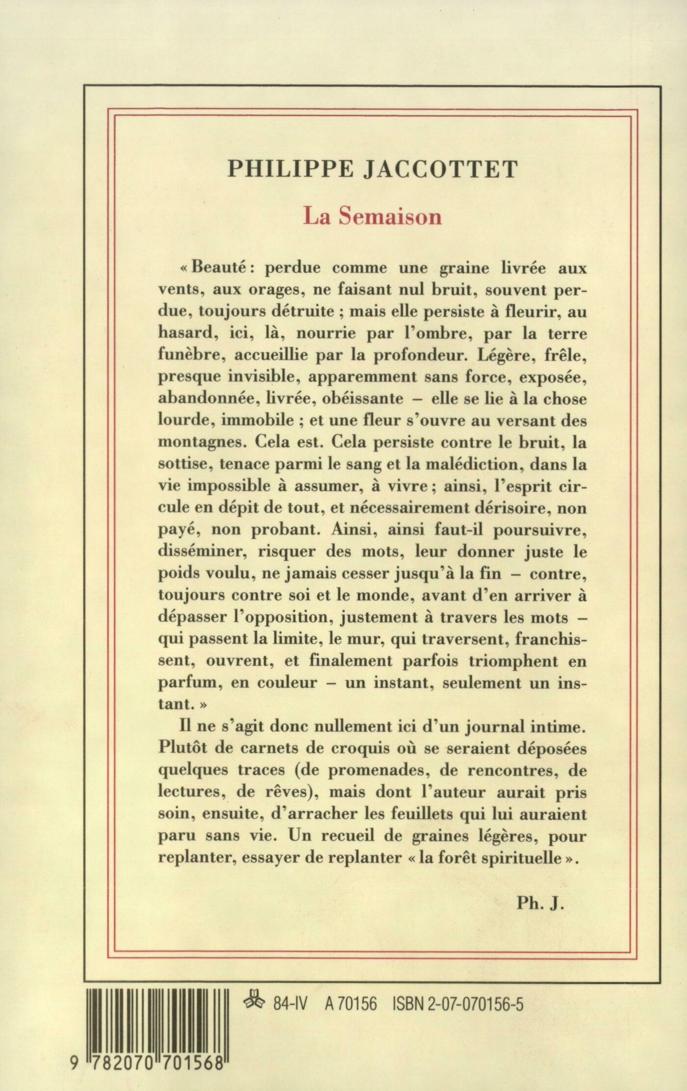 "Beauté : perdue comme une graine livrée aux vents, aux orages, ne faisant nul bruit, souvent perdue, toujours détruite ; mais elle persiste à fleurir, au hasard, ici, là, nourrie par l'ombre, par la terre funèbre, accueillie par la profondeur. Légère, frêle, presque invisible, apparemment sans force, exposée, abandonnée, livrée, obéissante - elle se lie à la chose lourde, immobile ; et une fleur s'ouvre au versant des montagnes. Cela est. Cela persiste contre le bruit, la sottise, tenace parmi le sang et la malédiction, dans la vie impossible à assumer, à vivre ; ainsi, l'esprit circule en dépit de tout, et nécessairement dérisoire, non payé, non probant. Ainsi, ainsi faut-il poursuivre, disséminer, risquer des mots, leur donner juste le poids voulu, ne jamais cesser jusqu'à la fin - contre, toujours contre soi et le monde, avant d'en arriver à dépasser l'opposition, justement à travers les mots - qui passent la limite, le mur, qui traversent, franchissent, ouvrent, et finalement parfois triomphent en parfum, en couleur - un instant, seulement en un instant."Il ne s'agit donc nullement ici d'un journal intime. Plutôt de carnets de croquis où se seraient déposées quelques traces (de promenades, de rencontres, de lectures, de rêves), mais dont l'auteur aurait pris soin, ensuite, d'arracher les feuillets qui lui auraient paru sans vie. Un recueil de graines légères, pour replanter, essayer de replanter la forêt spirituelle.Philippe Jaccottet.