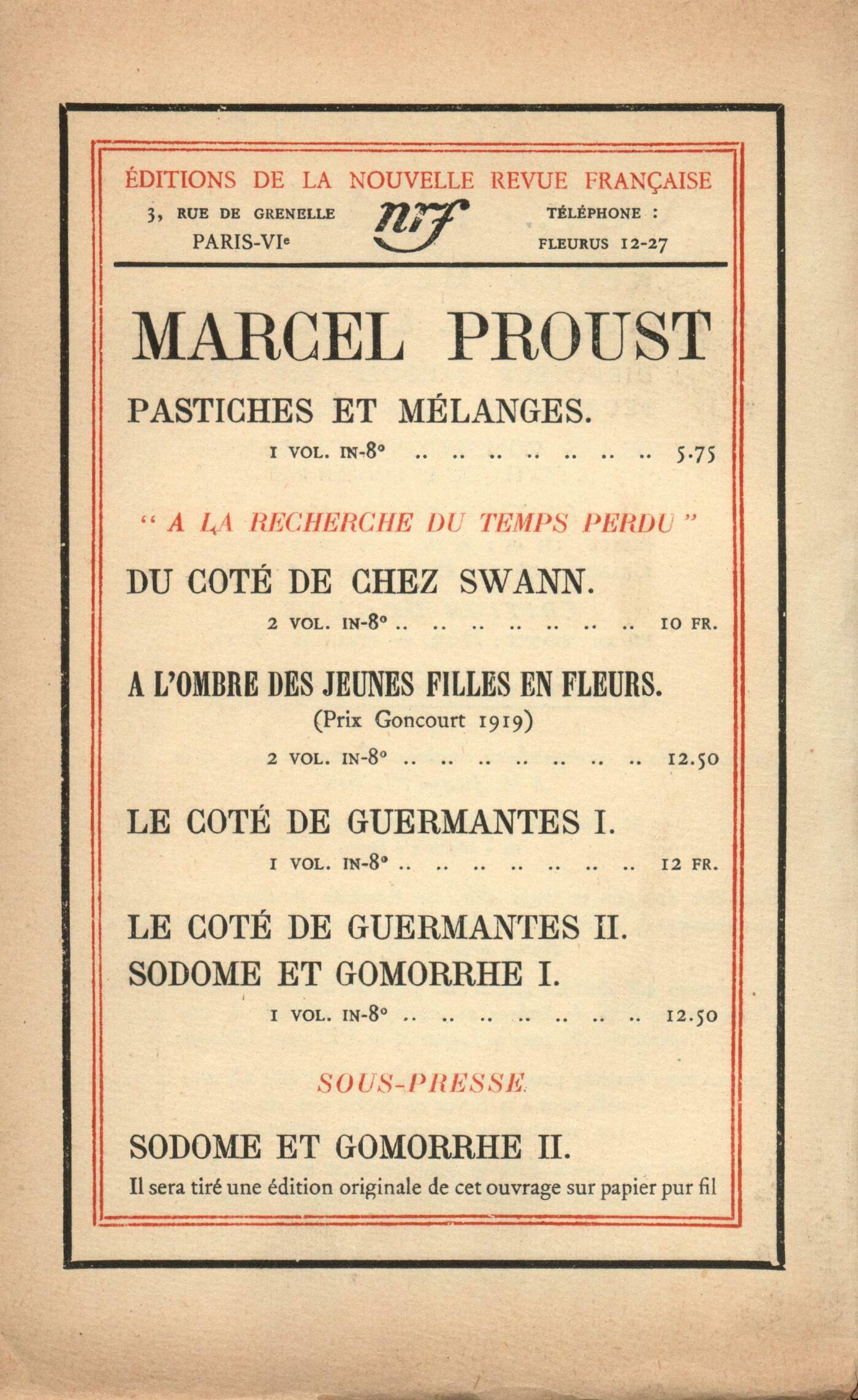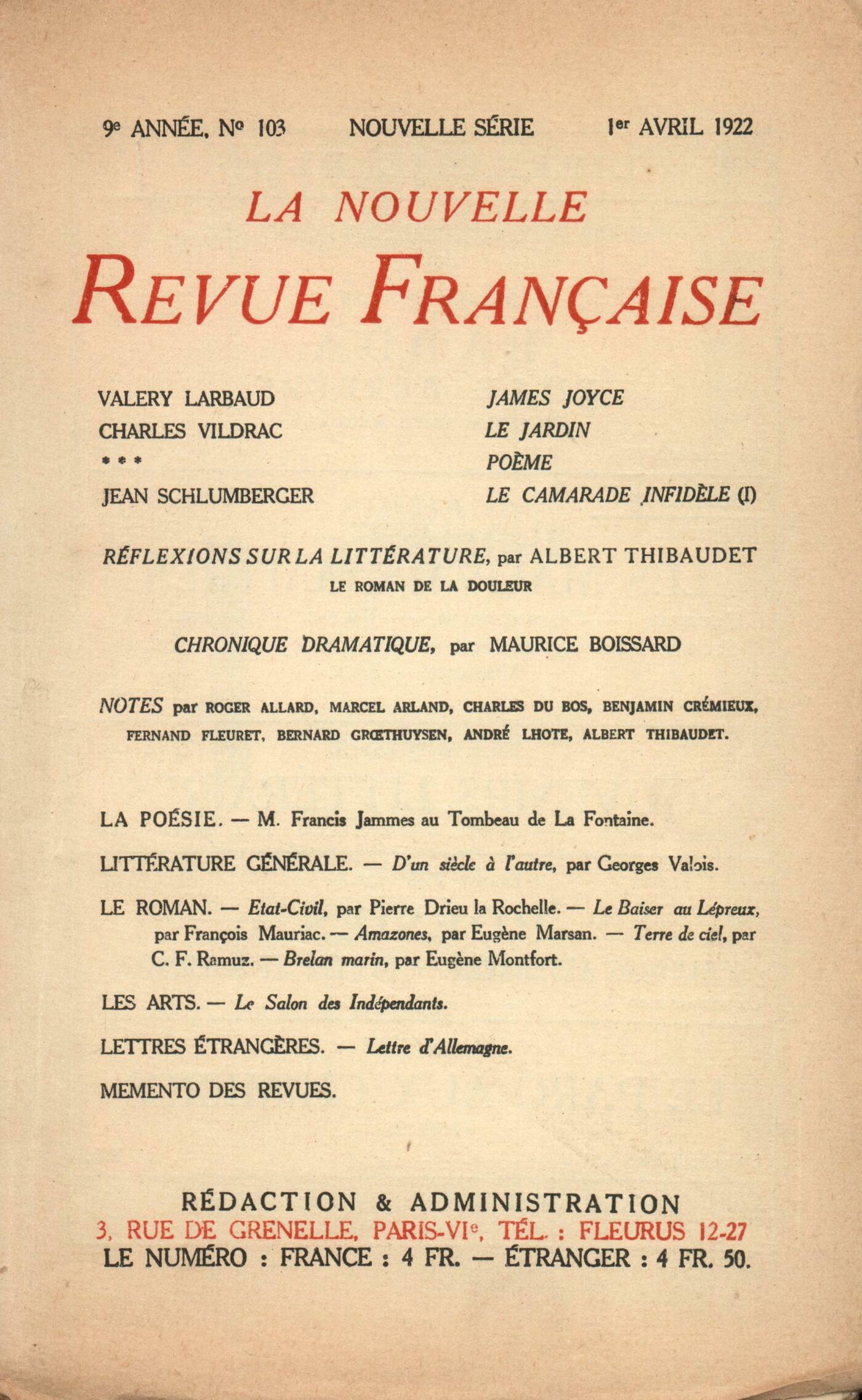Valery Larbaud, James JoyceCharles Vildrac, Le Jardin Anonymes, PočmeJean Schlumberger, Le Camarade infidčle (I)Réflexions sur la littérature : Albert Thibaudet, Le roman de la douleurMaurice Boissard, Chronique dramatiqueNotes : la poésie : Roger Allard, M. Francis Jammes au Tombeau de La FontaineNotes : littérature générale : Albert Thibaudet, D'un sičcle ŕ l'autre, par Georges Valois (Nouvelle Librairie Nationale)Notes : le roman : Marcel Arland, État-Civil, par Pierre Drieu la Rochelle (Éditions de la Nouvelle Revue Française)Benjamin Crémieux, Le Baiser au Lépreux, par François Mauriac (Les Cahiers verts, Grasset)Charles Du Bos, Amazones, par Eugčne Marsan (Les Amis d'Édouard)Benjamin Crémieux, Terre du ciel, par C. F. Ramuz (Crčs)Fernand Fleuret, Brelan Marin, par Eugčne Montfort (Bibliothčque des Marges)Notes : les arts : André Lhote, Le Salon des IndépendantsNotes : lettres étrangčres : Bernard Groethuysen, Lettre d'AllemagneLes revues : Anonymes, Mémento