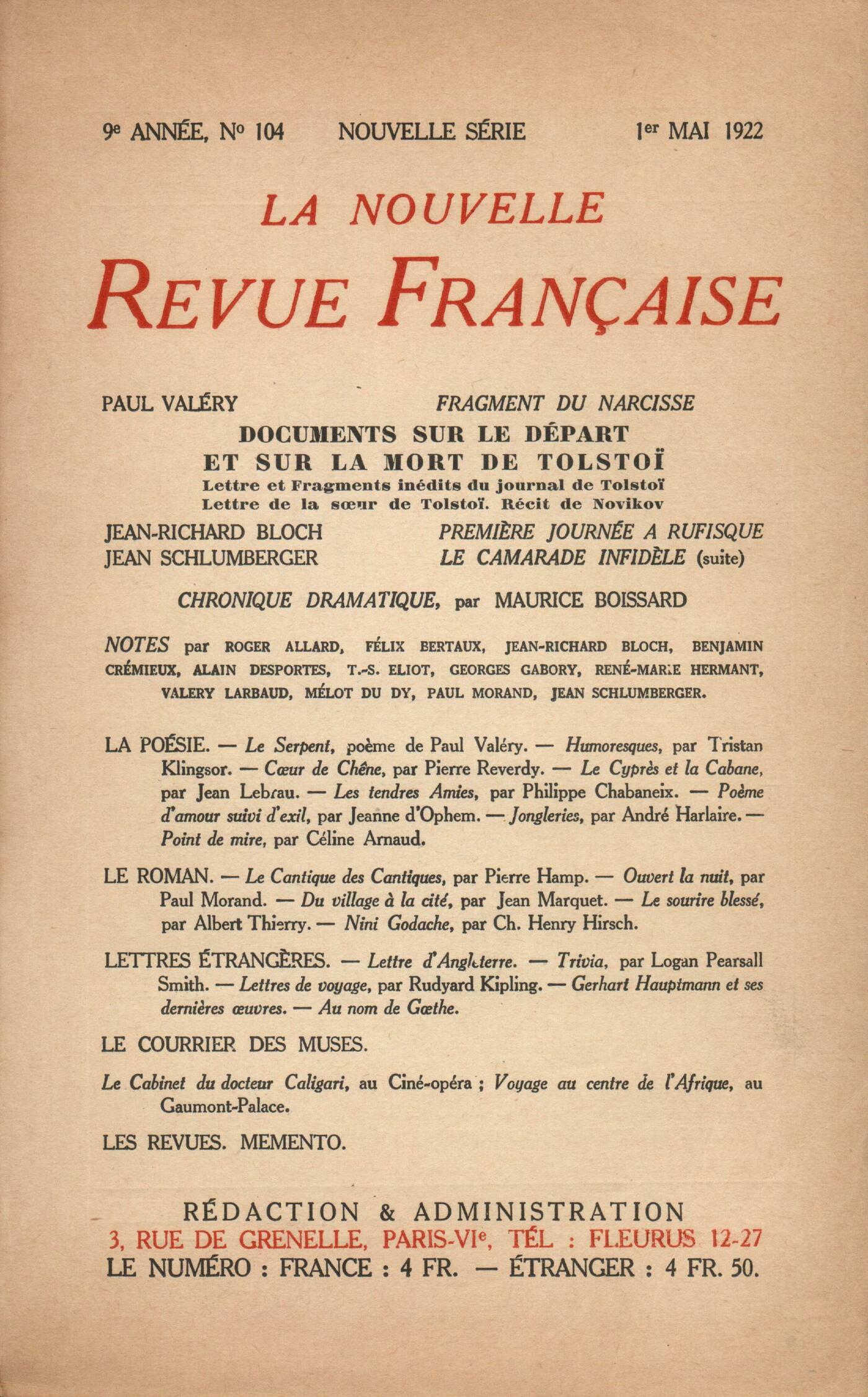 Paul Valéry, Fragments du NarcisseLéon Tolstoď, Documents sur le départ et sur la mort de TolstoďJean-Richard Bloch, Premičre journée ŕ RufisqueJean Schlumberger, Le Camarade infidčle (suite)Maurice Boissard, Chronique dramatiqueNotes : la poésie : Roger Allard, Le Serpent, par Paul Valéry (Éditions de la Nouvelle Revue Française) Mélot Du Dy, Humoresques, par Tristan Klingsor (Bibliothčque du Hérisson)Paul Morand, Cur de chęne, par Pierre Reverdy (Éditions de la Galerie Simon)Roger Allard, Le Cyprčs et la Cabane, par Jean Lebrau (Le Divan) - Les Tendres Amies, par Philippe Chabaneix (Librairie des Lettres) - Počme d'amour suivi d'exil, par Jeanne d'Ophem (Société mutuelle d'édition) - Jongleries, par André Harlaire (Bordeaux, 1922) - Point de mire, par Céline Arnauld (Povolozki)Notes : le roman : Jean-Richard Bloch, Le Cantique des Cantiques, par Pierre Hamp (Éditions de la Nouvelle Revue Française)Benjamin Crémieux, Ouvert la nuit, par Paul Morand (Éditions de la Nouvelle Revue Française)René-Marie Hermant, Du village ŕ la cité, par Jean Marquet (Delalain)Félix Bertaux, Le Sourire blessé, par Albert Thierry (Éditions de la Nouvelle Revue Française)Benjamin Crémieux, Nini Godache, par Charles-Henry Hirsch (Flammarion)Notes : lettres étrangčres : T.S. Eliot, Lettre d'AngleterreValery Larbaud, Trivia, par Logan Pearsall Smith (Bernard Grasset)Jean Schlumberger, Lettres de voyage, par Rudyard Kipling (Payot)Félix Bertaux, Gerhart Hauptmann et ses derničres uvresAlain Desportes, Au nom de GoetheGeorges Gabory, Le courrier des musesJean Paulhan, Le Cabinet du docteur Caligari (Ciné-Opéra) - Voyage au centre de l'Afrique (Gaumont-Palace)Les revues : Anonymes, Le souvenir de Jean Pellerin - Dans le monde des Lettres - Dans le monde des sciences - Dans le monde des théâtres - Mémento