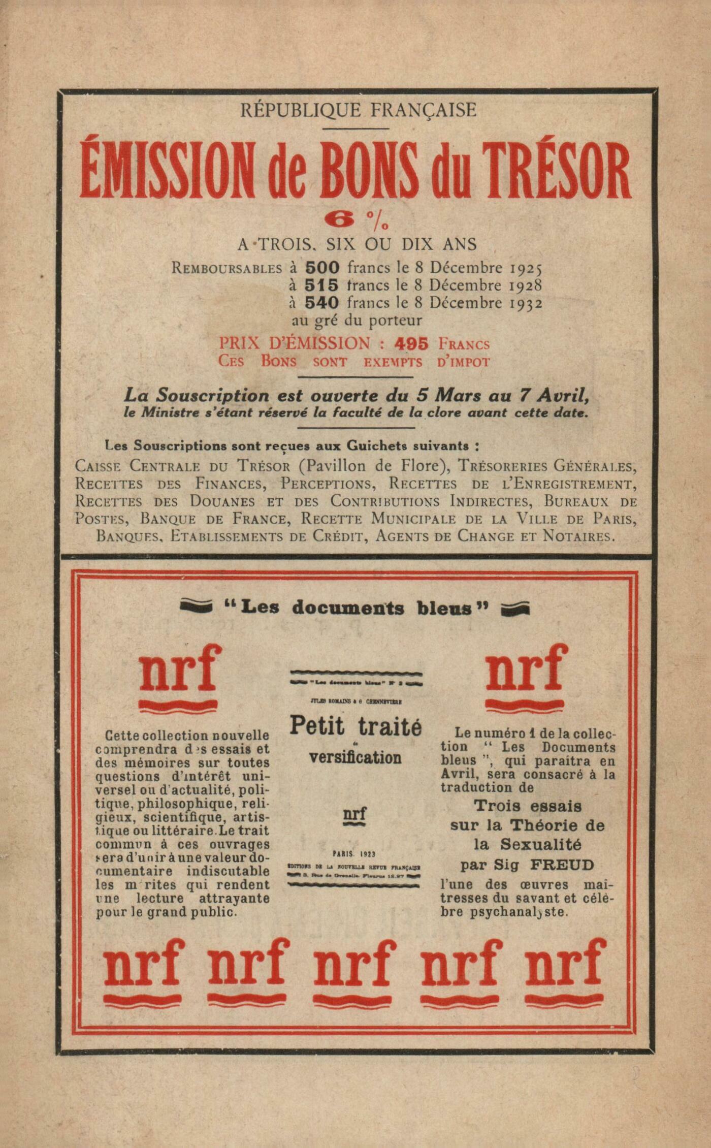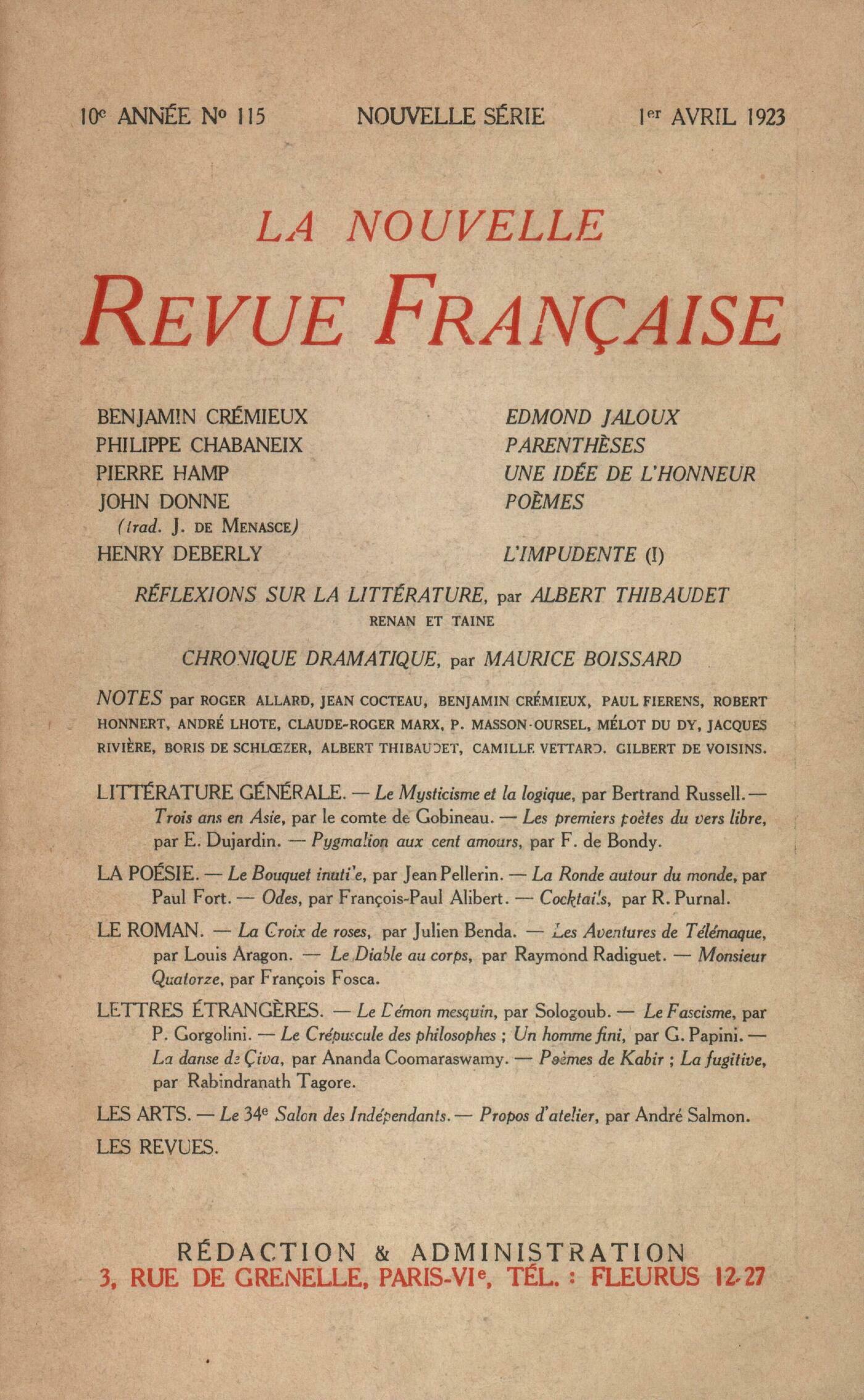 Benjamin Crémieux, Edmond JalouxPhilippe Chabaneix, ParenthčsesPierre Hamp, Une idée de l'honneurJohn Donne, PočmesHenri Deberly, L'Impudente (I)Réflexions sur la littérature : Albert Thibaudet, Renan et TaineMaurice Boissard, Chronique dramatiqueNotes : littérature générale : Camille Vettard, Le Mysticisme et la Logique, par Bertrand Russell (Payot)Robert Honnert, Trois ans en Asie, par le comte de Gobineau (Bernard Grasset)Benjamin Crémieux, Les premiers počtes du vers libre, par Édouard Dujardin (Mercure de France)Albert Thibaudet, Pygmalion aux cent amours, par François de Bondy (Grasset)Notes : la poésie : Roger Allard, Le Bouquet inutile, par jean Pellerin (Éditions de la Nouvelle Revue Française)Paul Fierens, La Ronde autour du monde, par Paul Fort (Flammarion) - Odes, par François-Paul Alibert (Éditions de la Nouvelle Revue Française) Mélot Du Dy, Cocktails, par René Purnal (Éditions des ŤÉcrits du Nordť)Notes : le roman : Benjamin Crémieux, La Croix de Roses, par Julien Benda (Cahiers verts, Grasset)Jacques Rivičre, Les Aventures de Télémaque, par Louis Aragon (Éd. de la Nouvelle Revue Française)Jean Cocteau, Le diable au corps, par Raymond Radiguet (Grasset)Auguste Gilbert de Voisins, Monsieur Quatorze, par François Fosca (Bernard Grasset)Notes : lettres étrangčres : Boris de Schlzer, Le Démon mesquin, par Féodor Sologoub (Bossard)Benjamin Crémieux, Le fascisme, par Pietro Gorgolini (Nouvelle Librairie Nationale) - Un homme fini, par Giovanni Papini (Perrin) - Le crépuscule des philosophes, par Giovanni Papini (Chiron)Paul Masson-Oursel, La danse de Çiva, par Ananda Coomaraswamy (Rieder) - Počmes de Kabir, par Rabindranath Tagore (Éditions de la Nouvelle Revue Française) - La Fugitive, par Rabindranath Tagore (Éditions de la Nouvelle Revue Française)Notes : les arts : André Lhote, Le 34e Salon des IndépendantsClaude Roger-Marx, Propos d'atelier, par André Salmon (Crčs)Les revues : Anonymes, Les revues - Ŕ propos de la vision extra-rétinienne - La Ruhr