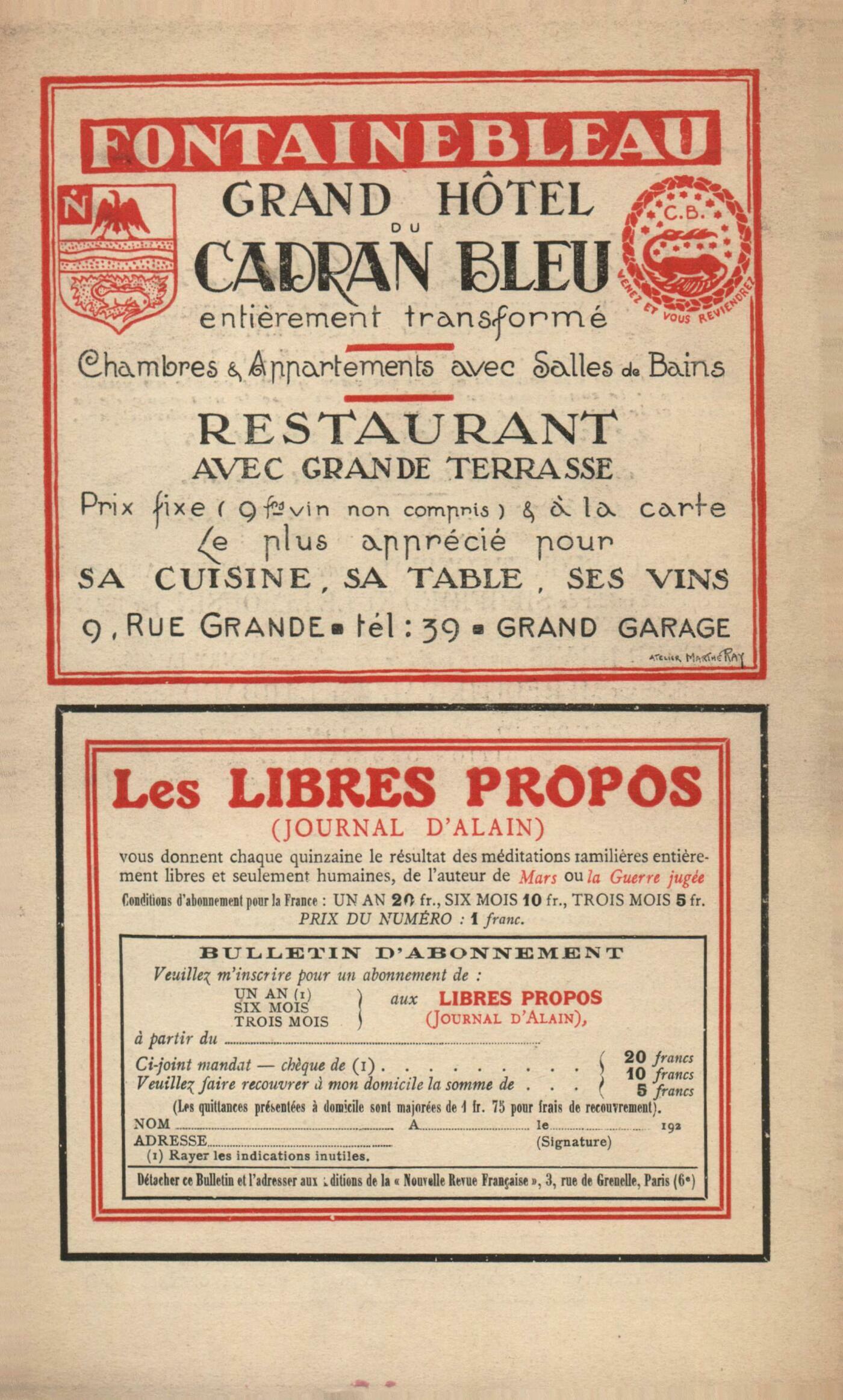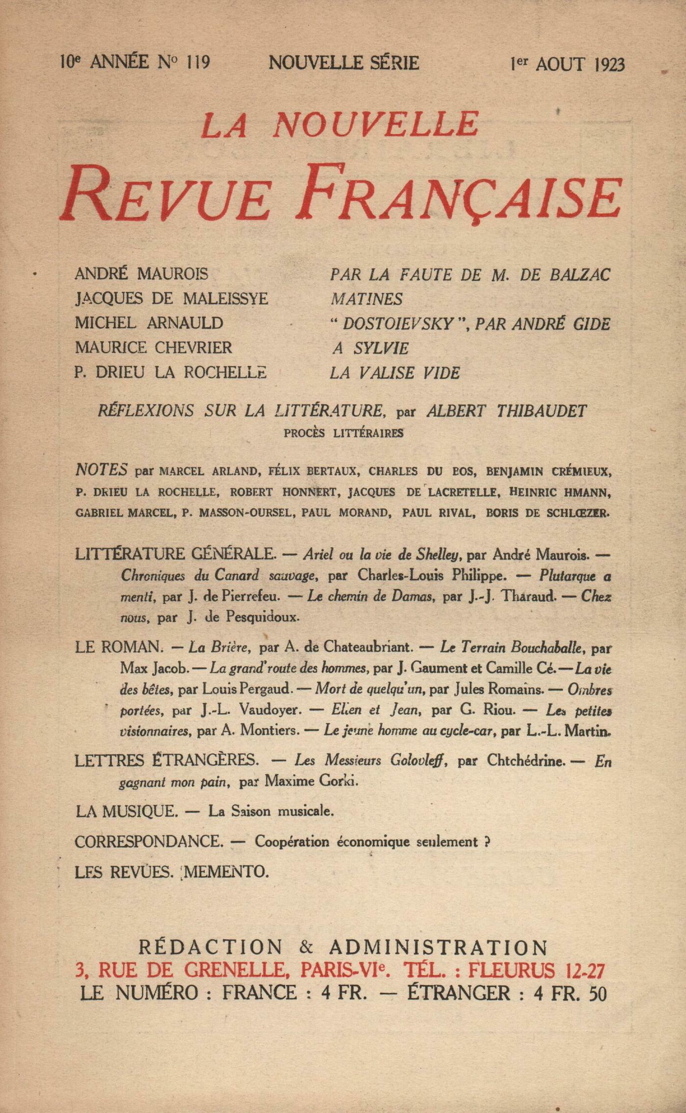 André Maurois, Par la faute de M. de BalzacJacques de Maleissye, MatinesMichel Arnauld, Dostoďevsky, par André GideMaurice Chevrier, Ŕ SylviePierre Drieu la Rochelle, La Valise videRéflexions sur la littérature : Albert Thibaudet, Procčs littérairesNotes : littérature générale : Charles Du Bos, Ariel ou La vie de Shelley, par André Maurois (Cahiers Verts, Grasset)Paul Rival, Chroniques du canard sauvage, par Charles-Louis Philippe (Nouvelle Revue Française)Pierre Drieu la Rochelle, Plutarque a menti, par Jean de Pierrefeu (Grasset)Paul Masson-Oursel, Le chemin de Damas, par Jérôme et Jean Tharaud (Plon)Jacques de Lacretelle, Chez nous, par Joseph de Pesquidoux (Plon)Notes : le roman : Benjamin Crémieux, La Bričre, par Alphonse de Chateaubriand (Grasset)Marcel Arland, Le Terrain Bouchaballe, par Max Jacob (Émile-Paul)Benjamin Crémieux, La Grand'route des hommes, par Jean Gaument et Camille Cé (Grasset) - La vie des bętes, par Louis Pergaud (Mercure de France)Robert Honnert, Mort de quelqu'un, par Jules Romains (Éditions de la Nouvelle Revue Française)Jacques de Lacretelle, Ombres portées, par Jean-Louis Vaudoyer (Le Divan)Benjamin Crémieux, Ellen et Jean, par Gaston Riou (Grasset)Paul Morand, Les petites Ťvisionnairesť, par André Montiers (Fasquelle)Benjamin Crémieux, Le jeune homme au cycle-car, par Louis-Léon Martin (Fayard)Notes : lettres étrangčres : Gabriel Marcel, Les messieurs Golovleff, par Chtchédrine (Delamain, Boutelleau)Paul Rival, En gagnant mon pain, par Maxime Gorki (Calmann-Lévy)Notes : la musique : Boris de Schlzer, La Saison musicaleCorrespondance : Heinrich Mann, Coopération économique seulement? Anonymes, Mémento