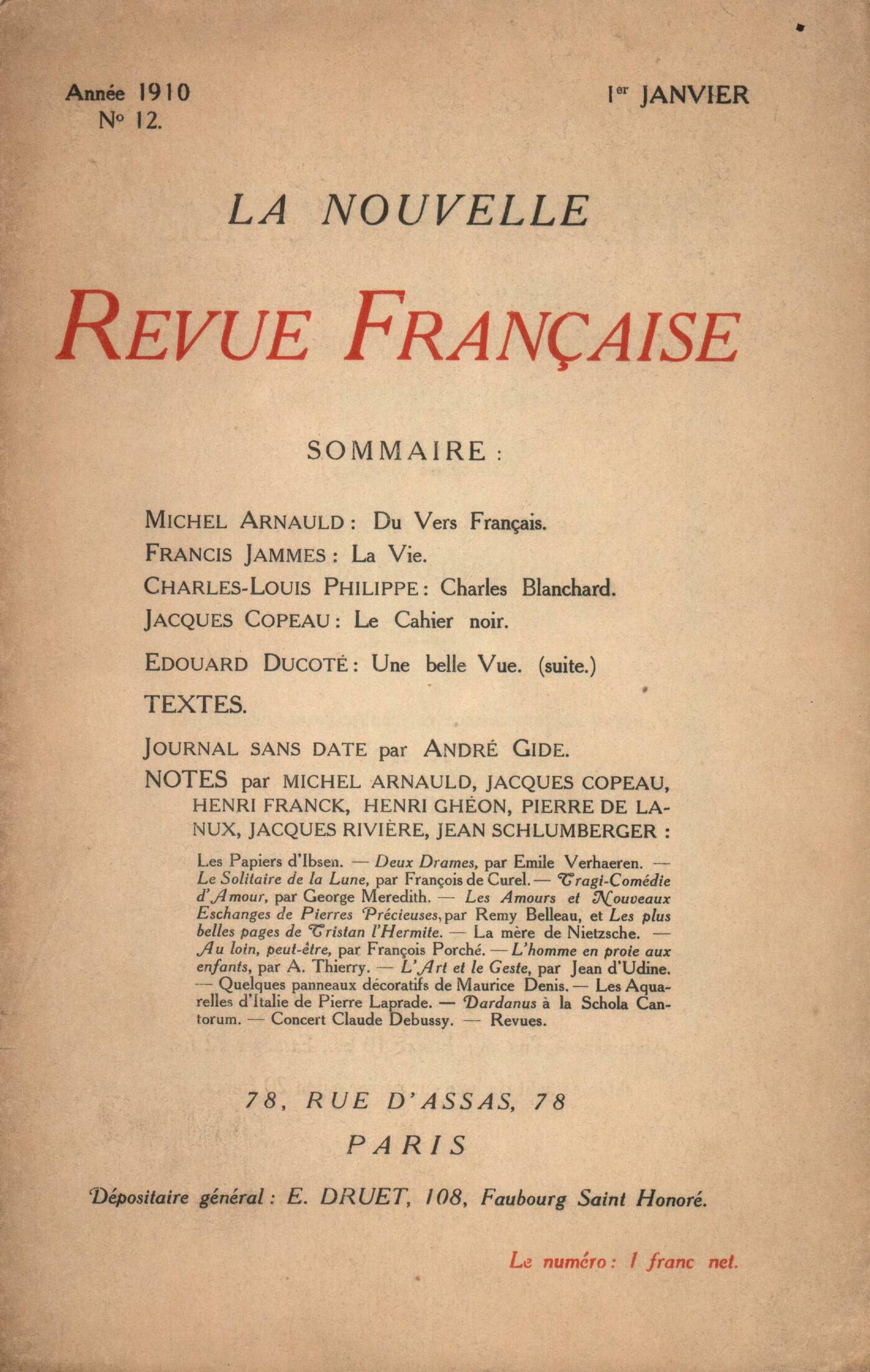 Michel Arnauld, Du Vers FrançaisFrancis Jammes, La VieCharles-Louis Philippe, Charles BlanchardJacques Copeau, Le Cahier noir (Hélčne)Édouard Ducoté, Une belle Vue (suite) Anonymes, Textes [Platon, Delacroix]André Gide, Journal sans datesNotes : Jacques Copeau, Les papiers d'IbsenJean Schlumberger, Deux Drames, par Émile Verhaeren (Mercure)Michel Arnauld, Le Solitaire de la Lune, par François de Curel (Bibliophiles fantaisistes)Henri Ghéon, Tragi-comédie d'amour, par George Meredith (Juven)Jean Schlumberger, Les Amours et Nouveaux Eschanges de pierres précieuses, par Rémy Belleau (Sansot) - Les plus belles pages de Tristan L'Hermitte (Mercure)Jacques Copeau, La mčre de NietzscheHenri Franck, Au loin, peut-ętre, par François Porché (Mercure)Pierre de Lanux, L'Homme en proie aux enfants, par Albert Thierry (Cahiers de la Quinzaine) - L'Art et le Geste, par Jean d'Udine (Alcan)Henri Ghéon, ŤQuelques panneaux décoratifsť de Maurice Denis - ŤLes aquarelles d'Italieť de Pierre LapradeJacques Rivičre, Dardanus de Rameau (ŕ la Schola Cantorum)Michel Arnauld, Concert Claude Debussy (Société des Dillletantes, salle Mors)André Gide, Revues Anonymes, Accusés de réception