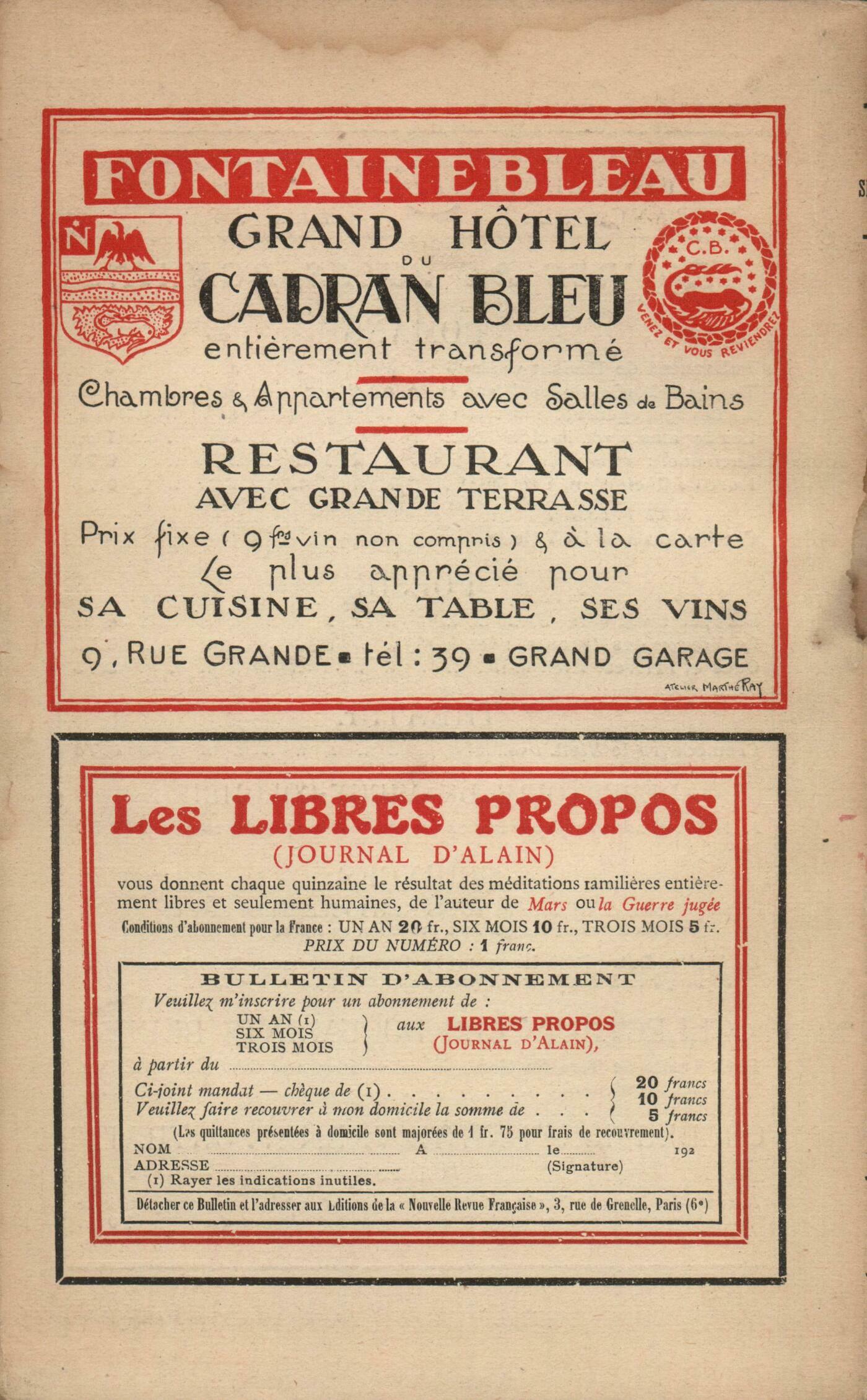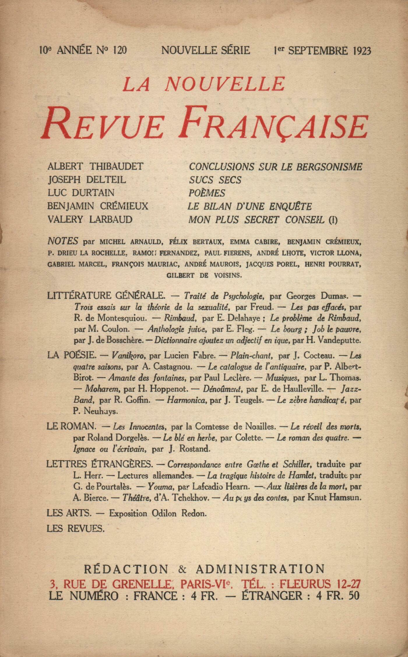 A. Thibaudet, Conclusions sur le bergsonismeJ. Delteil, Sucs secsL. Durtain, PočmesB. Crémieux, Le bilan d'une enquęteV. Larbaud, Mon plus secret conseil... (I)Notes : littérature générale : M. Arnauld, Traité de psychologie, par Georges Dumas R. Fernandez, Trois essais sur la théorie de la sexualité, par Sigmund Freud F. Mauriac, Les pas effacés, par le comte Robert de Montesquiou P. Fierens, Rimbaud, par Ernest Delahaye - Le problčme de Rimbaud, par Marcel Coulon B. Crémieux, Anthologie juive, par Edmond Fleg P. Fierens, Le Bourg, par Jean de Bosschčre - Job le Pauvre, par Jean de Bosschčre V. Llona, Dictionnaire ajoutez un adjectif en ique, par Henri Vandeputte Notes : la poésie : P. Fierens, Vanikoro, par Lucien Fabre - Plain-Chant, par Jean Cocteau - Les Quatre Saisons, par André Castagnou - Le catalogue de l'antiquaire, par Pierre Albert-Birot - Amante des fontaines, par Paul Leclčre - Musiques, par Louis Thomas - Moharem, par Henri Hoppenot - Dénoument, par Éric de Haulleville - Jazz-Band, par Robert Goffin - Harmonica, par Jean Teugels - Le Zčbre handicapé, par Paul Neuhuys Notes : le roman : E. Cabire, Les Innocentes ou La Sagesse des Femmes, par la comtesse de Noailles P. Drieu la Rochelle, Le Réveil des Morts, par Roland Dorgelčs H. Pourrat, Le Blé en herbe, par Colettte B. Crémieux, Le Roman des Quatre, par Paul Bourget, Gérard d'Houville, Henri Duvernois, Pierre Benoît - Ignace ou L'écrivain, par Jean Rostand Notes : lettres étrangčres : M. Arnauld, Correspondance entre Goethe et Schiller F. Bertaux, Lectures allemandesA. Maurois, La tragique histoire de Hamlet, prince de Danemark H. Pourrat, Youma, par Lafcadio Hearn J. Porel, Aux lisičres de la mort, par Ambrose Bierce G. Marcel, Théâtre I, II, d'Antone [sic] Tchekhov A. Gilbert de Voisins, Au pays des contes, par Knut Hamsun Notes : les arts : A. Lhote, Exposition Odilon Redon Les revues : Anonymes, Hommage ŕ Pascal - Deux portraits de Henry James
