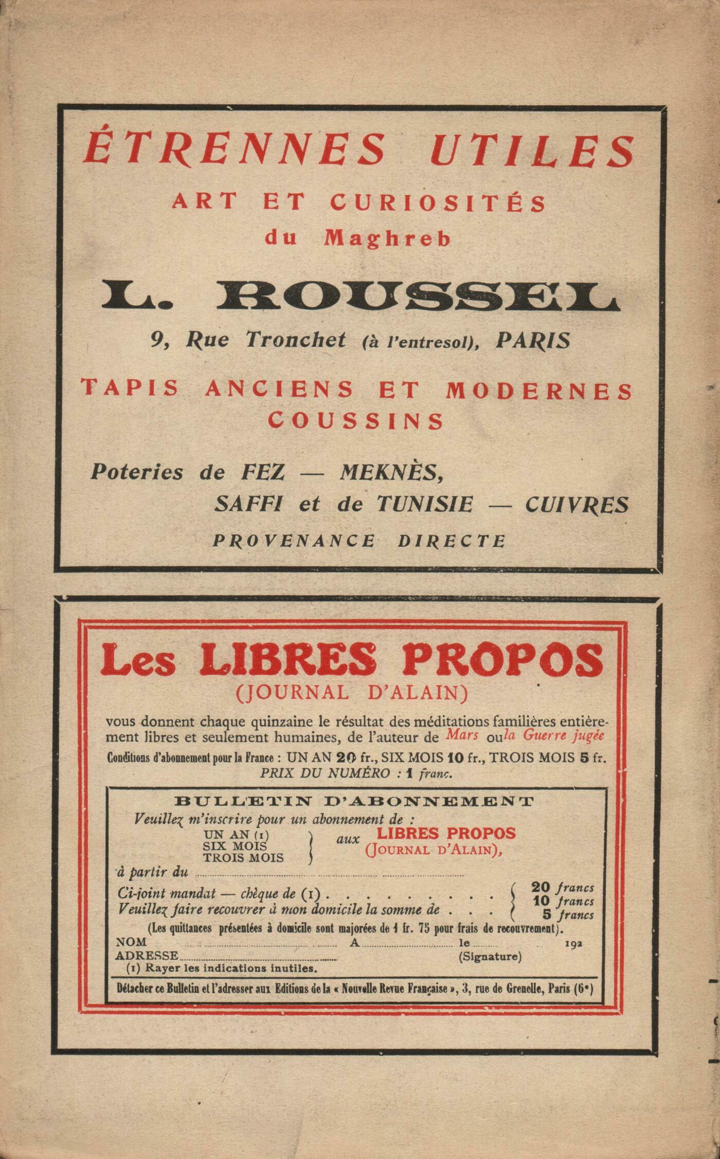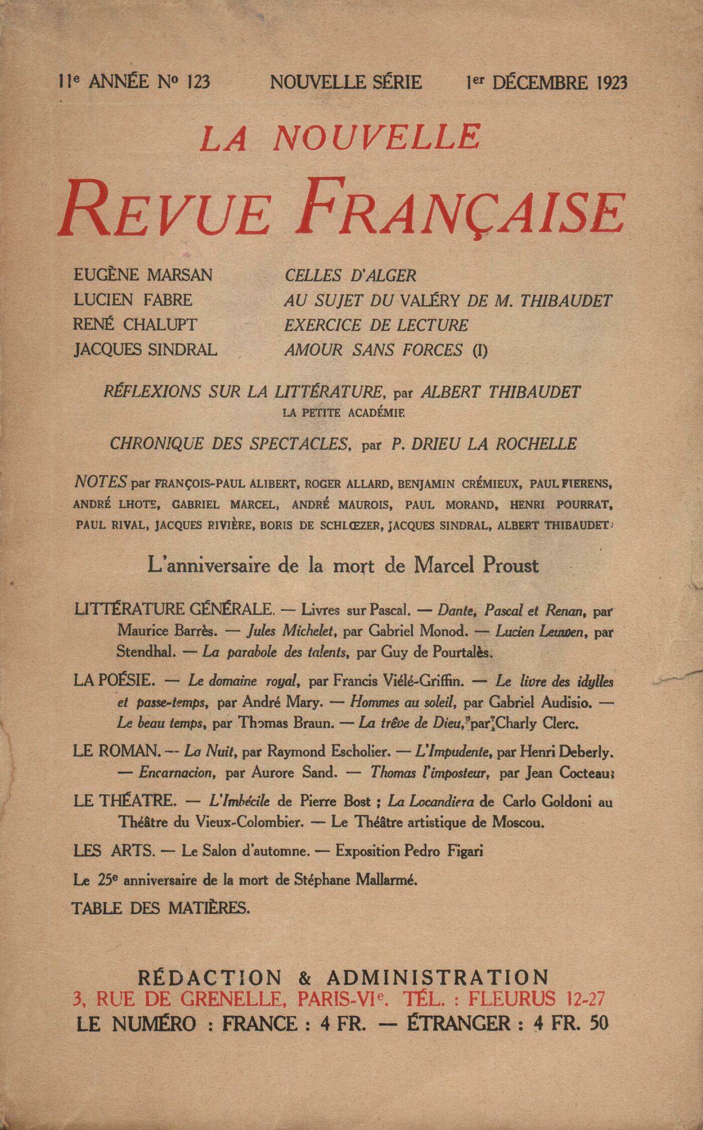E. Marsan, Celles d'AlgerL. Fabre, Au sujet du Valéry de M. ThibaudetR. Chalupt, Exercice de lectureJ. Sindral, Amour sans forces (I)Réflexions sur la littérature : A. Thibaudet, La petite AcadémieNotes : littérature générale : P. Drieu la Rochelle, Chronique des spectaclesJ. Rivičre, L'anniversaire de la mort de Marcel ProustA. Thibaudet, La nuit de Gethsémani, par Léon Chestov - Pascal, par Jacques Chevalier - La doctrine de Port-Royal, par Jean Laporte - Pascal et Saint-Ignace, par Ernest Joly - Pascal a-t-il inventé le haquet?, par Ernest Jovy - Histoire du mouvement janséniste, par A. Gazier J. Sindral, Dante, Pascal et Renan, par Maurice Barrčs A. Thibaudet, Jules Michelet, sa vie et son uvre, par Gabriel Monod A. Maurois, Lucien Leuwen ou L'Amarante et le Noir, par Stendhal G. Marcel, La Parabole des talents, par Guy de Pourtalčs Notes : la poésie : F.-P. Alibert, Le Domaine royal, par Francis Viélé-Griffin R. Allard, Le livre des idylles et passe-temps, par André Mary P. Fierens, Hommes au soleil, par Gabriel Audisio - Le Beau Temps, par Thomas Braun - La tręve de Dieu, par Charles Clerc Notes : le roman : P. Morand, La nuit, par Raymond Escholier G. Marcel, L'Impudente, par Henri Deberly P. Rival, Encarnacion, par Aurore Sand H. Pourrat, Thomas l'Imposteur, par Jean Cocteau Notes : le théâtre : B. Crémieux, L'Imbécile, de Pierre Bost - La Locandiera, de Carlo Goldoni Boris de Schlzer, Le Théâtre artistique de MoscouNotes : les arts : A. Lhote, Le Salon d'Automne - Exposition Pedro Figari J. Royčre, Le 25e anniversaire de la mort de Stéphane MallarméS. Mallarmé, Deux lettres [ŕ Aubanel]