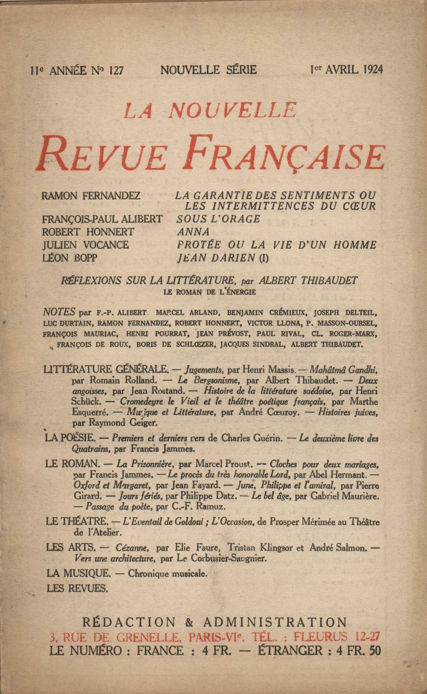 Ramon Fernandez, La garantie des sentiments ou Les intermittences du curFrançois-Paul Alibert, PočmesRobert Honnert, AnnaJulien Vocance, Protée ou La vie d'un hommeLéon Bopp, Jean Darien (I)Réflexions sur la littérature : Albert Thibaudet, Le roman domestiqueNotes : littérature générale : François de Roux, Jugements, II, par Henri Massis (Plon)Paul Masson-Oursel, Mahatma Gandhi, par Romain Rolland (Stock)Ramon Fernandez, Le bergsonisme, par Albert Thibaudet (Éditions de la Nouvelle Revue Française)Jacques Sindral, Deux angoisses, par Jean Rostand (Fasquelle)Albert Thibaudet, Histoire de la littérature suédoise, par Henri Schück (Leroux)Luc Durtain, Cromedeyre le Vieil et le théâtre poétique français depuis 1843, par Marthe Esquerré (Le Mouton Blanc)Boris de Schlzer, Musique et littérature, par André Curoy (Bloud et Gay)Benjamin Crémieux, Histoires juives, par Raymond Geiger (Éditions de la Nouvelle Revue Française)Notes : la poésie : François-Paul Alibert, Premiers et derniers vers de Charles Guérin (Mercure de France)Joseph Delteil, Le Deuxičme Livre des Quatrains, par Francis Jammes (Mercure de France)Notes : le roman : François Mauriac, La Prisonničre, par Marcel Proust (Éditions de la Nouvelle Revue Française)Henri Pourrat, Cloches pour deux mariages, par Francis Jammes (Mercure de France)Jean Prévost, Le Procčs du trčs honorable Lord, par Abel Hermant (Éditions de la Nouvelle Revue Française)Victor Llona, Oxford et Margaret, par Jean Fayard (Fayard)Robert Honnert, June, Philippe et l'Amiral, par Pierre Girard (Kra)Marcel Arland, Jours fériés, par Philippe P. Datz (Au Sans Pareil)Benjamin Crémieux, Le Bel Âge, par Gabriel Mauričre (Ferenczi)Henri Pourrat, Passage du Počte, par C. F. Ramuz (Éditions Georg et Cie)Notes : le théâtre : Paul Rival, L'Éventail, de Goldoni (Théâtre de l'Atelier) - L'Occasion, de Prosper Mérimée (Théâtre de l'Atelier)Notes : les arts : Claude Roger-Marx, Cézanne, par Élie Faure (Crčs) - Cézanne, par Tristan Klingsor (Ferenczi) - Cézanne, par André Salmon (Stock) - Vers une architecture, par Le Corbusier-Saugnier (Crčs)Notes : la musique : Boris de Schlzer, Chronique musicale