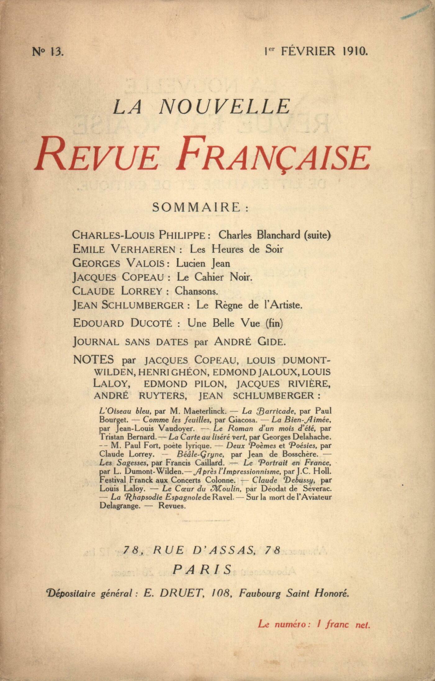 Charles-Louis Philippe, Charles Blanchard (suite)Émile Verhaeren, Heures de SoirGeorges Valois, Lucien JeanJacques Copeau, Le Cahier Noir (La mort)Claude Lorrey, ChansonsJean Schlumberger, Le Rčgne de l'ArtisteÉdouard Ducoté, Une Belle Vue (suite et fin)André Gide, Journal sans datesNotes : Louis Dumont-Wilden, L'Oiseau bleu, par Maurice Maeterlinck (Fasquelle)Henri Ghéon, La Barricade, de Paul Bourget (Vaudeville)Jean Schlumberger, Comme les feuilles, par M. Giacosa (Odéon)Edmond Jaloux, La Bien-Aimée, par Jean-Louis VaudoyerHenri Ghéon, Le Roman d'un mois d'Été, par Tristan Bernard (Ollendorff)Jean Schlumberger, La Carte au liseré vert, par G. Delahache (Cahiers de la Quinzaine)Henri Ghéon, M. Paul Fort, počte lyriqueJean Schlumberger, Deux počmes, par Claude Lorrey - Poésies, par Claude LorreyAndré Ruyters, Béâle-Gryne, par Jean de Bosschčre (Bibliothčque de l'Occident)Jean Schlumberger, Les Sagesses, par C.-Francis Caillard (Bibl. du Temps Présent)Edmond Pilon, Bibliothčque de l'art du XVIIIe sičcle : Le portrait en France, par Louis Dumont-Wilden (G. Van Oest et Cie)Jean Schlumberger, Aprčs l'impressionnisme, par J.-C. Holl (Librairie du XXe sičcle)Jacques Rivičre, Festival Franck aux Concerts Colonne - Claude Debussy par Louis Laloy (Bibliophiles fantaisistes)Louis Laloy, Le Cur du moulin, par M. Déodat de Séverac (Opéra-Comique)Jacques Rivičre, La Rhapsodie espagnole de Ravel aux Concerts-Colonne - Sur la mort de l'aviateur Delagrange - Revues
