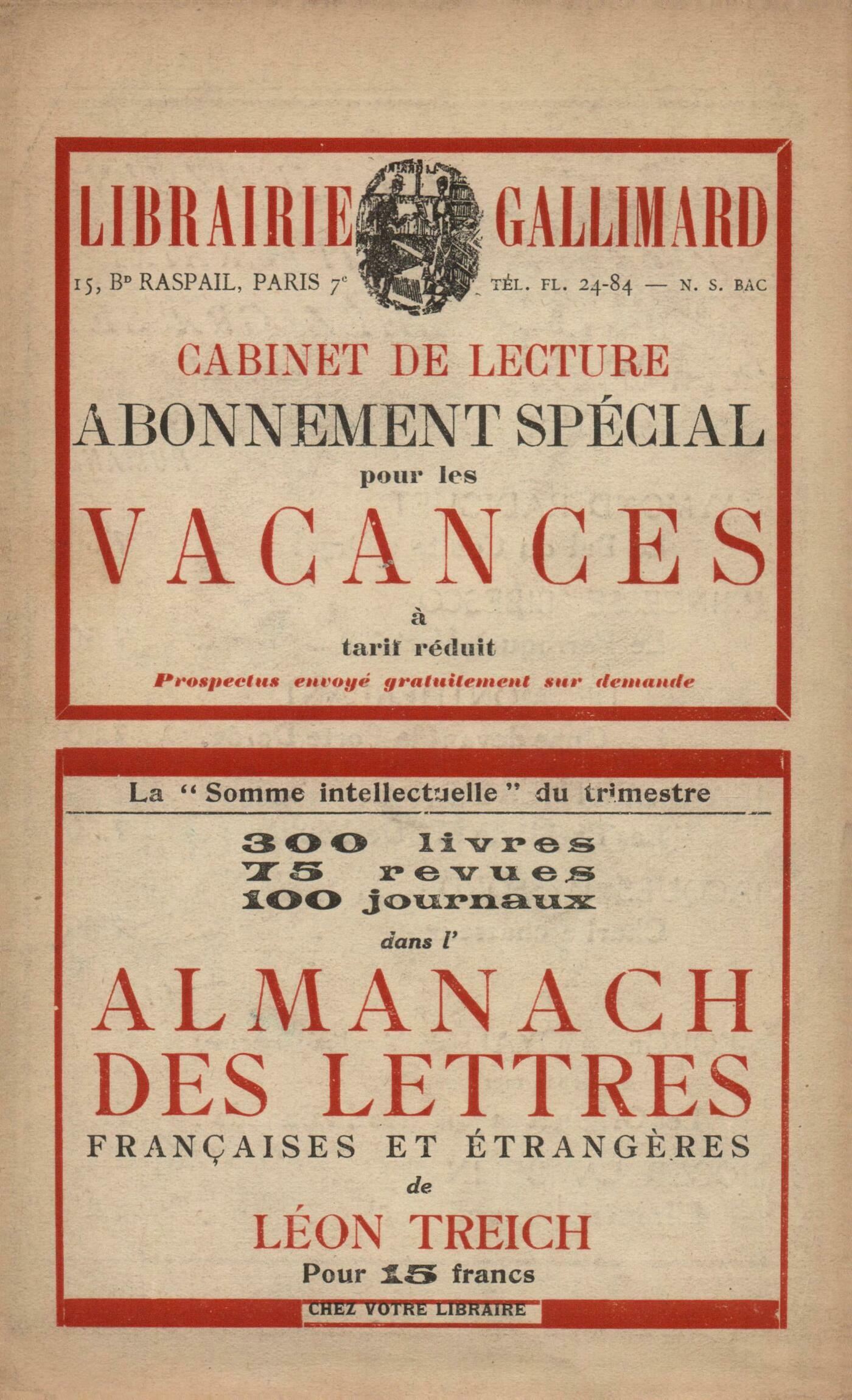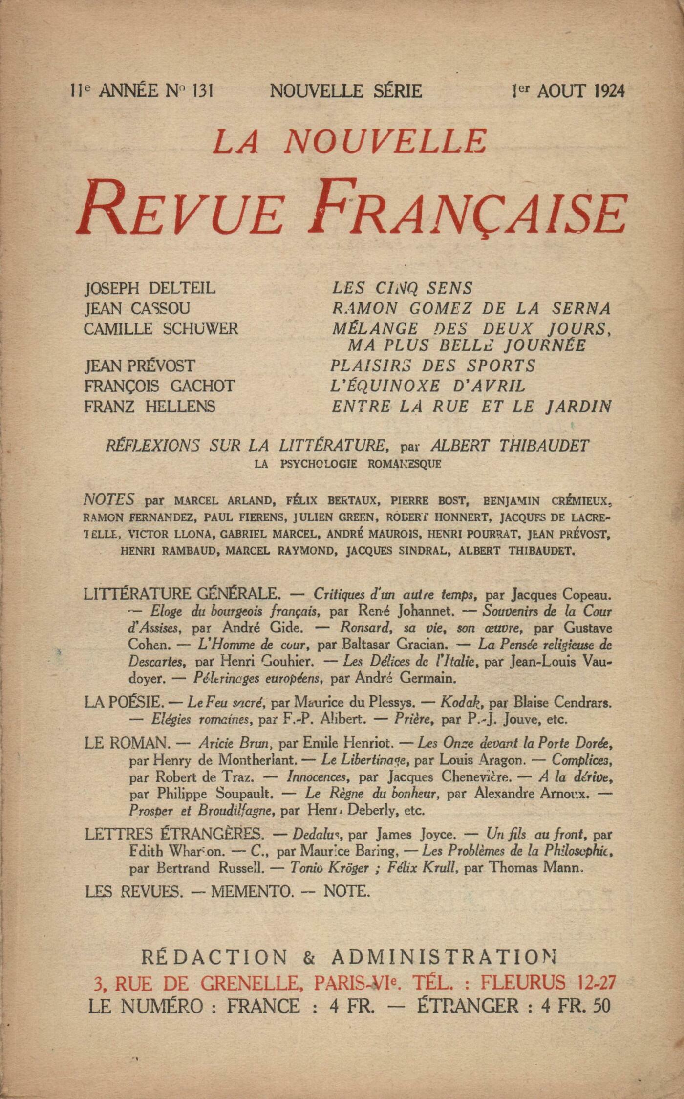 Joseph Delteil, Les cinq sensJean Cassou, Ramon Gomez de la SernaCamille Schuwer, Mélange des deux jours, ma plus belle journéeJean Prévost, Plaisirs des sportsFrançois Gachot, L'Équinoxe d'avrilFranz Hellens, Entre la rue et le jardinRéflexions sur la littérature : Albert Thibaudet, La psychologie romanesqueNotes : littérature générale : Pierre Bost, Critiques d'un autre temps, par Jacques Copeau (Éditions de la Nouvelle Revue Française)Ramon Fernandez, Éloge du bourgeois français, par René Johannet (Cahiers Verts)Jean Prévost, Souvenirs de la cour d'assises, par André Gide (Éditions de la Nouvelle Revue Française)Marcel Raymond, Ronsard, sa vie et son uvre, par Gustave Cohen (Boivin)Jacques Sindral, L'homme de cour, par Baltasar Gracian (Grasset)Albert Thibaudet, La pensée religieuse de Descartes, par Henri Gouhier (Vrin) - Les Délices de l'Italie, par Jean-Louis Vaudoyer (Plon)Jacques Sindral, Pčlerinages européens, par André Germain (Kra)Notes : la poésie : Henri Rambaud, Le Feu sacré, par Maurice du Plessys (Garnier)Paul Fierens, Kodak, par Blaise Cendrars (Stock)Henri Rambaud, Élégies romaines, par François-Paul Alibert (Éditions de la Nouvelle Revue Française)Albert Thibaudet, Poésies complčtes, par Jean Royčre (Edgar Malfčre)Paul Fierens, Pričre, par Pierre Jean Jouve (Stock)Henri Rambaud, Quatre počmes, par Francis Carco, Philippe Chabaneix, Tristan Derčme et Vincent Muselli (Armand Huart)Henri Pourrat, Fanes, par E. M. Bénech (Crčs)Jean Prévost, Cent haď-kaď, par René Maublanc (Au Mouton Blanc)Benjamin Crémieux, Vers et versets, par Raymond Limbosch (Dangotte)Notes : le roman : Jacques de Lacretelle, Aricie Brun ou Les vertus bourgeoises, par Émile Henriot (Plon)Robert Honnert, Les Onze devant la Porte Dorée, par Henry de Montherlant (Grasset)Marcel Arland, Le Libertinage, par Louis Aragon (Éditions de la Nouvelle Revue Française)Jacques Sindral, Complices, par Robert de Traz (Grasset)Henri Pourrat, Innocences, par Jacques Chenevičre (Grasset)Victor Llona, Ŕ la dérive, par Philippe Soupault (Ferenczi)Henri Pourrat, Le Rčgne du Bonheur, par Alexandre Arnoux (Arthčme Fayard)Jean Prévost, Prosper et Broudilfagne, par Henri Deberly (Éditions de la Nouvelle Revue Française)Henri Rambaud, L'amour sur les tréteaux ou La fidélité punie, par Maurice Brillant (Bloud et Gay)Benjamin Crémieux, L'Imagerie du Cordier, par Armand Lunel (Éditions de la Nouvelle Revue Française) - Les Cahiers de Francine, par Camille Marbo Paul Fierens, La Romance ŕ l'étoile, par Martial-Piéchaud Notes : lettres étrangčres : J. Green, Dedalus, par J. Joyce G. Marcel, Un fils au front, par E. Wharton A. Maurois, C., par M. Baring G. Marcel, Les Problčmes de la Philosophie, par B. Russell F. Bertaux, Tonio Kröger, par T. Mann - Félix Krull, par T. Mann Les revues : E. Jaloux, ŤLa Revue des Arts asiatiques se propose de mettre ŕ la portée...ť J. Boulenger, Nouvelle soirée au Grammaire-club Anonymes, Mémento Prix littéraires