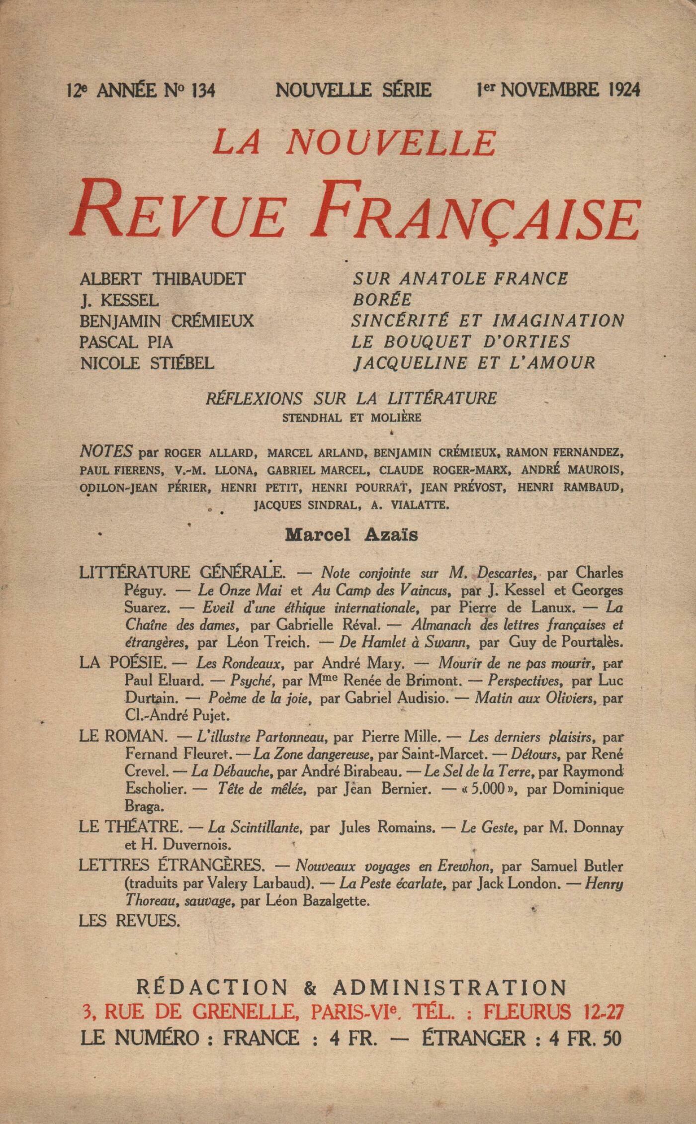 Albert Thibaudet, Sur Anatole FranceJoseph Kessel, BoréeBenjamin Crémieux, Sincérité et imaginationPascal Pia, Le bouquet d'ortiesNicole Stiébel, Jacqueline et l'amourRéflexions sur la littérature : Albert Thibaudet, Stendhal et MoličreHenri Rambaud, Marcel AzaďsNotes : litttérature générale : Jean Prévost - Henri Petit, Note conjointe sur M. Descartes, précédé de la Note sur M. Bergson, de Charles Péguy (Éditions de la Nouvelle Revue Française)Jean Prévost, Le Onze Mai, par Joseph Kessel et Georges Suarez (Éditions de la Nouvelle Revue Française) - Au camp des vaincus, par Joseph Kessel et Georges Suarez (Éditions de la Nouvelle Revue Française)Jacques Sindral, Éveil d'une éthique internationale, par Pierre de Lanux (Stock)Roger Allard, La chaîne des dames, par Gabrielle Reval (Crčs)Benjamin Crémieux, Almanach des Lettres françaises et étrangčres, I, II, par Léon Treich (Crčs)Gabriel Marcel, De Hamlet ŕ Swann, par Guy de Pourtalčs (Crčs)Notes : la poésie : Henri Rambaud, Les Rondeaux, par André MaryOdilon-Jean Périer, Mourir de ne pas mourir, par Paul Eluard (Éditions de la Nouvelle Revue Française)Paul Fierens, Psyché, par Renée de Brimont (Plon)Alexandre Vialatte, Perspectives, par Luc Durtain (Stock) - Počme de la joie, par Gabriel Audisio (Édition du Solitaire) - Matin aux oliviers, par Claude-André Pujet (Maison des Amis du Livre)Notes : le roman : Henri Pourrat, L'illustre Partonneau, par Pierre Mille (Albin Michel)Marcel Arland, Les derniers plaisirs, par Fernand Fleuret (Éditions de la Nouvelle Revue Française)Benjamin Crémieux, La Zone dangereuse, par Saint-Marcet (Grasset)Paul Fierens, Détours, par René Crevel (Éditions de la Nouvelle Revue Française)Benjamin Crémieux, La Débauche, par André Birabeau (Flammarion) - Le Sel de la Terre, par Raymond Escholier (Malfčre)Ramon Fernandez, Tęte de męlée, par Jean Bernier (F. Rieder et Cie) - 5 000, par Dominique Braga (Éditions de la Nouvelle Revue Française)Notes : le théâtre : Claude Roger-Marx, La Scintillante, de Jules Romains (Comédie des Champs-Élysées)Gabriel Marcel, Le Geste, de Maurice Donnay et Henri Duvernois (Théâtre de la Renaissance)Notes : lettres étrangčres : André Maurois, Nouveaux Voyages en Erewhon, par Samuel Butler (Éditions de la Nouvelle Revue Française)Victor Llona, La Peste écarlate, par Jack London (Crčs) - Henry Thoreau, sauvage, par Léon Bazalgette (Rieder)Les revues : Roger Allard, Un portraitPaul Valéry, Un počme ancienPierre Morhange, Un curieux échange de lettres