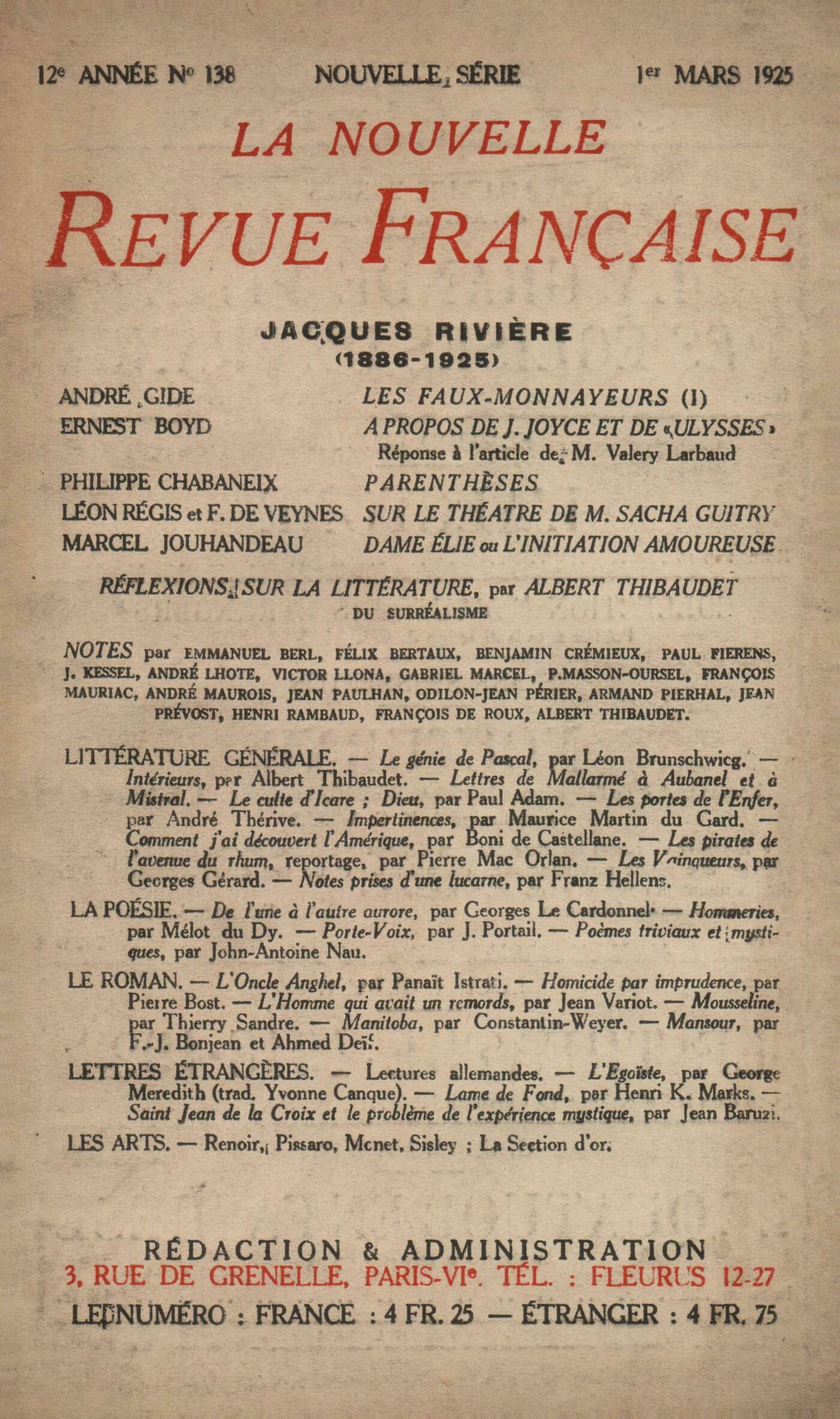 Jean Paulhan, Jacques RivičreAndré Gide, Les Faux-Monnayeurs (I)Ernest Boyd, Ŕ propos de James Joyce et de UlyssesPhilippe Chabaneix, ParenthčsesLéon Régis - F. de Veynčs, Sur le théâtre de M. Sacha GuitryMarcel Jouhandeau, Dame Élie ou L'initiation amoureuseRéflexions sur la littérature : Albert Thibaudet, Du SurréalismeNotes : littérature générale : Jean Prévost, Le Génie de Pascal, par Léon Brunschwicg (Hachette)François de Roux, Intérieurs, par Albert Thibaudet (Plon)Henri Rambaud, Lettres de Mallarmé ŕ Aubanel et ŕ Mistral (Collection du Pigeonnier)Albert Thibaudet, Le Culte d'Icare, par Paul Adam (Flammarion) - Dieu, par Paul Adam (Messein)Henri Rambaud, Les Portes de l'Enfer, par André Thérive (Bloud et Gay)Paul Fierens, Impertinences, par Maurice Martin du Gard (Camille Bloch)François Mauriac, Comment j'ai découvert l'Amérique, par Boni de Castellane (Crčs)Victor Llona, Les pirates de l'Avenue du rhum, par Pierre Mac Orlan (Kra)André Maurois, Les Vainqueurs, par Georges Girard (Éditions de la Nouvelle Revue Française)Odilon-Jean Périer, Notes prises d'une lucarne, par Franz Hellens (Vandenberg)Notes : la poésie : Henri Rambaud, De l'une ŕ l'autre aurore, par Louis Le Cardonnel (Mercure de France)Paul Fierens, Hommeries, par Mélot du Dy (Éditions de la Nouvelle Revue Française) - Porte-voix, par J. Portail (Le Mouton Blanc) - Počmes triviaux et mystiques, par John-Antoine Nau (Messein)Notes : le roman : Joseph Kessel, L'oncle Anghel, par Panaďt Istrati (Rieder)François Mauriac, Homicide par imprudence, par Pierre Bost (Éditions Fast)Benjamin Crémieux, L'homme qui avait un remords, par Jean Variot (Éditions de la Nouvelle Revue Française)Paul Fierens, Mousseline, par Thierry Sandre (Edgar Malfčre)Benjamin Crémieux, Manitoba, par Constantin Weyer (Rieder)Armand Pierhal, Mansour, par F. J. Bonjean et Ahmed Deďf (Rieder)Notes : lettres étrangčres : Félix Bertaux, Lectures allemandesBenjamin Crémieux, L'Égoďste, par George Meredith (Éditions de la Nouvelle Revue Française)Victor Llona, Lame de fond, par Henri K. Marks (Éditions du Monde Nouveau)Emmanuel Berl, Saint Jean de La Croix et le problčme de l'expérience mystique, par Jean BaruziNotes : les arts : André Lhote, Renoir, Pissarro, Monet, Sisley (Galerie Durand-Ruel) - La Section d'or (Galerie Vavin-Raspail)