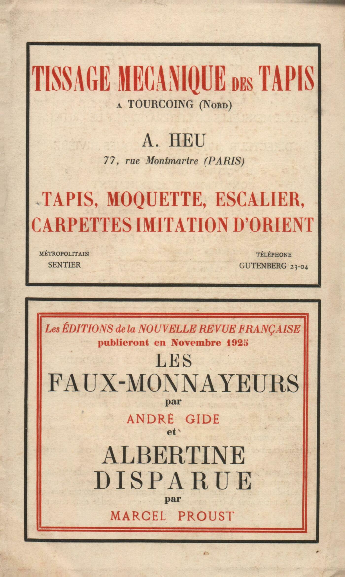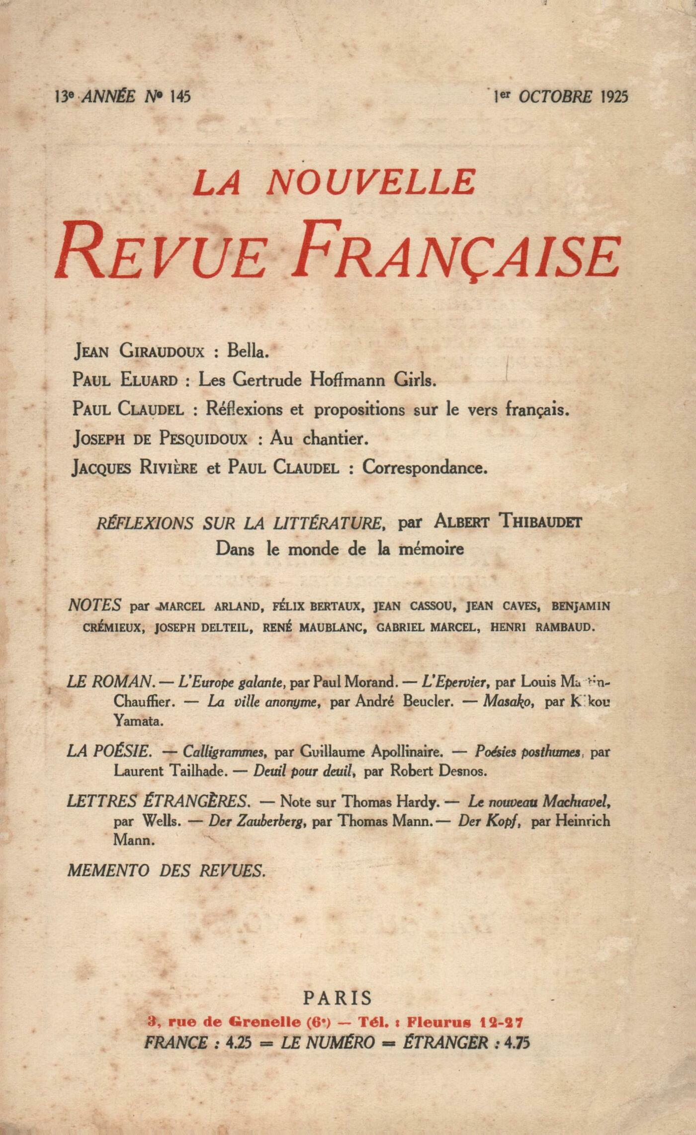 Jean Giraudoux, BellaPaul Éluard, Les Gertrude Hoffmann Girls Premičre du monde AbsencesPaul Claudel, Réflexions et Propositions sur le vers françaisJoseph de Pesquidoux, Au chantierJacques Rivičre - Paul Claudel, Correspondance (III)Réflexions sur la littérature : Albert Thibaudet, Dans le Monde de la MémoireNotes : le roman : Benjamin Crémieux, L'Europe galante, par Paul Morand (Grasset)Jean Caves, L'Épervier, par Louis Martin-Chauffier (Grasset)Joseph Delteil, La Ville Anonyme, par André Beucler (Éditions de la N. R. F.)René Maublanc, Masako, par Kikou Yamata (Stock)Notes : la poésie : Jean Cassou, Calligrammes, par Guillaume Apollinaire (Éditions de la N. R. F.)Henri Rambaud, Poésies posthumes, par Laurent Tailhade (Messein)Jean Cassou, Deuil pour deuil, par Robert Desnos (Kra)Notes : lettres étrangčres : Marcel Arland, Note sur Thomas HardyGabriel Marcel, Le nouveau Machiavel, par G. H. Wells (Albin Michel)Félix Bertaux, Der Zauberberg, par Thomas Mann - Der Kopf, par Heinrich Mann Anonymes, Mémento des revues