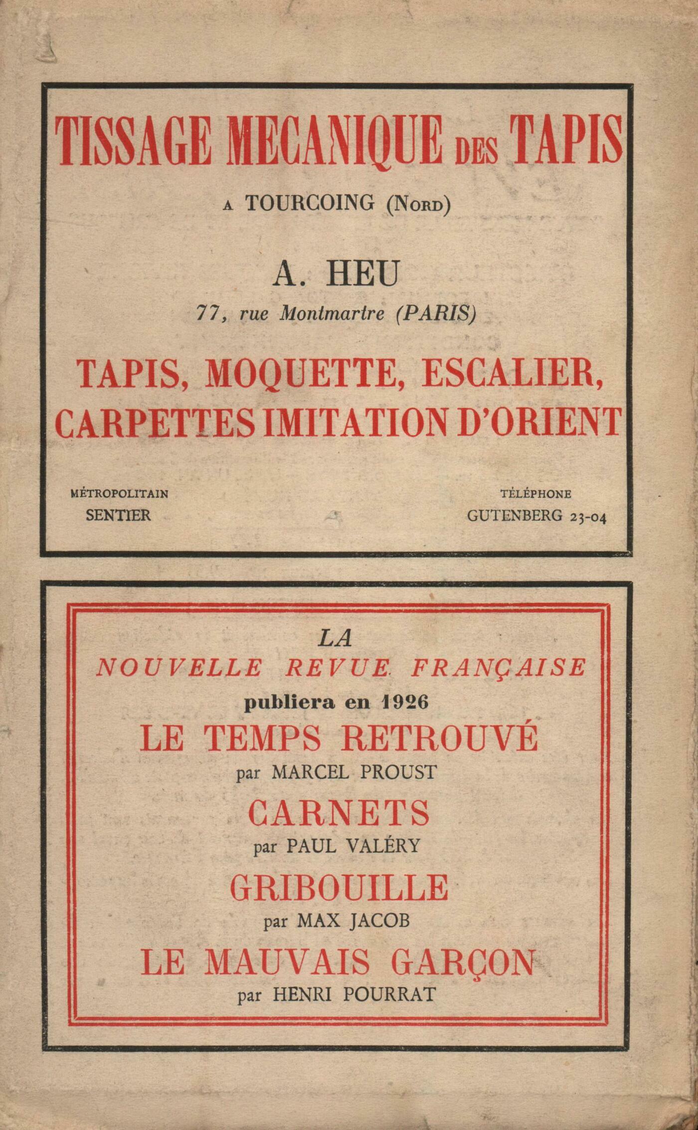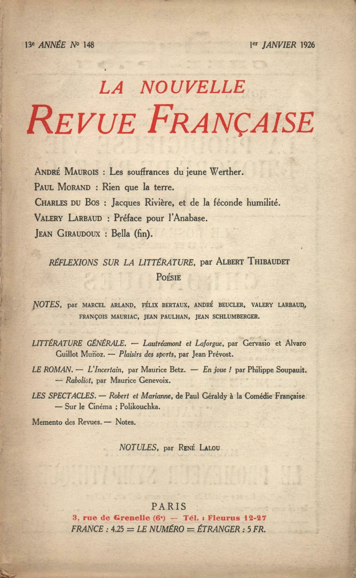 André Maurois, Les souffrances du jeune WertherPaul Morand, Rien que la terreCharles Du Bos, Jacques Rivičre, et de la féconde humilitéValery Larbaud, Préface pour une édition russe d'AnabaseJean Giraudoux, Bella (Fin)Réflexions sur la littérature : Albert Thibaudet, PoésieNotes : littérature générale : Valery Larbaud, Lautréamont et Laforgue, par Gervasio et Alvaro Guillot MuńozJean Schlumberger, Plaisirs des sports, par Jean Prévost (Éditions de la N. R. F.)Notes : le roman : Marcel Arland, L'Incertain, par Maurice Betz (Émile-Paul)Félix Bertaux, En joue!, par Philippe Soupault (Grasset)Jean Paulhan, Raboliot, par Maurice Genevoix (Grasset)Notes : les spectacles : François Mauriac, Robert et Marianne, de Paul Géraldy (Comédie Française)André Beucler, Cinéma (Les Cahiers du mois) - Polikouchka, d'Alexandre SavineRené Lalou, Notules Anonymes, Mémento des revuesPaul Valéry, L'auteur ŕ ses amis