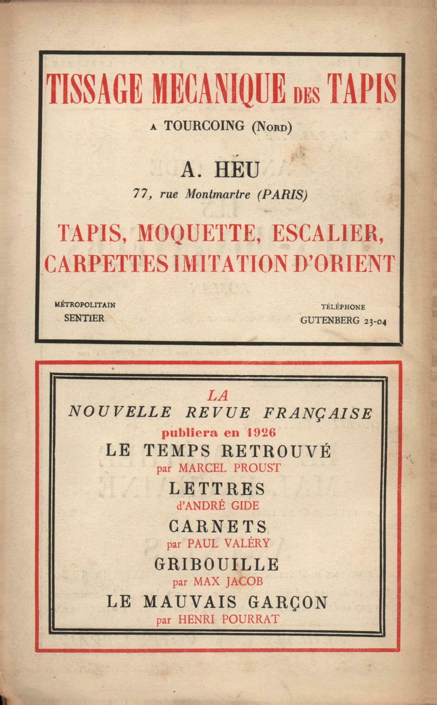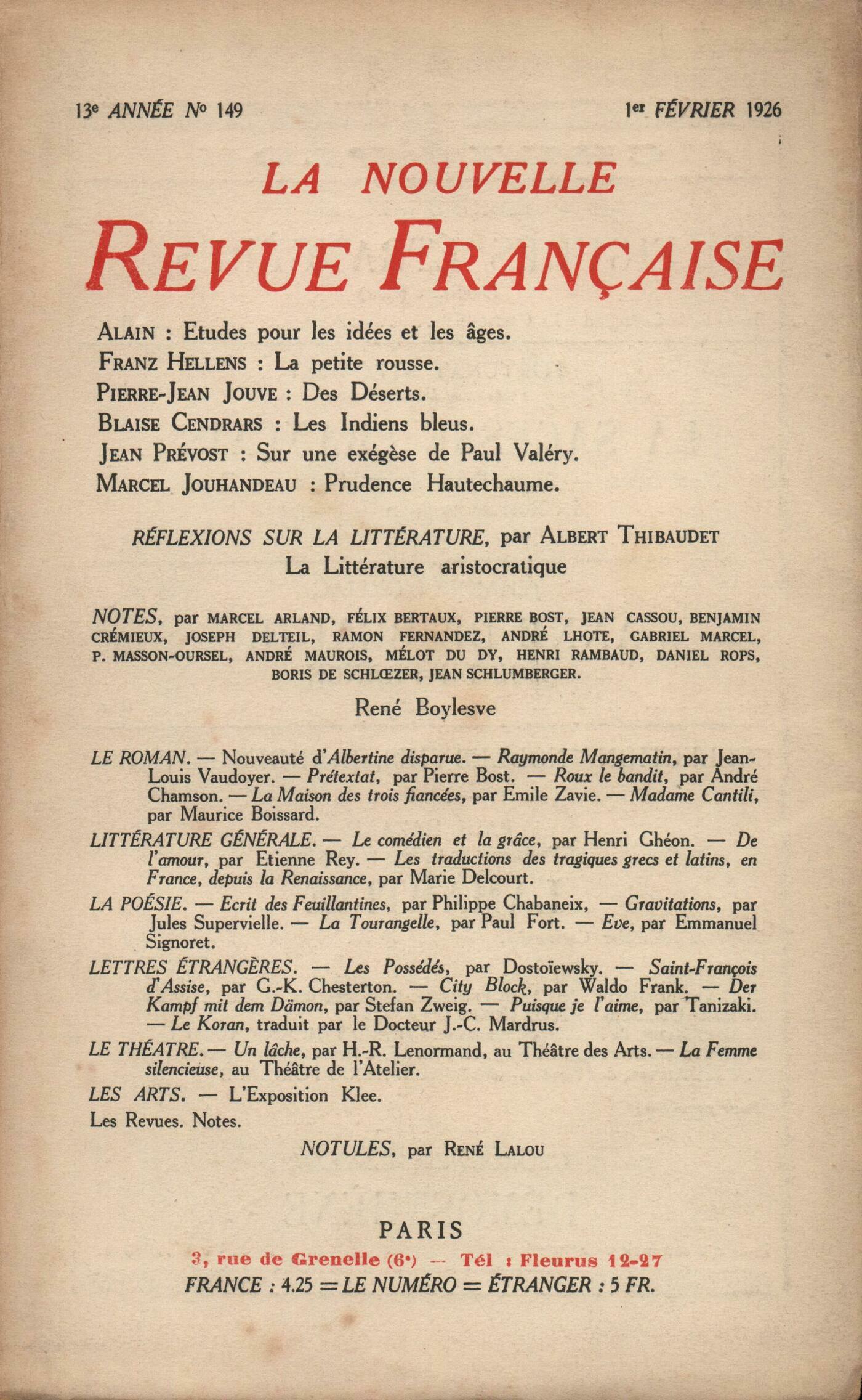Alain, Études pour les idées et les âgesFranz Hellens, La petite roussePierre Jean Jouve, Des DésertsBlaise Cendrars, Les Indiens bleusJean Prévost, Sur une exégčse de Paul ValéryMarcel Jouhandeau, Prudence Hautechaume ou Les mannequins de la voleuseRéflexions sur la littérature : Albert Thibaudet, La Littérature aristocratiqueJean Schlumberger, René BoylesveNotes : le roman : Benjamin Crémieux, Nouveauté d'Albertine disparueAndré Maurois, Raymonde Mangematin, par Jean-Louis Vaudoyer (Plon)Benjamin Crémieux, Prétextat, par Pierre Bost (Éditions de la N. R. F.)Gabriel Marcel, Roux le bandit, par André Chamson (Grasset)Daniel Rops, La Maison des trois fiancées, par Émile Zavie (Éditions de la N. R. F.)Jean Cassou, Madame Cantili, par Maurice Boissard (La Centaine)Notes : littérature générale : Joseph Delteil, Le comédien et la grâce, par Henri Ghéon (Plon)Gabriel Marcel, De l'amour, par Étienne Rey (Grasset)Jean Schlumberger, Les traductions des Tragiques grecs et latins, en France, depuis la Renaissance, par Marie Delcourt (Académie royale de Belgique)Notes : la poésie : Henri Rambaud, Écrit des Feuillantines, par Philippe Chabaneix (Le Divan)Jean Cassou, Gravitations, par Jules Supervielle (Éditions de la N. R. F.) - La Tourangelle, par Paul Fort (Flammarion)Pierre Bost, Čve, par Emmanuel Signoret (Éditions Montaigne) Mélot Du Dy, Toi qui pâlis au nom de Vancouver, par Marcel Thiry (Thone)Notes : lettres étrangčres : Boris de Schlzer, Les Possédés, par Fédor Dostoďewsky [sic] (Bossard)Ramon Fernandez, Saint François d'Assise, par G. K. Chesterton (Plon)Marcel Arland, City Block, par Waldo Franck (Éditions de la N. R. F.)Félix Bertaux, Der Kampf mit dem Dämon, par Stefan ZweigMarcel Arland, Puisque je l'aime, par Tanizaki (Cahiers du mois)Paul Masson-Oursel, Le Koran, trad. des sourates essentielles par J.-C. Mardrus (Fasquelle)Notes : le théâtre : Benjamin Crémieux, Un lâche, de H. R. Lenormand (Théâtre des Arts) Mélot Du Dy, La Femme silencieuse, de Ben Jonson (L'Atelier)Notes : les arts : André Lhote, L'exposition KleeRené Lalou, NotulesLes revues : Anonymes, Notes apocryphes de l'empereur Alexandre IerJérôme et Jean Tharaud, Sur la conversion de PéguyJean Prévost, Éloge de Charlot