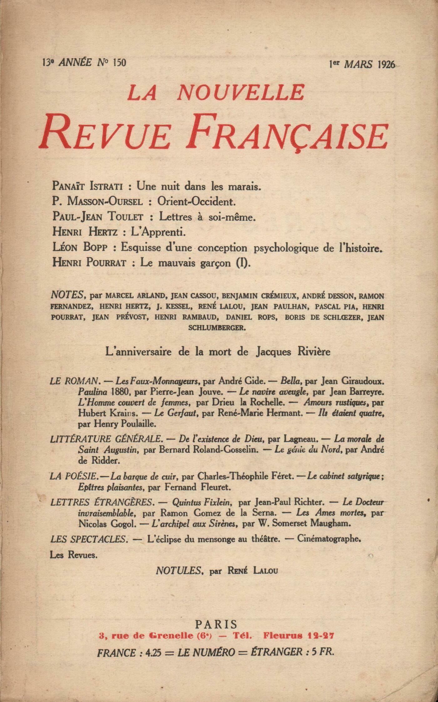 Panaďt Istrati, Une nuit dans les maraisPaul Masson-Oursel, Orient-OccidentPaul-Jean Toulet, Lettres ŕ soi-męmeHenri Hertz, L'ApprentiLéon Bopp, Esquisse d'une conception psychologique de l'histoireHenri Pourrat, Le mauvais garçon (I)Jean Paulhan, L'anniversaire de la mort de Jacques RivičreNotes : le roman : Henri Hertz, Les Faux-Monnayeurs, d'André Gide (Éditions de la N. R. F.)René Lalou, Bella, par Jean Giraudoux (Grasset)Jean Schlumberger, Paulina 1880, par Pierre Jean Jouve (Éditions de la N. R. F.)Benjamin Crémieux, Le Navire aveugle, par Jean Barreyre (Éditions Fast)Ramon Fernandez, L'homme couvert de femmes, par Pierre Drieu la Rochelle (Éditions de la N. R. F.)Marcel Arland, Amours rustiques, par Hubert Krains (Renaissance du Livre) - Le Gerfaut, par René-Marie Hermant (Edgar Malfčre)Henri Pourrat, Ils étaient quatre, par Henry Poulaille (Grasset)Notes : littérature générale : Jean Prévost, De l'existence de Dieu, par Lagneau (Alcan)André Desson, La morale de saint Augustin, par Bernard Roland-Gosselin (Marcel Rivičre)Daniel Rops, Le génie du Nord, par André de Ridder (Sélection)Notes : la poésie : Henri Rambaud, La Barque de cuir, par Charles-Théophile Féret (Garnier)Pascal Pia, Le Cabinet Satyrique (Jean Fort) - Épîtres plaisantes, par Fernand Fleuret (Les Amis d'Édouard)Notes : lettres étrangčres : Jean Cassou, Quintus Fixlein, par Jean-Paul Richter (Stock)Benjamin Crémieux, Le Docteur Invraisemblable, par Ramon Gomez de la Serna (Kra)Boris de Schlzer, Les Aventures de Tchitchikov ou Les Âmes Mortes, par Nicolas Gogol (Bossard)Joseph Kessel, L'Archipel aux Sirčnes, par W. Somerset Maugham (Éditions de France)Notes : les spectacles : Benjamin Crémieux, L'éclipse du mensonge au théâtreRamon Fernandez, CinématographeRené Lalou, NotulesLes revues : Isabelle Rivičre, Jacques Rivičre