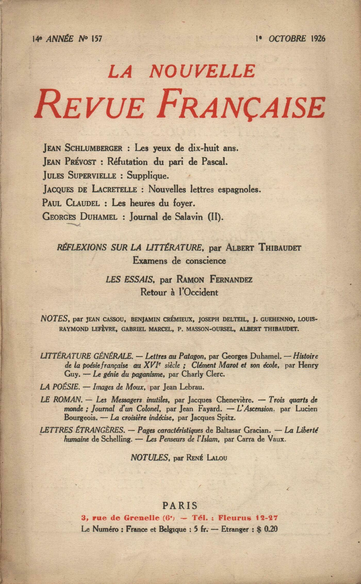 Jean Schlumberger, Les yeux de dix-huit ansJean Prévost, Réfutation du pari de PascalJules Supervielle, Supplique TornadeJacques de Lacretelle, Nouvelle lettres espagnolesPaul Claudel, Les heures du foyerGeorges Duhamel, Journal de Salavin (II)Réflexions sur la littérature : Albert Thibaudet, Examens de conscienceNotes : les essais : Ramon Fernandez, Retour ŕ l'OccidentNotes : littérature générale : Benjamin Crémieux, Lettres au Patagon, par Georges Duhamel (Mercure de France)Louis-Raymond Lefčvre, Histoire de la poésie française au XVIe sičcle, par Henry Guy (Champion)Albert Thibaudet, Le Génie du Paganisme, par Charly Clerc (Payot)Notes : la poésie : Joseph Delteil, Images de Moux, par Jean Lebrau (Le Divan)Notes : le roman : Benjamin Crémieux, Les Messagers inutiles, par Jacques Chenevičre (Grasset) - Trois-quarts de monde, par Jean Fayard (Fayard) - Journal d'un colonel, par Jean Fayard (Éditions de la N. R. F.)Jean Guéhenno, L'Ascension, par Lucien Bourgeois (Rieder)Benjamin Crémieux, La Croisičre indécise, par Jacques Spitz (Éditions de la N. R. F.)Notes : lettres étrangčres : Jean Cassou, Pages caractéristiques de Baltasar Gracian (Mercure de France)Gabriel Marcel, La Liberté humaine, de Schelling (Rieder)Paul Masson-Oursel, Les Penseurs de l'Islam, V, par le baron Carra de Vaux (P. Geuthner)René Lalou, Notules