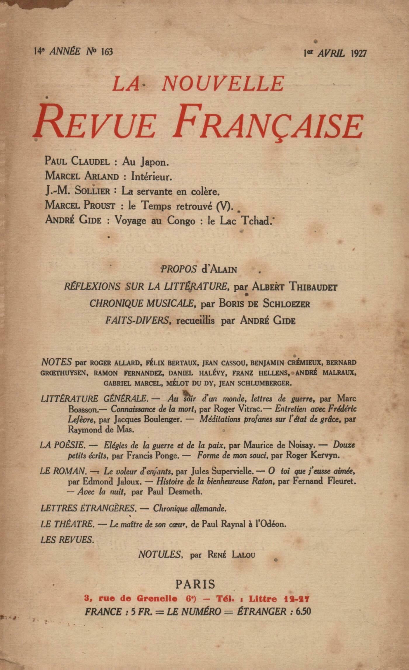 Paul Claudel, Au JaponMarcel Arland, IntérieurJ.-M. Sollier, La servante en colčreMarcel Proust, Le Temps retrouvé (V)André Gide, Voyage au Congo : le lac Tchad Alain, ProposRéflexions sur la littérature : Albert Thibaudet, Journaux intimesBoris de Schlzer, Chronique musicaleAndré Gide, Faits-diversNotes : littérature générale : Daniel Halévy, Au soir d'un monde, par Marc Boasson (Plon)Jean Cassou, Connaissance de la mort, par Roger Vitrac (Éditions de la N. R. F.)Ramon Fernandez, Entretien avec Frédéric Lefčvre, par Jacques Boulenger (Le Divan)Jean Schlumberger, Méditations profanes sur l'état de grâce, par Raymond de Mas (Crčs)Notes : la poésie : Roger Allard, Élégies de la Guerre et de la Paix, par Maurice de Noisay (La Cité des Livres), Douze petits écrits, par Francis Ponge (Éditions de la N. R. F.) Mélot Du Dy, Forme de mon souci, par Roger Kervyn (Vromant)Notes : le roman : Benjamin Crémieux, Le Voleur d'Enfants, par Jules Supervielle (Éditions de la N. R. F.)Gabriel Marcel, Ô toi que j'eusse aimée, par Edmond Jaloux (Plon)André Malraux, Histoire de la bienheureuse Raton, fille de joie, par Fernand Fleuret (Éditions de la N. R. F.)Franz Hellens, Avec la nuit, par Paul Desmeth (Éditions ŤUn coup de dés...ť)Notes : lettres étrangčres : Félix Bertaux, Chronique allemandeNotes : le théâtre : Benjamin Crémieux, Le Maître de son cur, de Paul Raynal (L'Odéon)René Lalou, NotulesLes revues : Paul Valéry, Notes sur la décadence de l'EuropeBruno Barilli, Maître Titta Alain, Le plombier et le drapierJean Paulhan, Jacques Rivičre et les Cahiers d'Occident Anonymes, Mémento