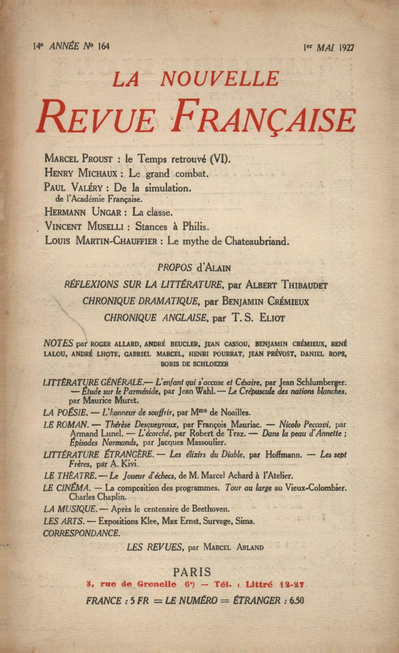 Marcel Proust, Le Temps retrouvé (VI)Henri Michaux, Le grand combatPaul Valéry, Difficulté de définir la simulationHermann Ungar, La classeVincent Muselli, Les sonnets ŕ PhilisLouis Martin-Chauffier, Le mythe de Chateaubriand Alain, ProposRéflexions sur la littérature : Albert Thibaudet, L'amour des LettresBenjamin Crémieux, Chronique dramatiqueLes Lettres anglaises : T.S. Eliot, Le roman anglais contemporainNotes : littérature générale : Jean Prévost, L'enfant qui s'accuse, par Jean Schlumberger (Éditions de la N. R. F.) - Césaire, par Jean Schlumberger (Éditions de la N. R. F.)Gabriel Marcel, Étude sur le Parménide, par Jean Wahl (Rieder) Daniel-Rops, Le Crépuscule des nations blanches, par Maurice Muret (Payot)Notes : la poésie : Roger Allard, L'Honneur de souffrir, par la comtesse de Noailles (Grasset)Notes : le roman : Benjamin Crémieux, Thérčse Desqueyroux, par François Mauriac (Grasset)Gabriel Marcel, L'Écorché, par Robert de Traz (Grasset)René Lalou, Dans la peau d'Annette, par Jacques Massoulier (Éditions de la N. R. F.) - Épisodes Normands, par Jacques Massoulier (Éditions de la N. R. F.)Benjamin Crémieux, Nicolo Peccavi, par Armand Lunel (Éditions de la N. R. F.)Notes : lettres étrangčres : Jean Cassou, Les Élixirs du Diable, par Hoffmann (Stock)Henri Pourrat, Les Sept Frčres, par A. Kivi (Stock)Notes : le théâtre : André Beucler, Le Joueur d'échecs, de Marcel Achard (Théâtre de l'Atelier)Notes : les arts : Boris de Schlzer, Aprčs le centenaire de BeethovenAndré Beucler, Au cinémaAndré Lhote, Expositions Klee, Mar Ernst, Survage, SimaLes revues : Jean Grenier, L'EspritMarcel Arland, Le Grand Prix BeaumarchaisCorrespondance : Gérard de Catalogne, Une lettreRoger Vitrac, Une lettre