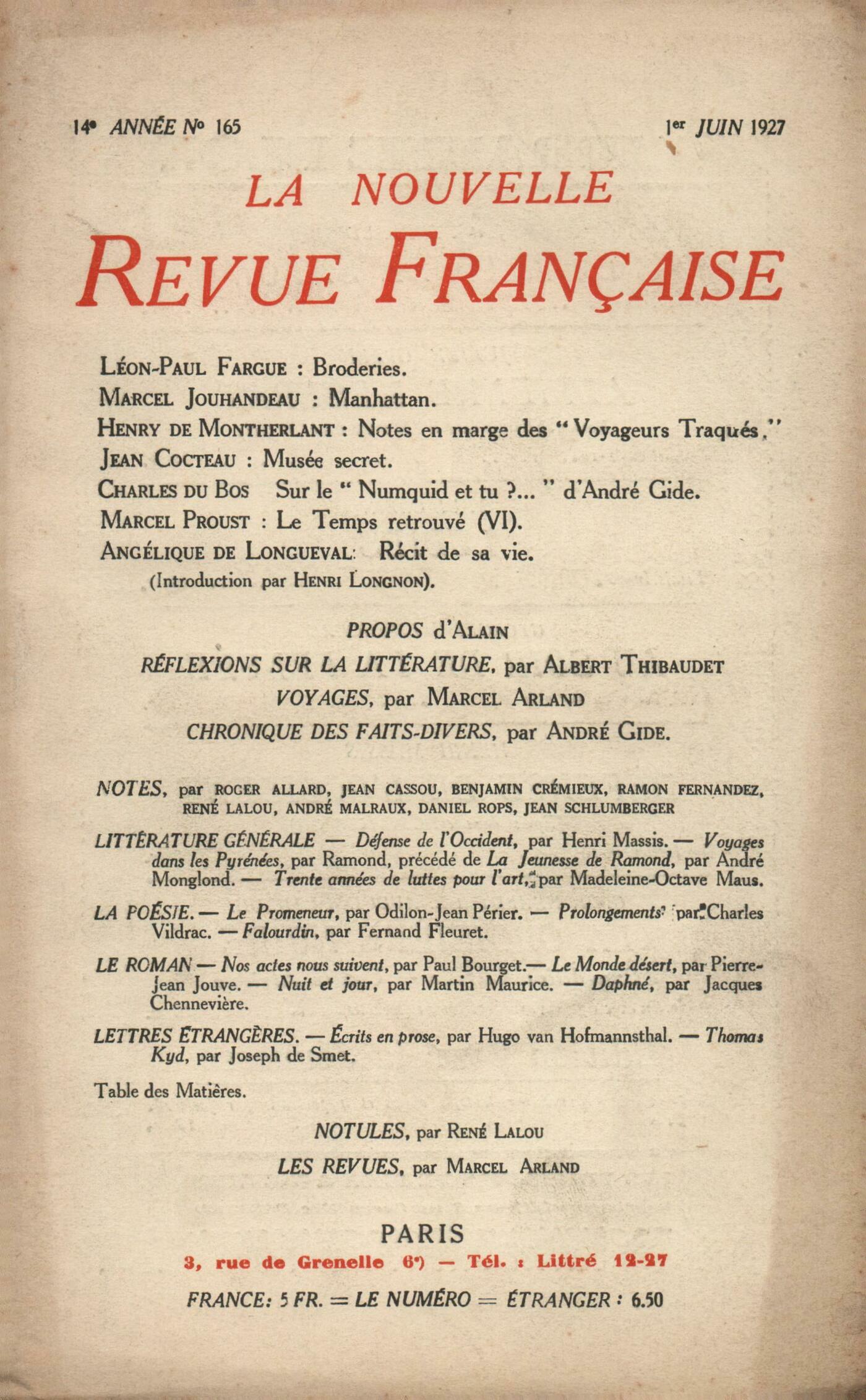 Léon-Paul Fargue, BroderiesMarcel Jouhandeau, ManhattanHenry de Montherlant, Notes en marge des Voyageurs TraquésJean Cocteau, Musée secretCharles Du Bos, Sur le Numquid et Tu?... d'André GideMarcel Proust, Le Temps retrouvé (VI)Angélique de Longueval, Récit de sa vie Alain, ProposRéflexions sur la littérature : Albert Thibaudet, Le Quartier des PhilosophesMarcel Arland, VoyagesAndré Gide, Faits-diversNotes : littérature générale : André Malraux, Défense de l'Occident, par Henri Massis (Plon) Daniel-Rops, Voyage dans les Pyrénées, par Ramond (Lardanchet)Jean Schlumberger, Trente années de luttes pour l'art, par Madeleine-Octave Maus (Librairie de l'Oiseau Bleu)Notes : le promeneur : Jean Cassou, Le Promeneur, par Odilon-Jean Périer (Éditions de la N. R. F.) - Prolongements, par Charles Vildrac (L'Horloge)Roger Allard, Falourdin, par Fernand Fleuret (Éditions de la N. R. F.)Notes : le roman : Ramon Fernandez, Nos actes nous suivent, par Paul Bourget (Plon) - Le Monde Désert, par Pierre Jean Jouve (Éditions de la N. R. F.)Benjamin Crémieux, Nuit et Jour, par Martin Maurice (Éditions de la N. R. F.)Jean Cassou, Daphné, par Jacques Chenevičre (Kra)Notes : lettres étrangčres : Jean Cassou, Écrits en prose, par Hugo von Hofmannsthal (Schiffrin)René Lalou, Thomas Kyd, l'homme, l'uvre, le milieu, par Joseph de Smet (Renaissance d'Occident) - NotulesLes revues : Marcel Arland, Écrits Anonymes, Mémento