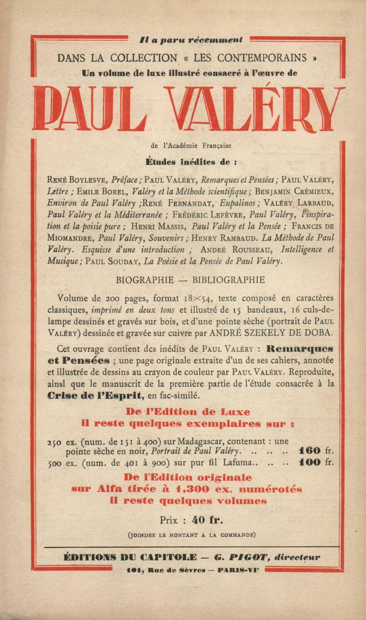 Julien Benda, La Trahison des Clercs (I)Luc Durtain, Počmes américainsErnest Hemingway, Cinquante mille dollarsSören Kierkegaard, IntermčdesMarcel Proust, Le Temps retrouvé (Suite) Alain, ProposRéflexions sur la littérature : Albert Thibaudet, La rareté et le dehorsBoris de Schlzer, Chronique musicaleNotes : le roman : Benjamin Crémieux, Églantine, par Jean Giraudoux (Grasset)René Lalou, Quarantičme Étage, par Luc Durtain (Éditions de la N. R. F.)André Malraux, Bouddha vivant, par Paul Morand (Grasset)Charles Du Bos, Les Harmonies Viennoises, par Jean Cassou (Émile-Paul)Pierre Bost, ... Selon Saint-Jean, par Pierre Dominique (Grasset)Notes : lettres étrangčres : Félix Bertaux, Chez nos voisins, par André Germain (Rieder)Marcel Arland, Le Jardin des Pivoines (Au Sans Pareil)Notes : les arts : André Lhote, Dessins et gouaches de Roger de La FresnayeAndré Gide, Faits-diversRené Lalou, Notules Anonymes, MémentoAndré Rouveyre, Une lettre
