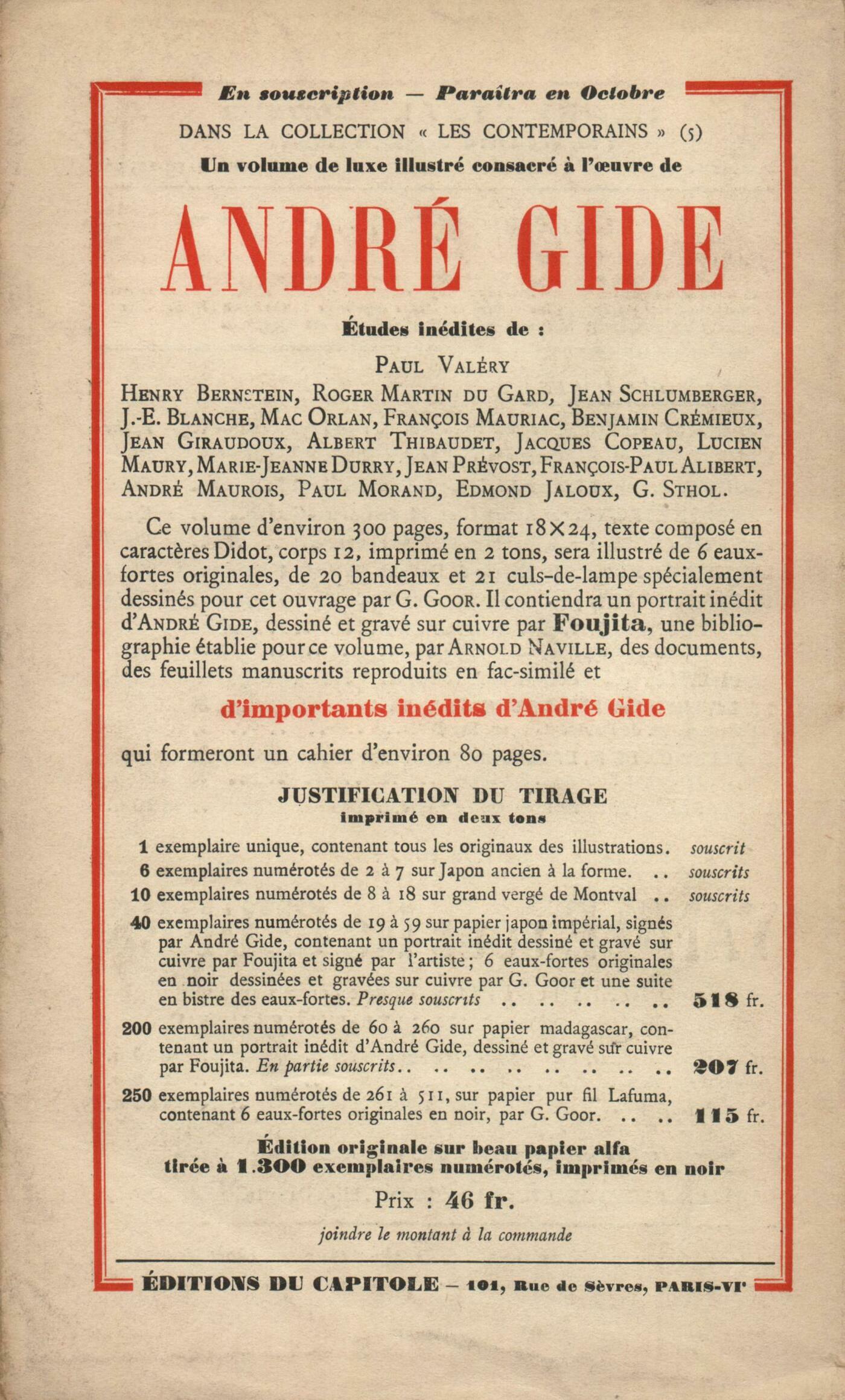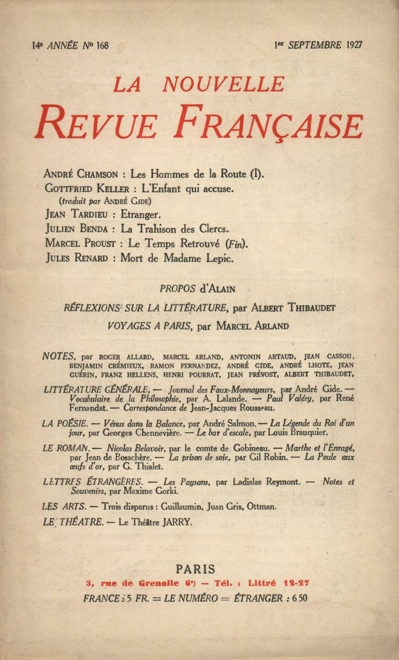 André Chamson, Les Hommes de la Route (I)Gottfried Keller, L'enfant qui accuseJean Tardieu, Étranger Couple en marche PoursuiteJulien Benda, La Trahison des Clercs (II)Marcel Proust, Le Temps retrouvé (Fin)Jules Renard, Mort de Madame Lepic Alain, ProposRéflexions sur la littérature : Albert Thibaudet, Le style du voyageMarcel Arland, Voyages ŕ ParisNotes : littérature générale : Albert Thibaudet, Journal des Faux-Monnayeurs, d'André Gide (Éditions de la N. R. F.)Ramon Fernandez, Vocabulaire technique et critique de la philosophie, par André Lalande (Alcan)Albert Thibaudet, Paul Valéry, par René Fernandat (Au Pigeonnier)Jean Prévost, Correspondance générale, V, VI, VII, de Jean-Jacques Rousseau (Armand Colin)Notes : la poésie : Roger Allard, Vénus dans la balance, par André Salmon (Éditions des Quatre-Chemins) - Métamorphoses de la harpe et du harpiste, par André Salmon (Éditions des Cahiers libres)Jean Cassou, La Légende du roi d'un jour, par Georges Chennevičre (Éditions de la N. R. F.) - Le Bar d'escale, par Louis Brauquier (Le Feu)Notes : le roman : Ramon Fernandez, Nicolas Belavoir, par le comte de Gobineau (Éditions de la N. R. F.)Antonin Artaud, Marthe et l'Enragé, par Jean de Bosschčre (Émile-Paul)Benjamin Crémieux, La Prison de soie, par Gil Robin (Émile-Paul)Franz Hellens, La Poule aux ufs d'or, par Georges Thialet (Émile-Paul)Notes : lettres étrangčres : Henri Pourrat, Les Paysans, par Ladislas Reymont (Payot)Marcel Arland, Notes et Souvenirs, par Maxime Gorki (Calmann-Lévy)Notes : les arts : André Lhote, Trois disparus : Guillaumin, Ottman, Juan GrisNotes : le théâtre : Jean Guérin, Le Théâtre JarryAndré Gide, Faits-diversNotules : Jean Guérin, Un homme au Zoo, par David Garnett (Grasset) - Hé, Vivant!, par Gaston Roupnel (Stock) - Sainte Monique, par Ambroise Vollard (Émile-Paul) - Volontés de l'art moderne, par Jean Goudal (Rieder) Daniel-Rops, Connaissez mieux le cur des femmes, par Pierre Girard (Kra)Jean Guérin, Mémento
