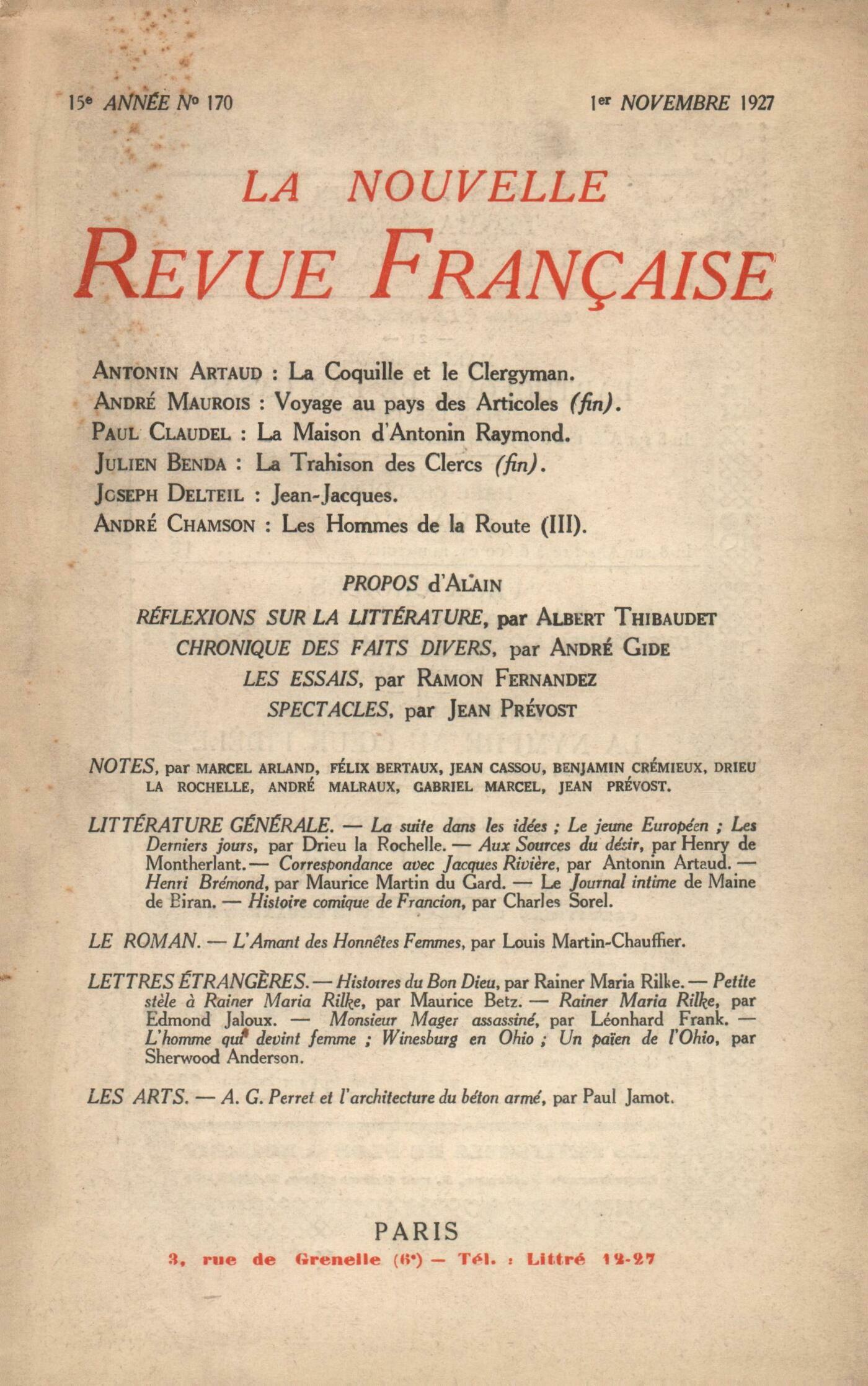 Antonin Artaud, La Coquille et le ClergymanAndré Maurois, Voyage au pays des Articoles (Fin)Paul Claudel, La Maison d'Antonin Raymond ŕ TokyoJulien Benda, La Trahison des Clercs (Fin)Joseph Delteil, Jean-JacquesAndré Chamson, Les Hommes de la Route (III) Alain, ProposRéflexions sur la littérature : Albert Thibaudet, Au pays de la biographie romancéeLes essais : Ramon Fernandez, G. K. ChestertonSpectacles : Jean Prévost, Oů voir l'homme?André Gide, Faits-diversNotes : littérature générale : Benjamin Crémieux, La Suite dans les Idées, par Pierre Drieu la Rochelle (Au Sans Pareil) - Le Jeune Européen, par Pierre Drieu la Rochelle (Éditions de la N. R. F.) - Les Derniers Jours, par Pierre Drieu la RochellePierre Drieu la Rochelle, Aux Fontaines du Désir, par Henry de Montherlant (Bernard Grasset)Marcel Arland, Correspondance avec Jacques Rivičre, par Antonin Artaud (Éditions de la N. R. F.)Jean Cassou, Henri Brémond, par Maurice Martin du Gard (Kra)Gabriel Marcel, Journal intime, par Maine de Biran (Plon)André Malraux, Histoire comique de Francion, par Charles Sorel (J. Fort)Notes : le roman : Henri Rambaud, L'Amant des honnętes femmes, par Louis Martin-Chauffier (Éditions de la N. R. F.)Notes : littérature générale : Félix Bertaux, Histoires du bon Dieu, par Rainer Maria Rilke (Émile-Paul) - Rainer Maria Rilke, par Edmond Jaloux (Émile-Paul) - Petite Stčle pour R. M. Rilke, par Maurice Betz (Heissler) - Monsieur Mager assassiné, par Leonhard Frank (Rieder)Benjamin Crémieux, L'Homme qui devint femme, par Sherwood Anderson (Cahiers du mois) - Winesburg-en-Ohio, par Sherwood Anderson (Éditions de la N. R. F.) - Un paďen de l'Ohio, par Sherwood Anderson (Rieder)Notes : les arts : Jean Prévost, A. G. Perret et l'architecture du béton armé, par Paul Jamot (Vanoest)Les revues : André Gide, La détresse du Congo Anonymes, MémentoJean Paulhan, Correspondance