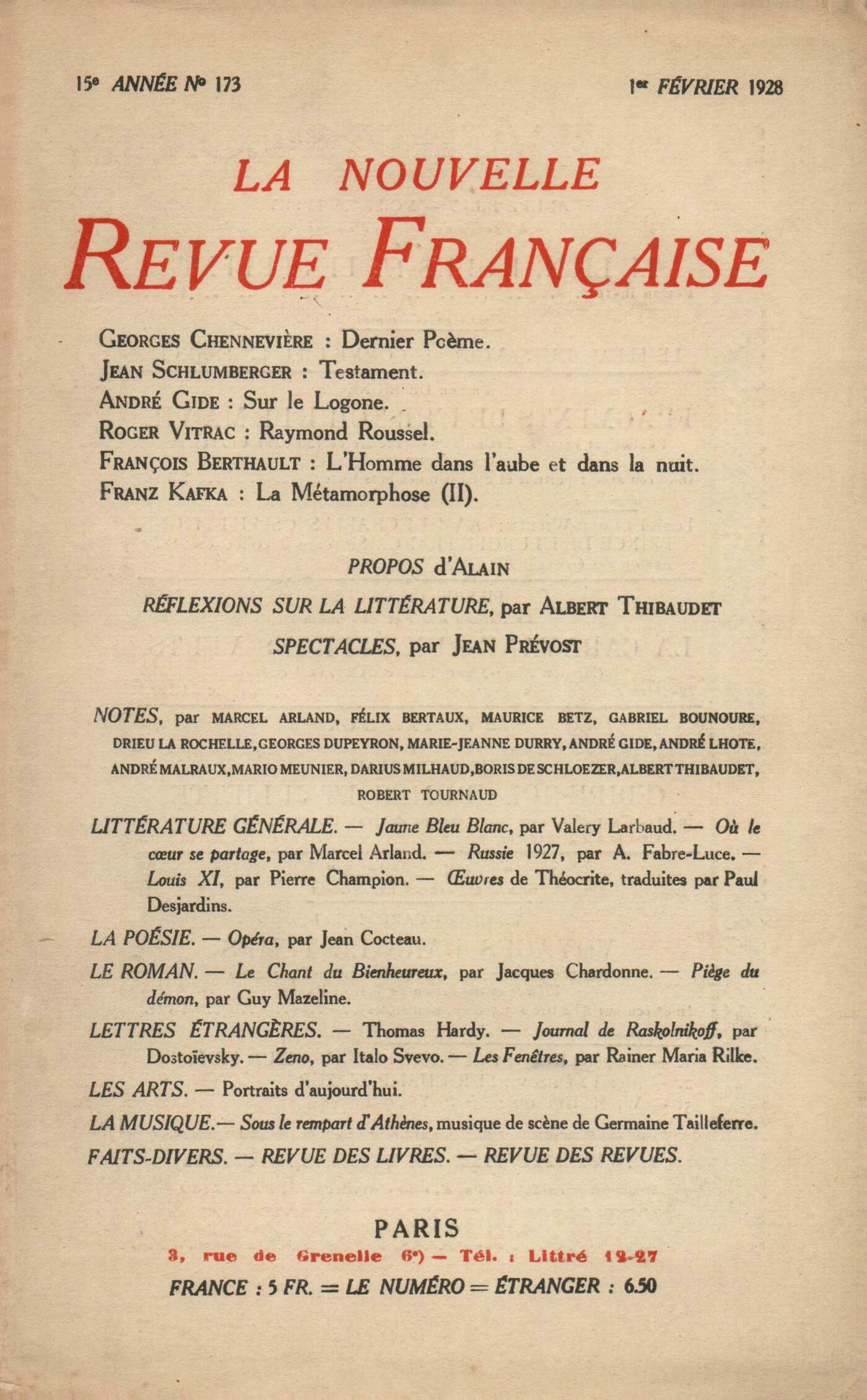 Georges Chennevičre, Dernier PočmeJean Schlumberger, TestamentRoger Vitrac, Raymond RousselAndré Gide, Sur le Logone (II)François Berthault, L'homme dans l'aube et dans la nuitFranz Kafka, La Métamorphose (II) Alain, ProposRéflexions sur la littérature : Albert Thibaudet, Sur la poésieJean Prévost, SpectaclesNotes : littérature générale : Robert Tournaud, Jaune Bleu Blanc, par Valery Larbaud (Éditions de la N. R. F.)André Malraux, Oů le cur se partage, par Marcel Arland (Éditions de la N. R. F.)Pierre Drieu la Rochelle, Russie 1927, par Alfred Fabre-Luce (Bernard Grasset)Albert Thibaudet, Louis XI, par Pierre Champion (Champion)Mario Meunier, uvres, de Théocrite (Éditions de la Pléiade)Notes : la poésie : Gabriel Bounoure, Opéra, de Jean Cocteau (Stock)Notes : le roman : Georges Dupeyron, Le Chant du Bienheureux, par Jacques Chardonne (Stock)Marcel Arland, Pičge du démon, par Guy Mazeline (Éditions de la N. R. F.)Notes : lettres étrangčres : Marcel Arland, Thomas HardyBoris de Schlzer, Journal de Raskolnikoff, par Dostoďevsky (Les Cahiers libres)Marie-Jeanne Durry, Zeno, par Italo Svevo (Éditions de la N. R. F.)Maurice Betz, Les Fenętres, par Rainer Maria Rilke (Librairie de France)Notes : les arts : André Lhote, Portraits d'aujourd'huiNotes : la musique : Darius Milhaud, Sous le Rempart d'Athčnes, de Germaine Tailleferre (musique de scčne)André Gide, Faits-diversRevue des livres : Ramon Fernandez, Pourquoi Rome a parlé (Éditions Spes) - L'Évangile Éternel, par Jean Guéhenno (Grasset)Jean Prévost, Itinéraire de Paris ŕ Buenos-Ayres, par J. J. Brousson (Crčs) Daniel-Rops, Le Quai des Brumes, par Pierre Mac Orlan (N. R. F.)Marcel Arland, Escale, par Pierre Humbourg (N. R. F.) - Psyché, par Pierre LoüysGeorges Dupeyron, Le dîner chez Olga, par René Laporte (Grasset)Marcel Arland, Frčres, par René Jouglet (Grasset) - Vie en commun, par Léon Duesberg (Sélection)Benjamin Crémieux, Carte d'Europe, par Daniel-Rops (Perrin)Marcel Arland, Lettre recommandée, par Eyvind Johnson (Kra)Jean Cassou, Sonates de printemps et d'été, par Ramon del Valle-Inclan (Éditions de France)Benjamin Crémieux, Vision de l'Anahuac, par Alfonso Reyes (N. R. F.)Jean Schlumberger, La Porte, par Natsume Soseki (Rieder)Revue des revues : Jean Guérin, ŤDu malaise mondialť - Premier Livret - Restauration de la Raison - [Mémento]