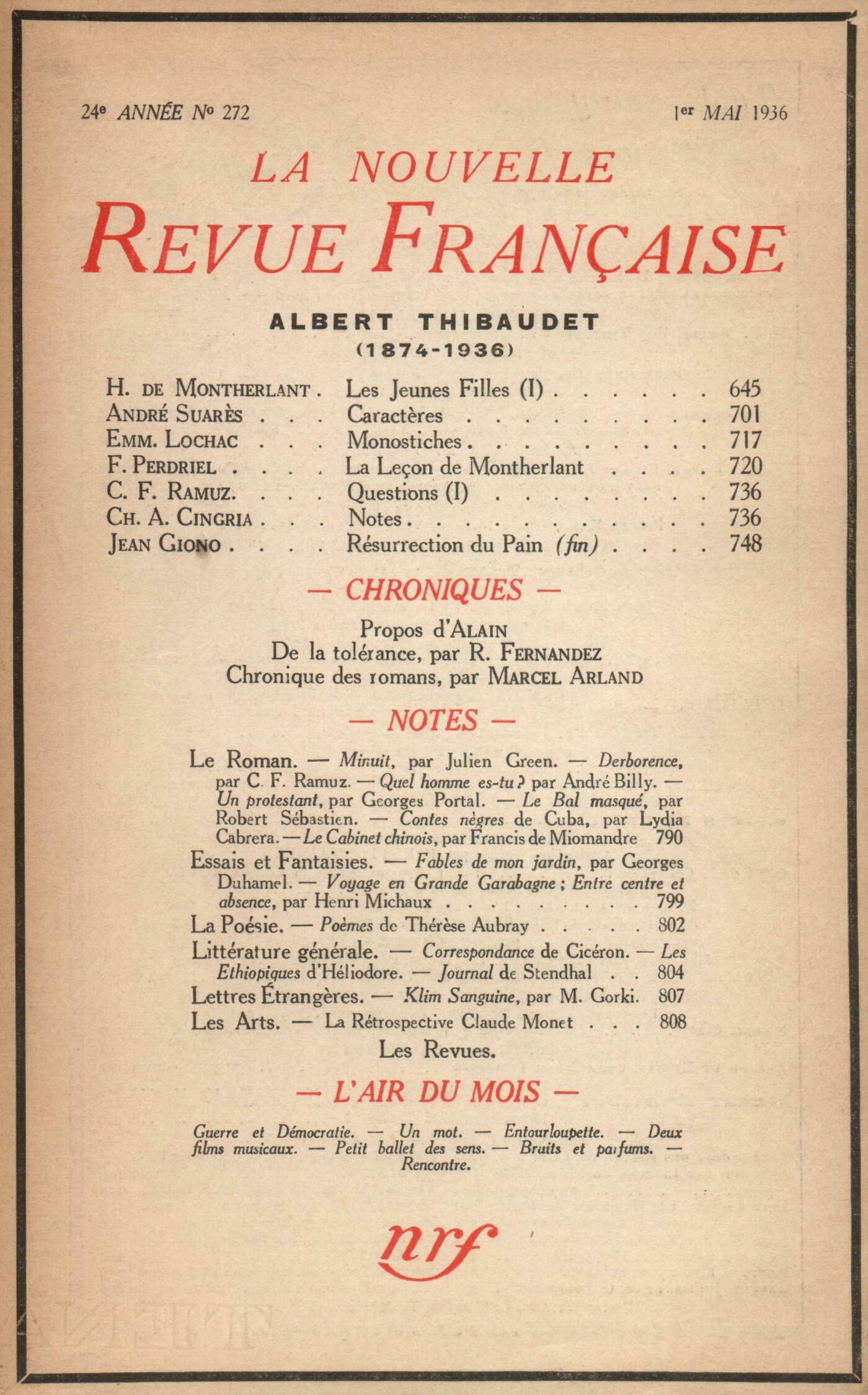 Léon Bopp, Derniers jours d'Albert ThibaudetHenry de Montherlant, Les Jeunes Filles (I)André Suarčs, CaractčresEmmanuel Lochac, MonostichesFernand Perdriel, La leçon de MontherlantCharles-Ferdinand Ramuz, Questions (I)Charles-Albert Cingria, Notes [aux Questions de C. F. Ramuz]Jean Giono, Résurrection du Pain (Fin) Alain, ProposRamon Fernandez, De la toléranceChronique des romans : Marcel Arland, Minuit, par Julien Green - Derborence, par C. F. Ramuz - Quel homme es-tu?, par André Billy - Un Protestant, par Georges PortalNotes : romans et récits : Julien Lanoë, Le Bal Masqué, par Robert Sébastien (Gallimard)Émilie Noulet, Contes nčgres de Cuba, par Lydia Cabrera (Gallimard) - Le Cabinet chinois, par Francis de Miomandre (Gallimard)Notes : essais et fantaisies : René Daumal, Fables de mon jardin, par Georges Duhamel (Mercure de France)A. Rolland de Renéville, Voyage en Grande Garabagne, par Henri Michaux (Gallimard) - Entre centre et absence, par Henri Michaux (Matarasso)Notes : la poésie : Jean Wahl, Battements, par Thérčse Aubray (Cahiers Libres) - Je viens en fraude, par Thérčse Aubray (Corréa) - Derričre la nuit, par Thérčse Aubray (Éditions G. L. M.)Notes : littérature générale : Marie Delcourt, Correspondance, I, II, de Cicéron (Belles-Lettres) - Les Éthiopiques, d'Héliodore (Belles-Lettres)Jean Prévost, Journal, I, II, de Stendhal (Éditions de la N. R. F.) - Courrier anglais, IV, V, de Stendhal (Éditions du Divan)Notes : lettres étrangčres : Henri Calet, Vie de Klim Samguine, I, II, par Maxime Gorki (Rieder)Notes : les arts : André Lhote, Rétrospective Claude MonetLes revues : René-Jean Clot, Les Amoureuses infirmesJean Guérin, La revue HermčsCorrespondance : Georges Bourdon, Lettre ŕ Léon-Paul FargueLouis-François Auphan, Lettre ŕ Georges BourdonL'air du mois : Julien Benda, Guerre et démocratieLéon-Paul Fargue, Un motAndré Arnyvelde, EntourloupetteBoris de Schlzer, Deux films musicauxTristan Derčme, Les Propos de M. Polyphčme Durand : Petit ballet des sensJacques Delamain, Bruits et parfumsHenri Pourrat, Rencontre