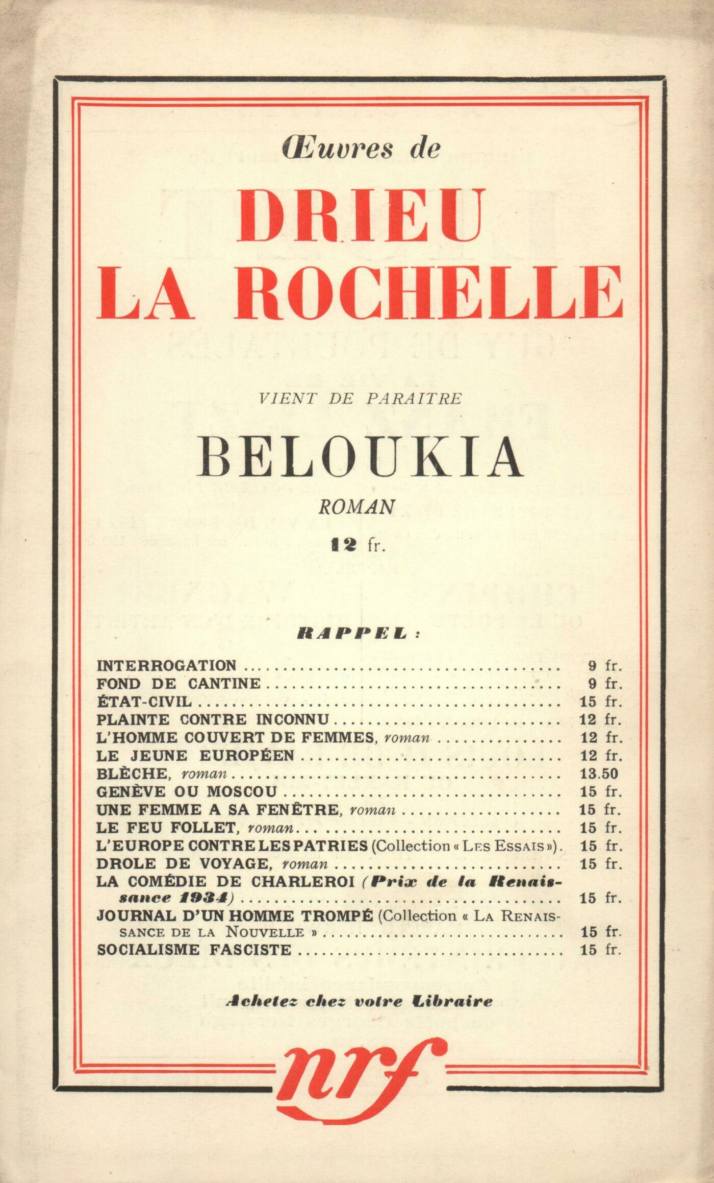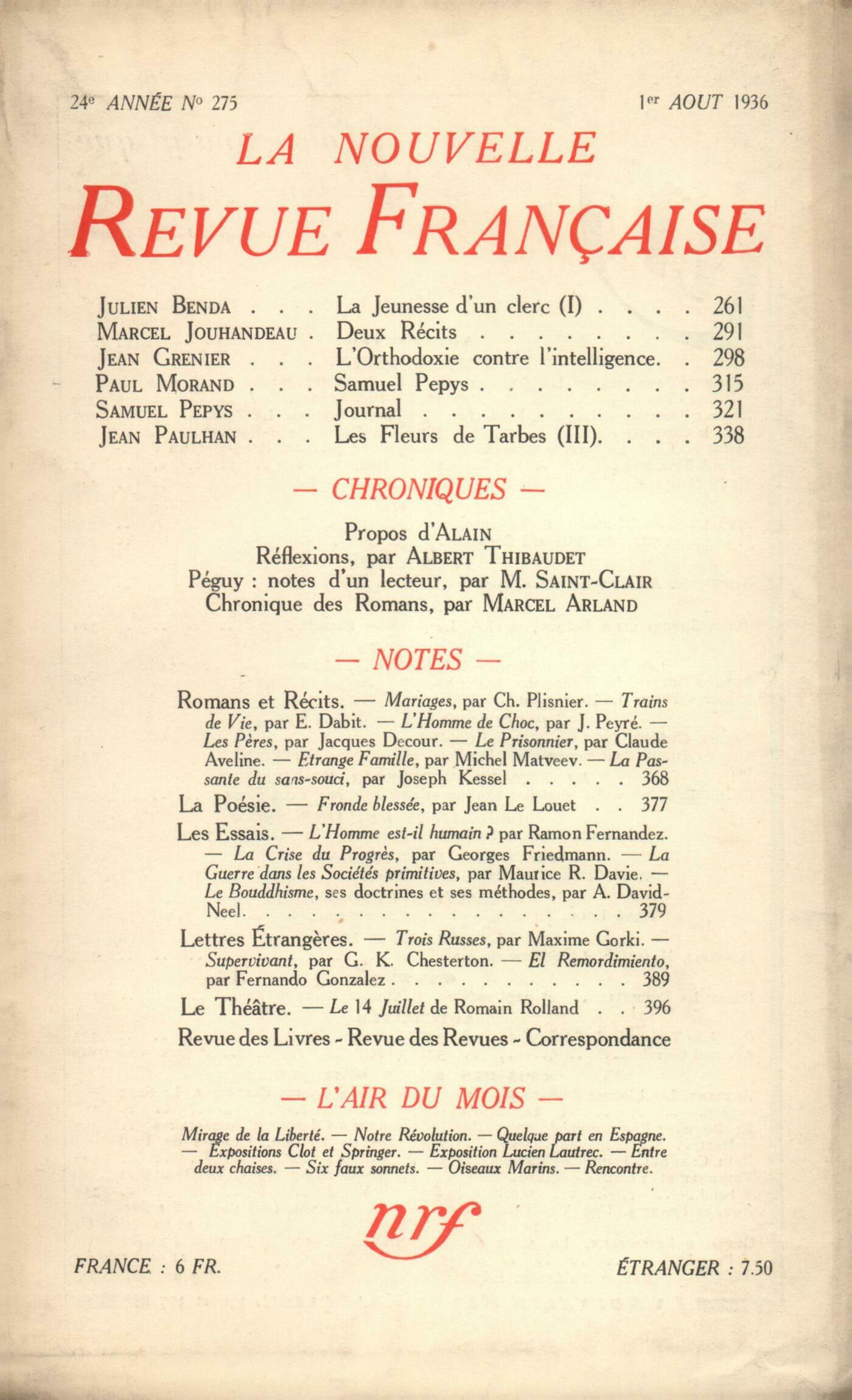 Julien Benda, La Jeunesse d'un clerc (I)Marcel Jouhandeau, Deux récits : Le tapis rouge Le litJean Grenier, L'orthodoxie contre l'intelligencePaul Morand, Samuel PepysSamuel Pepys, JournalJean Paulhan, Les Fleurs de Tarbes ou La Terreur dans les Lettres Alain, ProposRéflexions : Albert Thibaudet, Aux origines de l'HistoireM. Saint-Clair, PéguyChronique des romans : Marcel Arland, Mariages, par Charles Plisnier - Trains de vie, par Eugčne Dabit - L'homme de choc, par Joseph Peyré - Les pčres, par Jacques Decour - Le prisonnier, par Claude AvelineNotes : récits et romans : Henri Calet, Étrange famille, part Michel Matveev (Éditions de la N. R. F.)Louis Francis, La Passante du Sans-Souci, par Joseph Kessel (Éditions de la N. R. F.)Notes : la poésie : Gabriel Bounoure, Fronde blessée, par Jean Le Louët (José Corti)Notes : les essais : Jean Schlumberger, L'homme est-il humain ?, par Ramon Fernandez (Éditions de la N. R. F.)Henri Lefebvre, La crise du progrčs, par Georges Friedmann (N. R. F.)Roger Caillois, La guerre dans les sociétés primitives, par Maurice R. Davie (Payot)René Daumal, Le bouddhisme, ses doctrines et ses méthodes, par Alexandra David-Neel (Plon)Notes : lettres étrangčres : Julien Lanoë, Trois Russes, par Maxime Gorki (Éditions de la N. R. F.)Ramon Fernandez, Supervivant, par G. K. Chesterton (Desclée de Brouwer)Auguste Bréal, El Remordimiento, par Fernando Gonzalez (Arturo Zapata, Manizales, Colombie)Notes : le théâtre : Maurice Savin, Le 14 Juillet, de Romain Rolland (Maison de la culture de l'Alhambra)Revue des livres : Jean Wahl, En quęte d'une philosophie, par D. Parodi (Alcan) Étiemble, La construction de l'homme, par Pierre Mabille (Jean Flory) - L'inégalité humaine devant la mort et la maladie, par le Dr Pierreville (Éditions Fastier)Jean Guérin, Manuel pratique d'illusionisme et de prestidigitation, I, par Rémi Ceillier (Payot)Revue des revues : Paul Valéry, Définition du Symbolisme Anonymes, InquisitionsJean Wahl, Acéphale Anonymes, Mémento des revuesCorrespondance : Jacques-Émile Blanche, Une lettreL'air du mois : Julien Benda, Mirage de la libertéRené Daumal, Notre révolutionLuc Durtain, Quelque part en EspagneAndré Lhote, Exposition R.-J. Clot-SpringerMarc Bernard, Exposition Lucien LautrecRené Daumal, Entre deux chaisesTristan Derčme, Les propos de M. Polyphčme Durand : Six faux sonnetsJacques Delamain, Oiseaux marinsHenri Pourrat, Rencontre