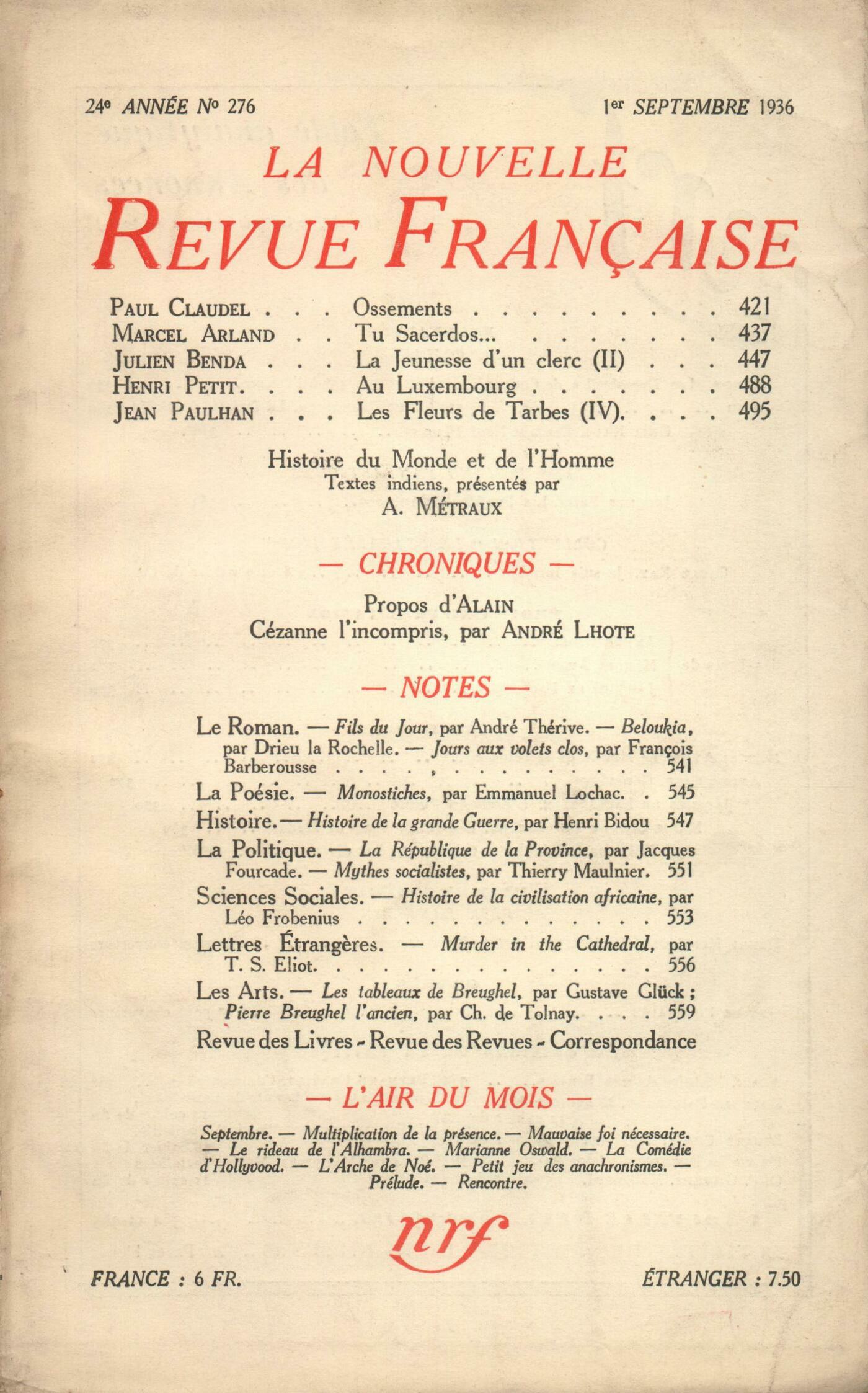 Paul Claudel, OssementsMarcel Arland, Tu Sacerdos...Julien Benda, La Jeunesse d'un clerc (II)Henri Petit, Au LuxembourgJean Paulhan, Les Fleurs de Trabes ou La Terreur dans les Lettres (IV)Alfred Métraux, Introduction ŕ Histoire du monde et de l'homme Anonymes, Histoire du monde et de l'homme (Textes indiens de l'Argentine)Chroniques : Alain, ProposAndré Lhote, Cézanne l'incomprisNotes : le roman : André Lhote, Le Baron GrosMarcel Arland, Fils du jour, par André Thérive (Grasset)Jean Vandal, Beloukia, par Pierre Drieu la Rochelle (Éditions de la N. R. F.)Marcel Arland, Les jours aux volets clos, par François Barberousse (Gallimard)Notes : la poésie : Georges Lafourcade, Monostiches, par Emmanuel Lochac (Marsyas)Notes : histoire : Benjamin Crémieux, Histoire de la Grande Guerre, par Henry Bidou (Gallimard)Notes : politique : Léon-Paul Fargue, La République de la Province, par Jacques Fourcade (Grasset)Jean Grenier, Mythes socialistes, par Thierry Maulnier (Gallimard)Notes : sciences sociales : René Daumal, Histoire de la civilisation africaine, par Léo Frobenius (Éditions de la N. R. F.)Notes : lettres étrangčres : Henri Fluchčre, Murder in the Cathedral, par T. S. Eliot (Faber et Faber)Notes : les arts : Marcel Arland, Les tableaux de Breughel, par Gustave Glück (Éditions A. Schroll) - Pierre Breughel l'Ancien, par Charles de Tolnay (Nouvelle Société d'Éditions)Revue des livres : Jean Wahl, Métro de la mort, par Ivan Goll (Cahiers du Journal des Počtes) - Chansons malaises, par Ivan Goll (Éditions Poésie) - La Chanson de Jean Sans Terre, par Ivan Goll (Éditions Poésie)Jacques Debű-Bridel, Race de Calvin, par Philippe Amiguet (Albin Michel)Denis Marion, Histoires de fantômes anglais (N. R. F.) - L'Amazone fugitive, par D. H. Lawrence (Stock)Eugčne Dabit, Sur toute la Terre, par John Dos Passos (Gallimard)Jacques Decour, Fascisme et grand capital, par Daniel Guérin (N. R. F.) - Technique et poésie de la montagne, par Philippe Amiguet (Grasset)Revue des revues : Jacques Audiberti, Martyrs Anonymes, Cahiers G. L. M., I et IIJean Guérin, HermčsCorrespondance : André Lhote, Une lettreL'air du mois : Marthe Boidin, SeptembreClaude Mauriac, Multiplication de la présenceJulien Benda, Mauvaise foi nécessaireJean Labasque, Le rideau de l'AlhambraJean Cassou, Marianne OswaldDenis Marion, La comédie d'HollywoodEugčne Dabit, L'Arche de Noé ŕ la Galerie BillietTristan Derčme, Les propos de M. Polyphčme Durand : Petit jeu des anachronismesJacques Delamain, PréludeHenri Pourrat, Rencontre