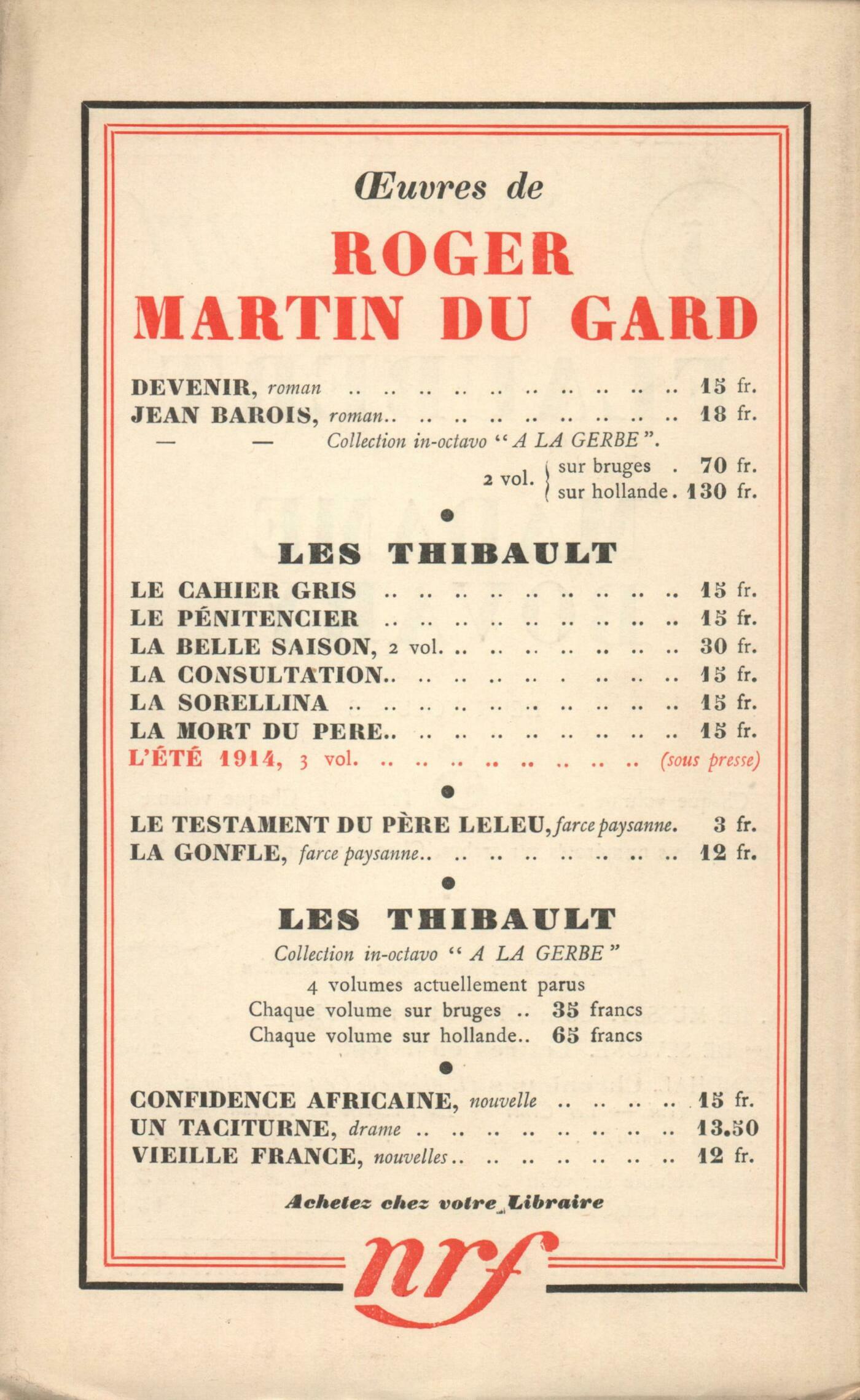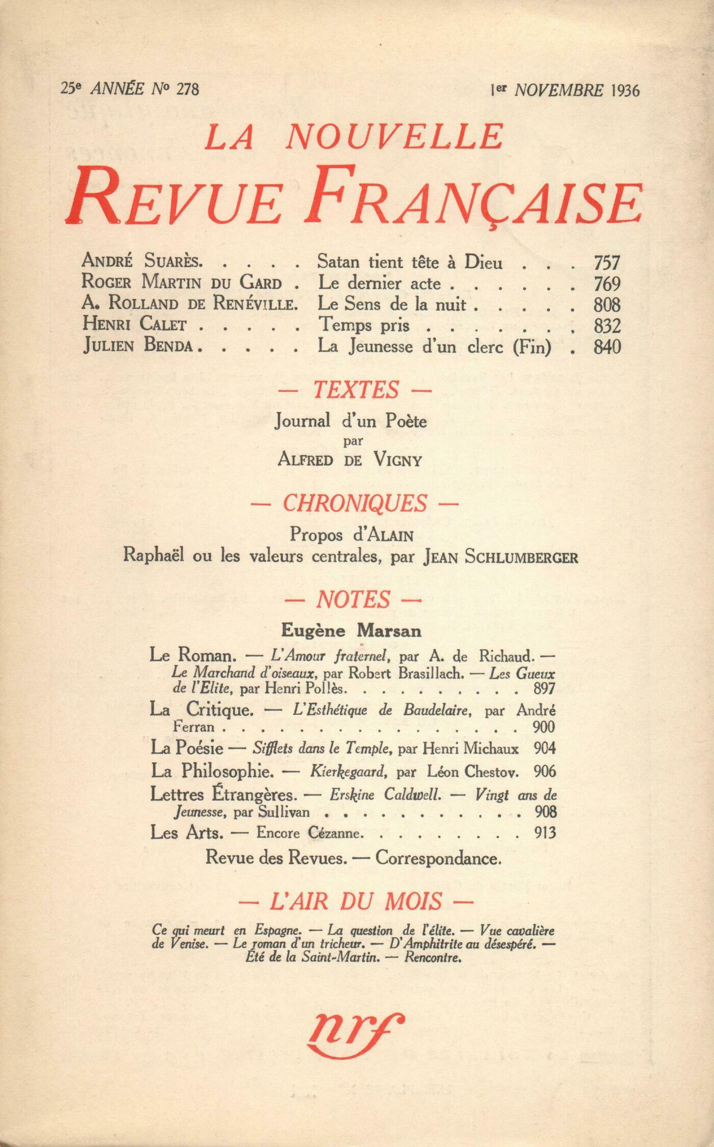 André Suarčs, Deux počmes : Satan tient tęte ŕ Dieu Shir NagaRoger Martin du Gard, Le dernier acteA. Rolland de Renéville, Le Sens de la nuitHenri Calet, Temps prisJulien Benda, La Jeunesse d'un clerc (Fin)Alfred de Vigny, Nouveaux fragments inédits du Journal d'un počteChroniques : Alain, ProposJean Schlumberger, Raphaël ou Les valeurs centralesPierre Ličvre, MarsanNotes : romans et récits : Marcel Arland, L'Amour fraternel, par André de Richaud (Grasset) - Le marchand d'oiseaux, par Robert Brasillach (Plon)Jean Wahl, Les gueux de l'élite, par Henri Pollčs (Éditions de la N. R. F.)Notes : la critique : Roger Caillois, L'esthétique de Baudelaire, par André Ferran (Hachette)Notes : la poésie : A. Rolland de Renéville, Sifflets dans le Temple, par Henri Michaux (Éditions G. L. M.)Notes : la philosophie : Jean Grenier, Kierkegaard et la philosophie existentielle, par Léon Chestov (Les amis de Léon Chestov)Notes : lettres étrangčres : Maurice-Edgar Coindreau, Erskine CaldwellJean Prévost, Vingt ans de jeunesse, par Maurice O. Sullivan (Éditions de la N. R. F.)Notes : les arts : André Lhote, Encore CézanneRevue des revues : Ernest Hemingway - Katherine Mansfield, S'il faut écrire et pourquoiCorrespondance : André Gide, Lettre ŕ Lucien CombelleJacques de Lacretelle, Une lettreMarcel Thiébaut, Une lettreL'air du mois : Pierre Drieu la Rochelle, Ce qui meurt en EspagneJulien Benda, La question de l'éliteAdrienne Monnier, Vue cavaličre de VeniseDenis Marion, Le Roman d'un tricheur, de Sacha GuitryTristan Derčme, Les propos de M. Polyphčme Durand : D'Amphitrite au désespéréJacques Delamain, Été de la Saint-MartinHenri Pourrat, Rencontre