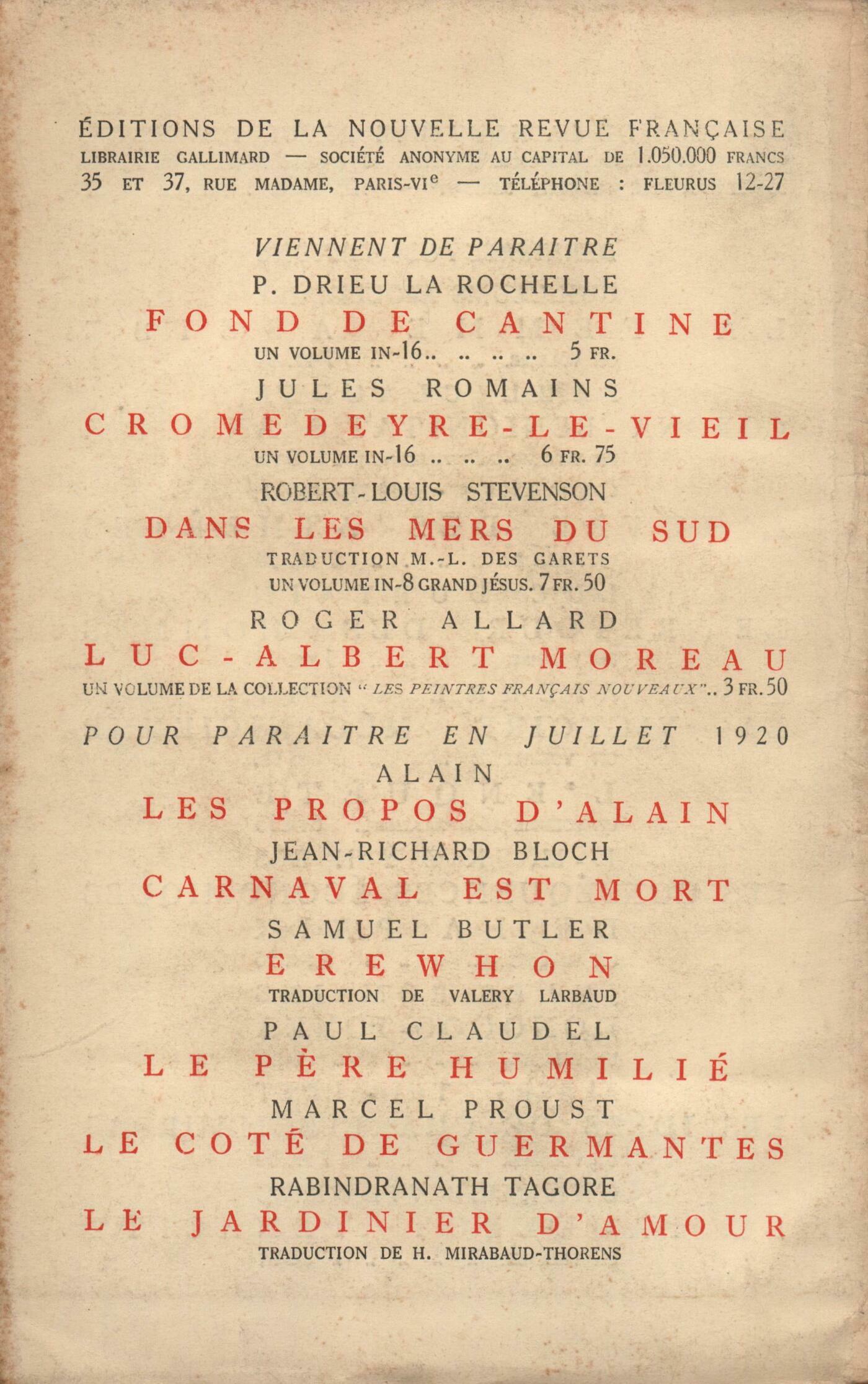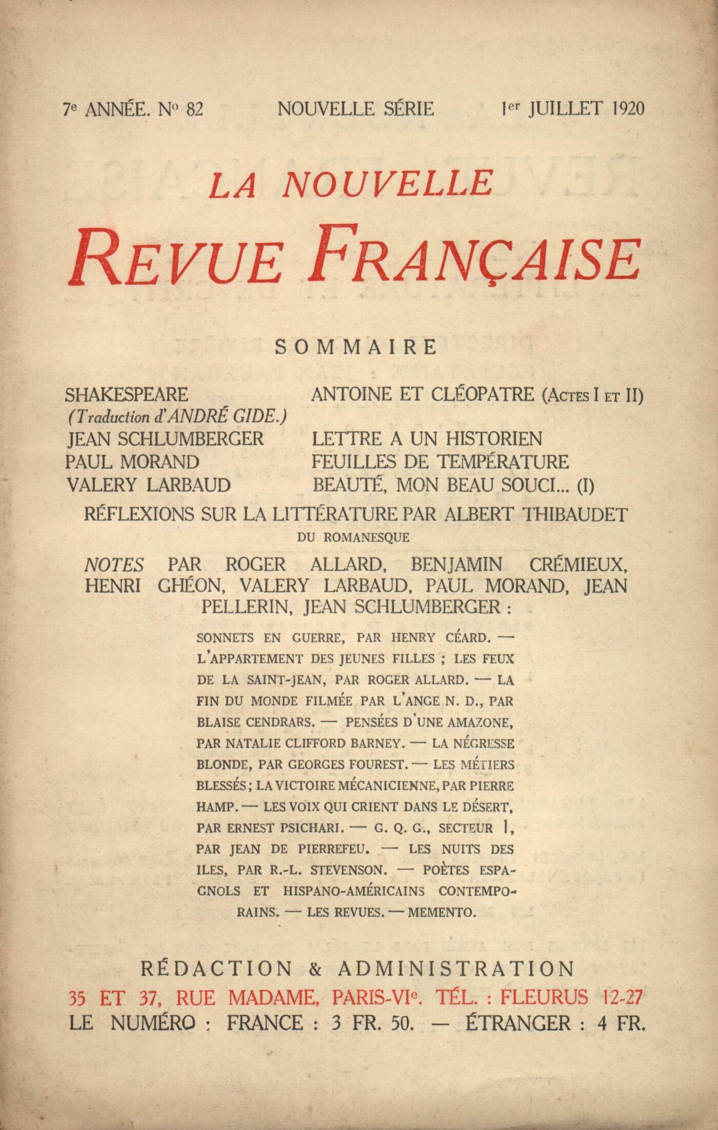William Shakespeare, Antoine et Cléopâtre (Actes I et II)Jean Schlumberger, Lettre ŕ un historienPaul Morand, Feuilles de températureValery Larbaud, Beauté, mon beau souci... (I)Réflexions sur la littérature : Albert Thibaudet, Du romanesqueNotes : Roger Allard, Sonnets en guerre, par Henry Céard (Librairie Française)Jean Pellerin, L'Appartement des Jeunes Filles, par Roger Allard (Camille Bloch) - Les Feux de la Saint-Jean, par Roger Allard (Camille Bloch)Paul Morand, La fin du monde, filmée par l'Ange N. D., par Blaise Cendrars (Éditions de la Sirčne)Roger Allard, Pensées d'une amazone, par Natalie Clifford Barney (Émile-Paul)Jean Pellerin, La négresse blonde, par Georges Fourest (La Connaissance)Benjamin Crémieux, Les Métiers blessés La Victoire mécanicienne, par Pierre Hamp (Nouvelle Revue Française)Henri Ghéon, Les voix qui crient dans le désert, par Ernest Psichari (Louis Conard)Roger Allard, G. Q. G. Secteur I, par Jean de Pierrefeu (L'Édition française illustrée)Jean Schlumberger, Les nuits des îles, par R.-L. Stevenson (L'Édition française illustrée)Valery Larbaud, Počtes espagnols et hispano-américains contemporainsRevues : Anonymes, Si la pensée moderne s'est suicidée - Počmes de Francis Reeves - Lettres inédites de Stendhal - Maurice Boissard et le théâtre - MémentoDivers : Anonymes, Mémento bibliographique