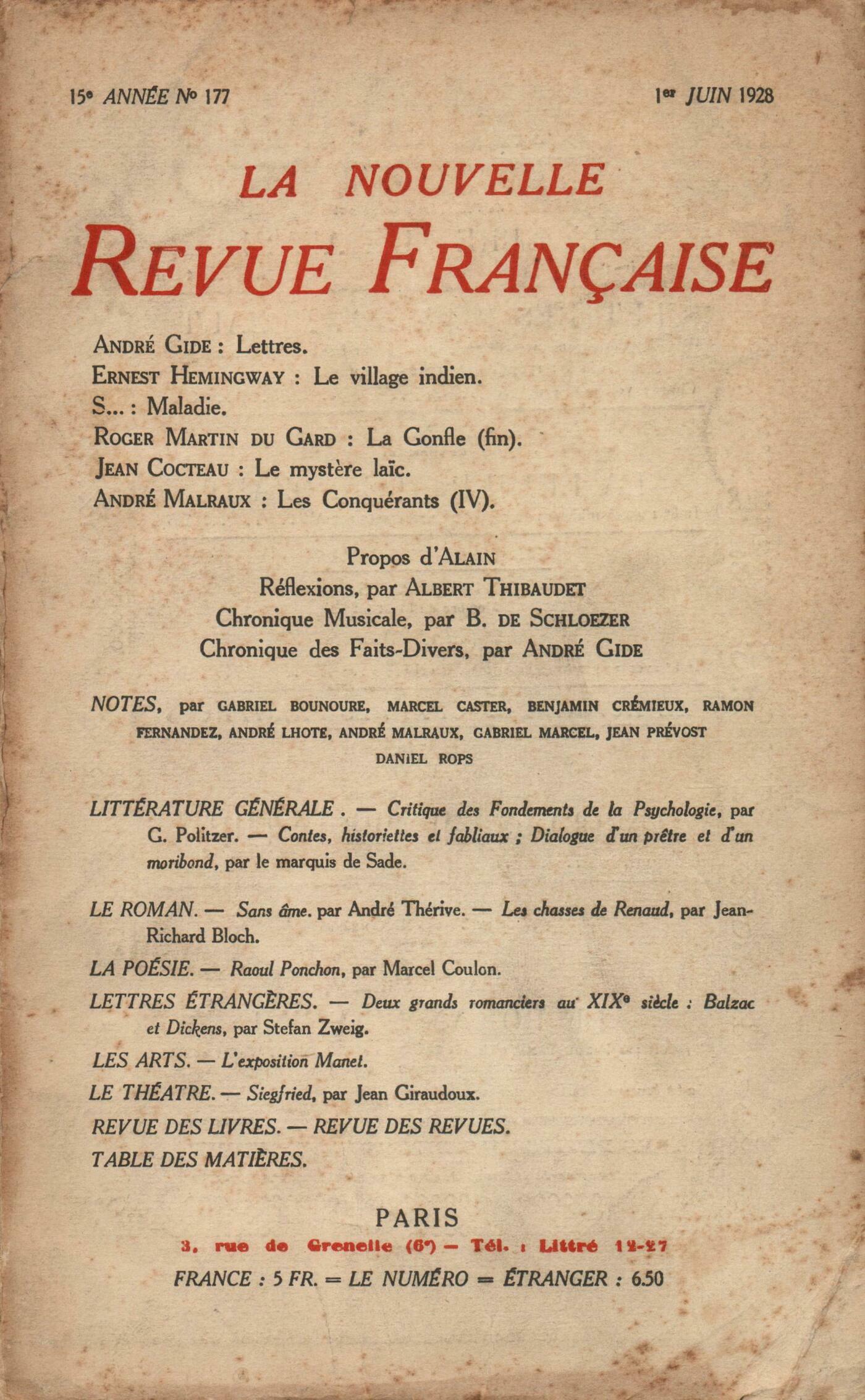 André Gide, LettresErnest Hemingway, Le village indienRoger Martin du Gard, La Gonfle (Fin) S..., MaladieJean Cocteau, Passages du Mystčre laďcAndré Malraux, Les Conquérants (IV) Alain, ProposRéflexions : Albert Thibaudet, Pour les Archives de La Trahison des Clercs (Dossier des Libres Propos) - Le Grand Bourgeois - Le Retour d'UbuBoris de Schlzer, Chronique musicaleAndré Gide, Faits-diversNotes : littérature générale : Gabriel Marcel, Critique des fondements de la psychologie, par G. Politzer (Rieder)André Malraux, Contes, historiettes et fabliaux, par le marquis de Sade (Kra) - Dialogue d'un Prętre et d'un Moribond, par le marquis de Sade (Stendhal et Cie)Notes : le roman : Marcel Caster, Sans âme, par André Thérive (Grasset)Jean Prévost, Les Chasses de Renaud, par Jean-Richard Bloch (Éditions de la N. R. F.)Notes : la poésie : Gabriel Bounoure, Raoul Ponchon, par Marcel Coulon (Grasset)Notes : lettres étrangčres : Ramon Fernandez, Deux grands romanciers du XIXe sičcle : Balzac - Dickens, par Stephan Zweig (Kra) Daniel-Rops, Fermentation, par Auguste Strindberg (Stock)Notes : les arts : André Lhote, Exposition ManetNotes : le théâtre : Benjamin Crémieux, Siegfried, de Jean Giraudoux (Comédie des Champs-Élysées)Revue des livres : Albert Thibaudet, Le livre de l'Esprit, par Gonzague Truc (Cahiers d'Occident) - Les Idées vivent, par Gonzague Truc (Nouvelle Revue Critique)Georges Dupeyron, La tęte, ma prison, par Maurice Courtois-Suffit (Au Sans Pareil)Benjamin Crémieux, Service de jour, par Henri Drouin (Grasset) - Donat vainqueur ou Les Panathénées du IIe arrondissement, par André Salmon (Delpeuch) - Le Prieur de Prouille, par Henri Duclos (Grasset)Georges Dupeyron, L'Altana ou La vie vénitienne, par Henri de Régnier (Mercure de France)Revue des revues : Anonymes, Histoires de plagiats - Opinions d'Anatole FranceJean Guérin, Mémento
