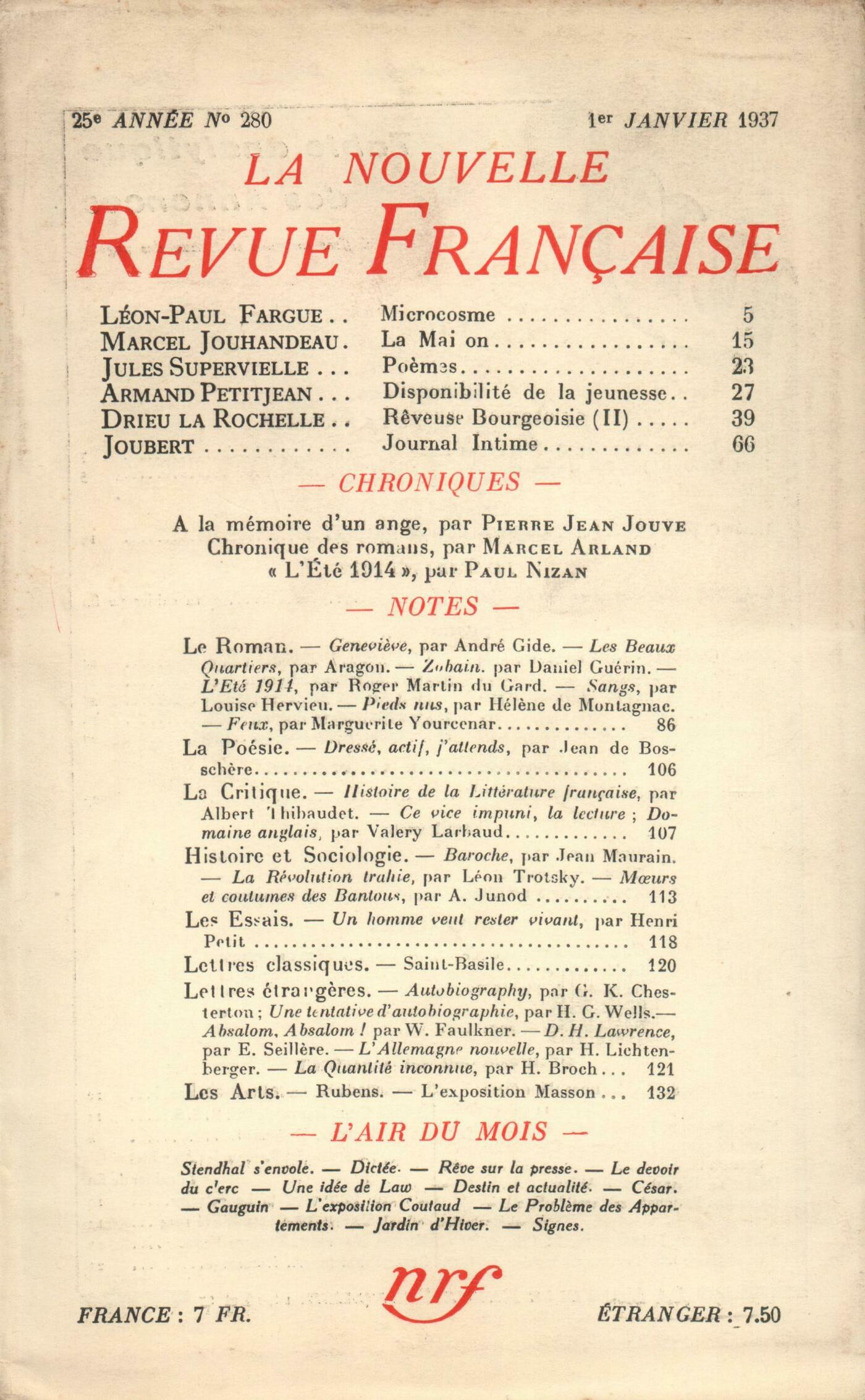 Léon-Paul Fargue, MicrocosmeMarcel Jouhandeau, La MaisonJules Supervielle, PočmesArmand-M. Petitjean, Disponibilité de la jeunesse française actuellePierre Drieu la Rochelle, Ręveuse Bourgeoisie (II)Joseph Joubert, Journal intime (extraits)Chronique musicale : Pierre Jean Jouve, Ŕ la mémoire d'un angeChronique des romans : Marcel Arland, Genevičve, par André Gide - Les Beaux Quartiers, par Louis Aragon - Zobain, par Raymond Guérin Chroniques : Paul Nizan, Roger Martin du Gard : Été 1914Benjamin Crémieux, Luigi PirandelloNotes : le roman : Marcel Arland, Sangs, par Louise Hervieu Léon-Paul Fargue, Pieds nus, par Hélčne de Montagnac Émilie Noulet, Feux, par Marguerite Yourcenar Notes : la critique : Benjamin Crémieux, Histoire de la littérature française de 1789 ŕ nos jours, par Albert Thibaudet Auguste Bréal, Ce vice impuni, la lecture : Domaine anglais, par Valery Larbaud Notes : histoire et sociologie : Julien Benda, Un bourgeois français au XIXe sičcle : Baroche, ministre de Napoléon III, par Jean Maurain Denis Marion, La révolution trahie, par Léon Trotsky Roger Caillois, Murs et coutumes des Bantous, I, II, par Henri A. Junod Notes : les essais : Jean Grenier, Un homme veut rester vivant, par Henri Petit Notes : lettres classiques : Marie Delcourt, Aux jeunes gens sur la maničre de tirer profit des Lettres helléniques, par Saint Basile Notes : lettres étrangčres : Ramon Fernandez, Une tentative d'autobiographie, par H. G. Wells - Autobiography, par G. K. ChestertonMaurice-Edgar Coindreau, Absalom, Absalom !, par William Faulkner Jacques Debű-Bridel, David Herbert Lawrence et les récentes idéologies allemandes, par Ernest Seillčre Félix Bertaux, L'Allemagne nouvelle, par Henri Lichtenberger Wladimir Weidlé, Die unbekannte Grsse, par Hermann Broch Notes : les arts : André Lhote, RubensMichel Leiris, ŤEspagne 1934-1936ť : exposition André Masson Revue des livres : Henri Pourrat, La terre est en sčve, par A. Druelle Marcel Arland, Jours de joie, par Jacques Christophe Mélot Du Dy, Connaissance du printemps, par Olivier Meurice Armand-M. Petitjean, L'activité primitive du moi, par Jean Nogué - Some Poems of Mallarmé, par Roger Fry et Charles Mauron Armand Lunel, Cézanne et Zola, par John Rewald André Lhote, Histoire de l'art contemporain, par René Huyghe - La peinture française au XIXe sičcle - Encyclopédie photographique de l'art - Les fresques de Pompéi - Les eaux-fortes de Rembrandt Revue des revues : Paul Valéry, Le počte et ses moyens d'existenceGabriel Marcel, Recherches philosophiques, VAnonymes, Mémento - ŤPeut-ętre Robert Brasillach et Thierry Maulnier forcent-ils un peu leur génie...ť Pierre Mauriac, Une lettre André Fraigneau, Stendhal s'envole Charles-Albert Cingria, Dictée Julien Benda, Ręve sur la presse - Le devoir du clerc -Tristesse d'Éleuthčre Denis de Rougemont, Une idée de Law Jean Grenier, Destin et actualité Denis Marion, César Marcel Arland, Exposition Gauguin Marc Bernard, Exposition Lucien Coutaud Tristan Derčme, Les propos de M. Polyphčme Durand : Problčme des appartements Jacques Delamain, Jardin d'hiver Jean Paulhan, Signes de janvier