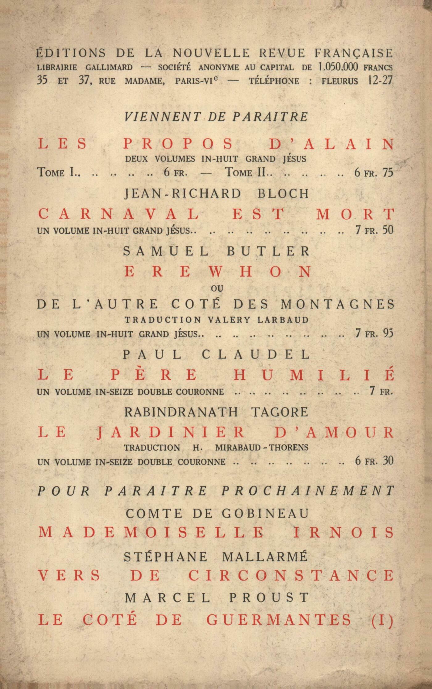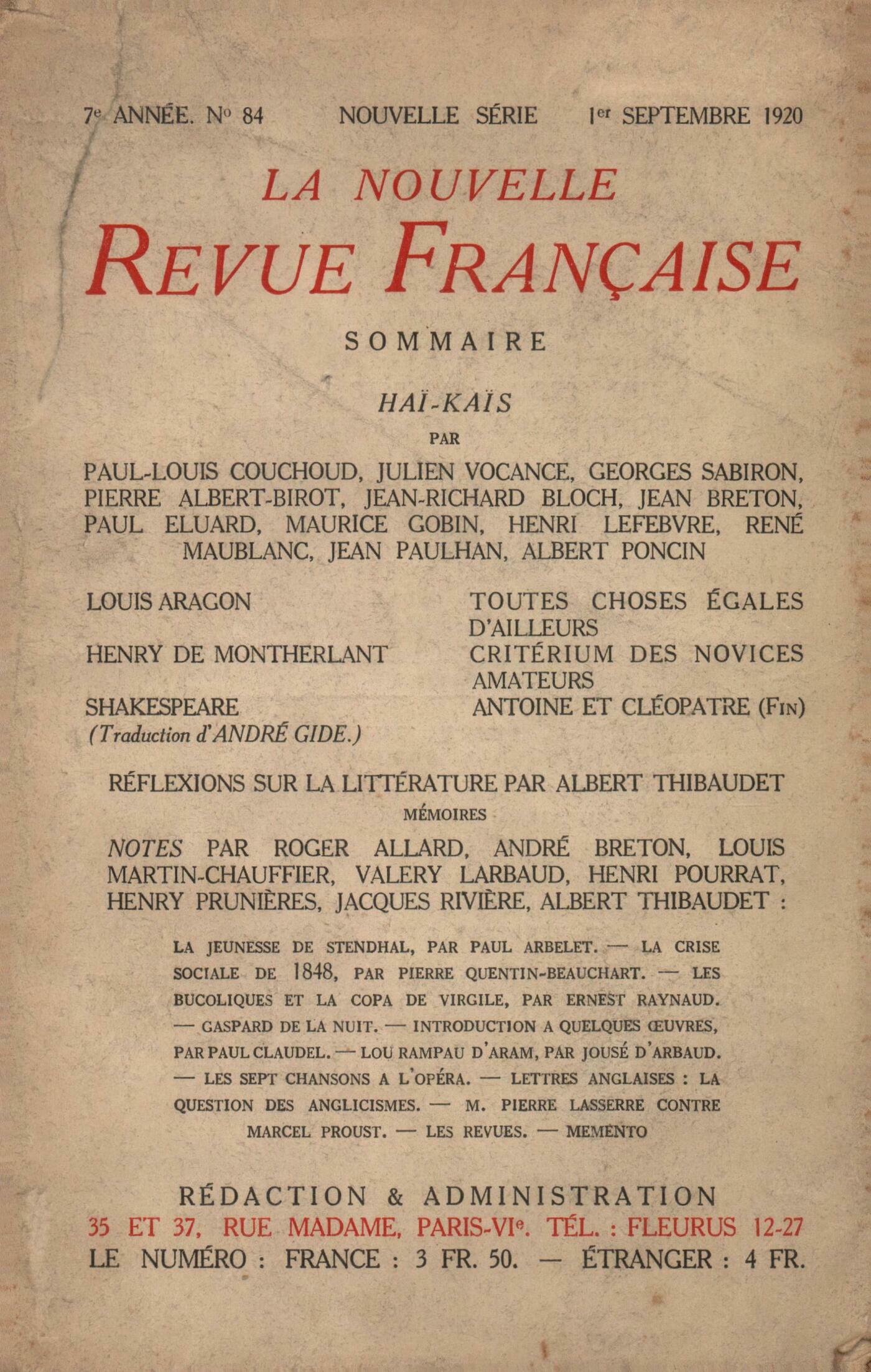 Jean Paulhan, Haď-kaďsPaul-Louis Couchoud, Au fil de l'eauJulien Vocance, Au cirqueGeorges Sabiron, Poussičre de počmePierre Albert-Birot, Počmes sur mesureJean-Richard Bloch, Maison en PoitouPaul Éluard, Pour vivre iciLouis Aragon, Toutes choses égales d'ailleursHenry de Montherlant, Critérium des novices amateursWilliam Shakespeare, Antoine et Cléopâtre (Fin)Réflexions sur la littérature : Albert Thibaudet, MémoiresNotes : Louis Martin-Chauffier, La jeunesse de Stendhal, par Paul Arbelet (Champion)Albert Thibaudet, La crise sociale de 1848. Les origines et la révolution de Février, par Pierre Quentin-Bauchart (Hachette)Roger Allard, Les Bucoliques et la Copa de Virgile, par Ernest Raynaud (Garnier frčres)André Breton, Gaspard de la Nuit, par Louis Bertrand (ŕ la Sirčne)Henri Pourrat, Introduction ŕ quelques uvres, par Paul Claudel (Les Cahiers des Amis des Livres)Albert Thibaudet, Lou Rampau d'Aram, par Jousé d'Arbaud (Éd. du Feu)Henry Pruničres, Les Sept Chansons de Malipiero ŕ l'OpéraLettres anglaises : Valery Larbaud, La question des anglicismesNotes : Jacques Rivičre, M. Pierre Lasserre contre Marcel ProustRevue des revues : Anonymes, Alain-FournierJean Paulhan, Sur la langue et la pensée chinoisesDivers : Anonymes, Mémento - Mémento bibliographique
