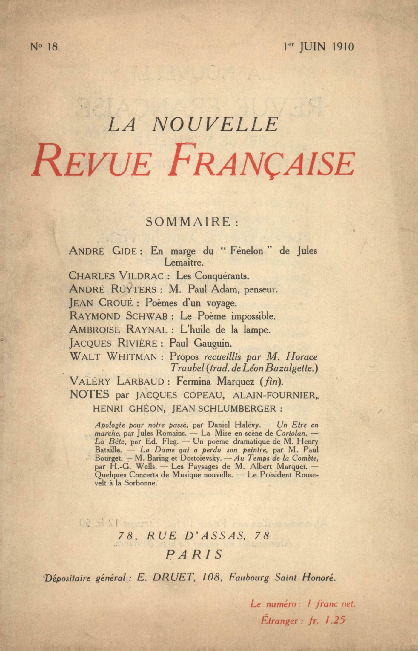 André Gide, En marge du Fénelon de Jules LemaîtreCharles Vildrac, Les ConquérantsAndré Ruyters, M. Paul Adam, penseurJean Croué, Počmes d'un voyageRaymond Schwab, Le Počme impossibleAmbroise Raynal, L'huile de la lampeJacques Rivičre, Paul GauguinWalt Whitman, Quelques propos (recueillis par Horace Traubel)Valery Larbaud, Fermina Marquez (fin)Notes : Jean Schlumberger, Apologie pour notre passé, par Daniel Halévy (Cahiers de la Quinzaine)Henri Ghéon, Un Ętre en marche, par Jules Romains (Mercure de France)Jean Schlumberger, La mise en scčne de Coriolan (Odéon)Jacques Copeau, La Bęte, par Edmond Fleg (Théâtre Antoine)Henri Ghéon, Un počme dramatique de M. Henry BatailleJean Schlumberger, La Dame qui a perdu son peintre, par M. Paul Bourget (Plon Nourrit)Jacques Copeau, M. Baring et DostoďevskyHenri Ghéon, Au temps de la Comčte, par H. G. Wells - Les paysages de M. Albert Marquet (Galerie Druet) - Ŕ propos de quelques concerts de musique nouvelle (S.N.M. S.M. I. Concert Mahler) Alain-Fournier, Le président Roosevelt ŕ la Sorbonne