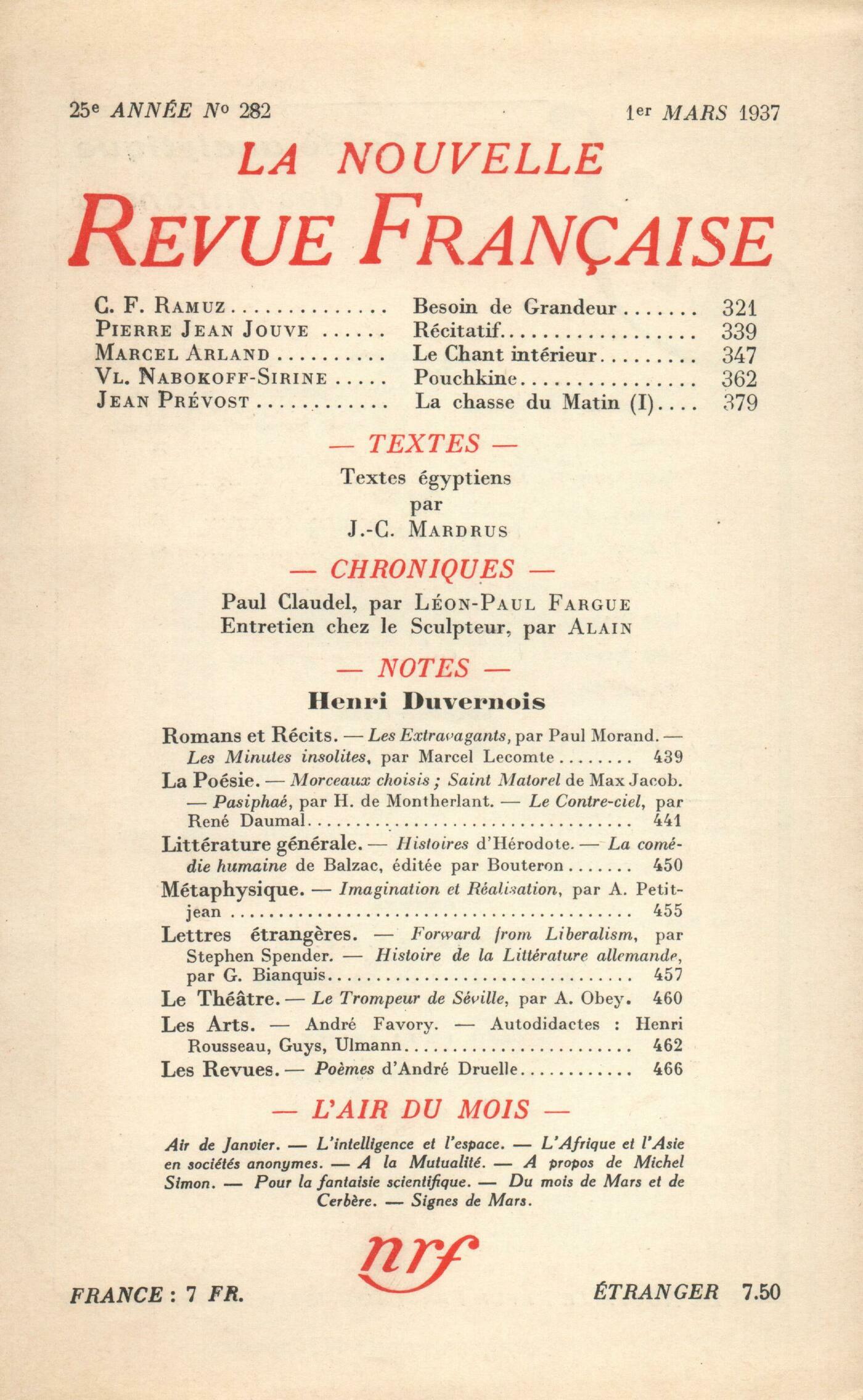 Charles-Ferdinand Ramuz, Besoin de grandeur (Fragments)Pierre Jean Jouve, RécitatifMarcel Arland, Le Chant intérieurVladimir Nabokov, Pouchkine ou Le vrai et le vraisemblableJean Prévost, La Chasse du Matin (I)J. C. Mardrus, Textes égyptiens (II)Chroniques : Léon-Paul Fargue, Ŕ Paul Claudel Alain, Premier entretien avec le sculpteurBenjamin Crémieux, Henri DuvernoisNotes : romans et récits : Marcel Arland, Les Extravagants, par Paul Morand (Éditions de la N. R. F.)Jean Vaudal, Les Minutes insolites, par Marcel Lecomte (Paradis-perdu)Notes : la poésie : Charles-Albert Cingria, Morceaux choisis, de Max Jacob (Gallimard) - Saint Matorel, par Max Jacob (Gallimard)Gabriel Bounoure, Pasiphaé, par Henry de Montherlant (Les Cahiers de Barbarie)Notes : littérature générale : A. Rolland de Renéville, Le contre-ciel, par René Daumal (Bibliothčque Doucet)Marie Delcourt, Histoires d'Hérodote (Belles-Lettres)Roger Caillois, La Comédie Humaine, I, II, III, par Honoré de Balzac (Gallimard)Notes : métaphysique : Gaston Bachelard, Imagination et réalisation, par Armand Petitjean (Denoël et Steele)Notes : lettres étrangčres : Armand-M. Petitjean, Forward from liberalism, par Stephen SpenderFélix Bertaux, Histoire de la littérature allemande, par Genevičve Bianquis (Armand Colin)Notes : le théâtre : Jean Schlumberger, Le Trompeur de Séville, par André Obey (Porte Saint-Martin)Notes : les arts : André Lhote, André Favory - Autodidactes : Henri Rousseau, Constantin Guys, Fred Uhlmann et peintres du dimancheLes revues : André Druelle, Un počmeL'air du mois : Francis Jammes, Air de janvierPierre Drieu la Rochelle, L'intelligence et l'espaceLéon Bopp, L'Afrique et l'Asie mises en sociétés anonymesArmand-M. Petitjean, Les écrivains combattants d'Espagne ŕ la MutualitéMarcel Arland, Exposition Constantin Guys (Pavillon de Marsan)Adrienne Monnier, Ŕ propos de Michel SimonJean Vaudal, Pour la fantaisie scientifiqueTristan Derčme, Les propos de M. Polyphčme Durand : Du mois de Mars et de CerbčreHenri Pourrat, Signes de mars Anonymes, Bulletin