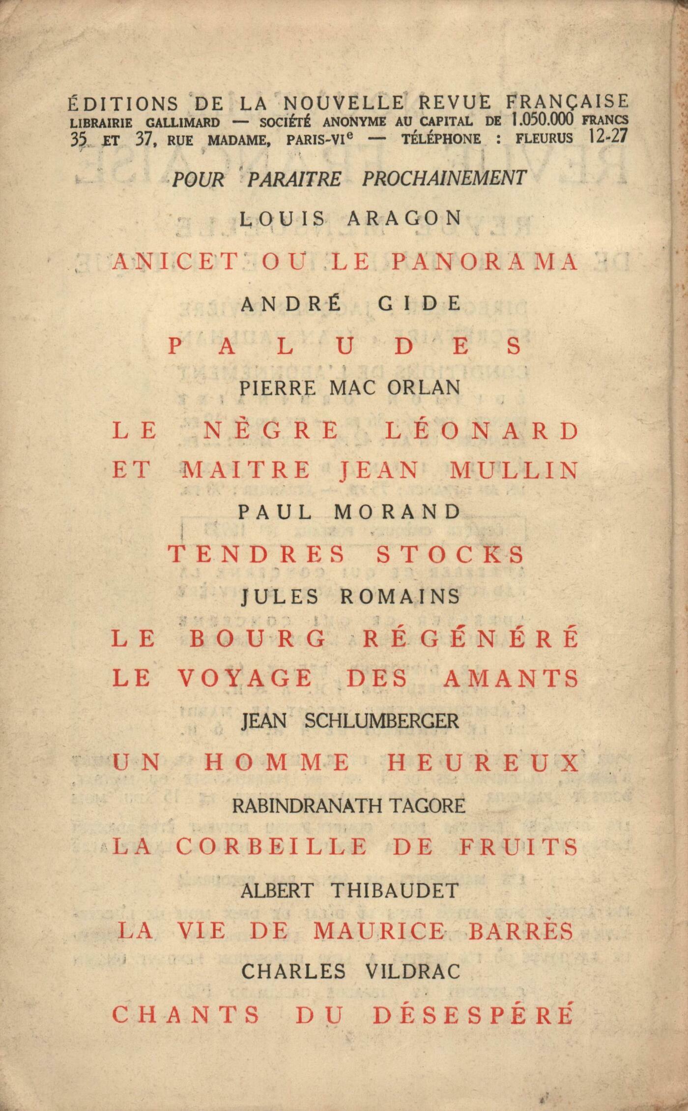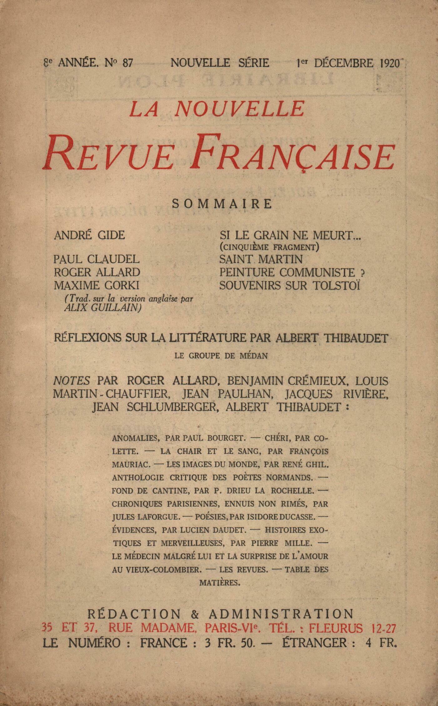 André Gide, Si le grain ne meurt... (Cinquičme fragment)Paul Claudel, Saint MartinRoger Allard, Peinture communiste ?Maxime Gorki, Souvenirs sur TolstoďRéflexions sur la littérature : Albert Thibaudet, Le groupe de MédanNotes : Louis Martin-Chauffier, Anomalies, par Paul Bourget (Plon-Nourrit)Benjamin Crémieux, Chéri, par Colette (Fayard)Albert Thibaudet, La Chair et le Sang, par François Mauriac (Émile-Paul)Roger Allard, Les Images du Monde, par René Ghil (Figuičre et Cie) - La Tradition de poésie scientifique, par René Ghil (Société littéraire de France) - Anthologie critique des počtes normands, par Charles-Théophile Féret, Raymond Postal et divers auteurs (Garnier)Benjamin Crémieux, Fond de cantine, par Drieu la Rochelle (Éditions de la Nouvelle Revue Française)Albert Thibaudet, Chroniques parisiennes Ennuis non rimés, par Jules Laforgue (La Connaissance)Jean Paulhan, Poésies, par Isidore Ducasse (comte de Lautréamont (Au Sans Pareil)Albert Thibaudet, Évidences, par Lucien Daudet (ŕ la Sirčne)Benjamin Crémieux, Histoires exotiques et merveilleuses, par Pierre Mille (Ferenczi)Jean Schlumberger, Le Médecin malgré lui, au Vieux-ColombierJacques Rivičre, La Surprise de l'Amour, de Marivaux, au Vieux-ColombierJean Schlumberger, Le Maître de son cur, par Paul Raynal, ŕ l'OdéonRevues : Anonymes, Invention de la timidité - La nouvelle et le roman - Gide, DostoďewskyRaymond Radiguet, Champ-de-MarsDivers : Anonymes, Mémento