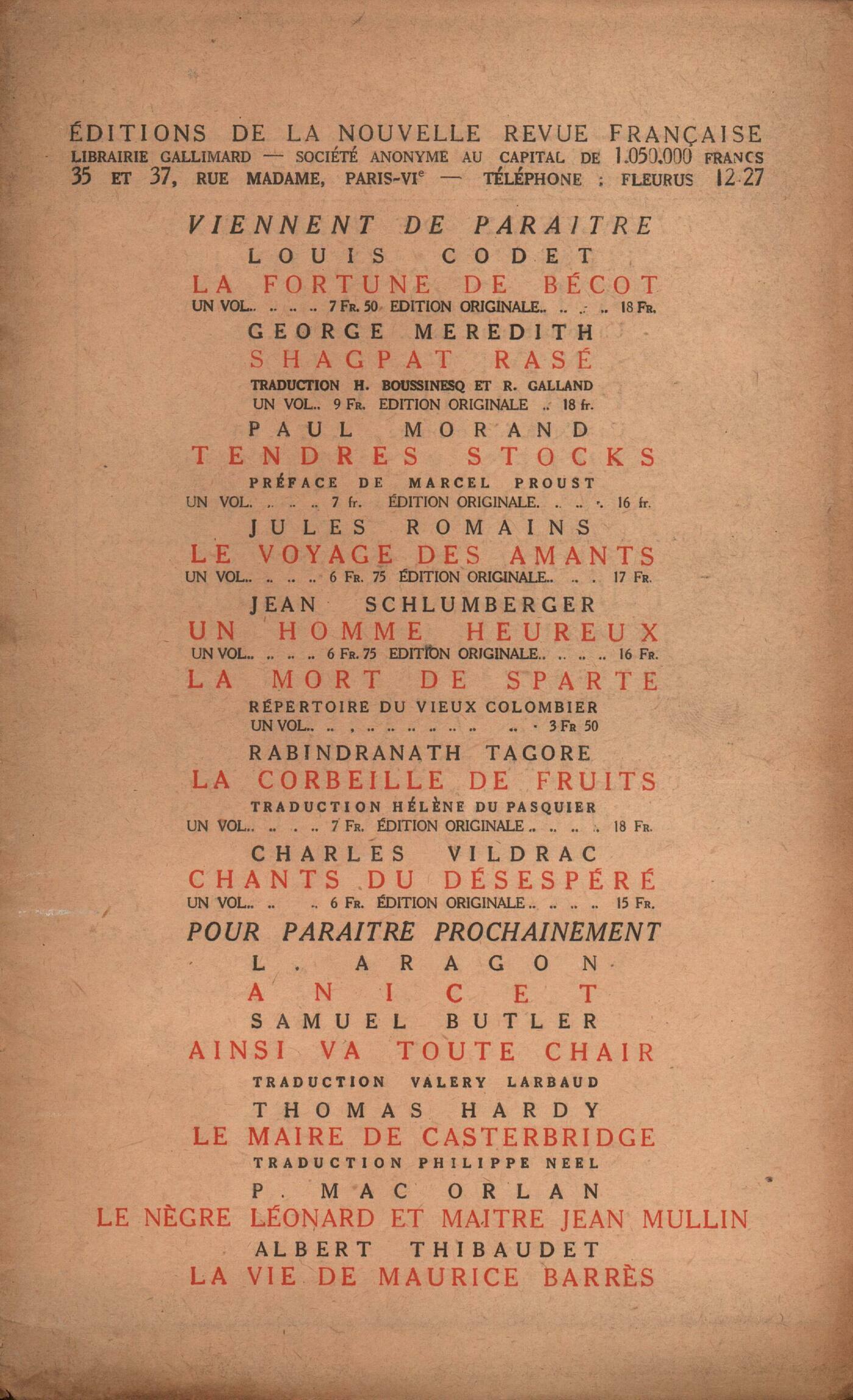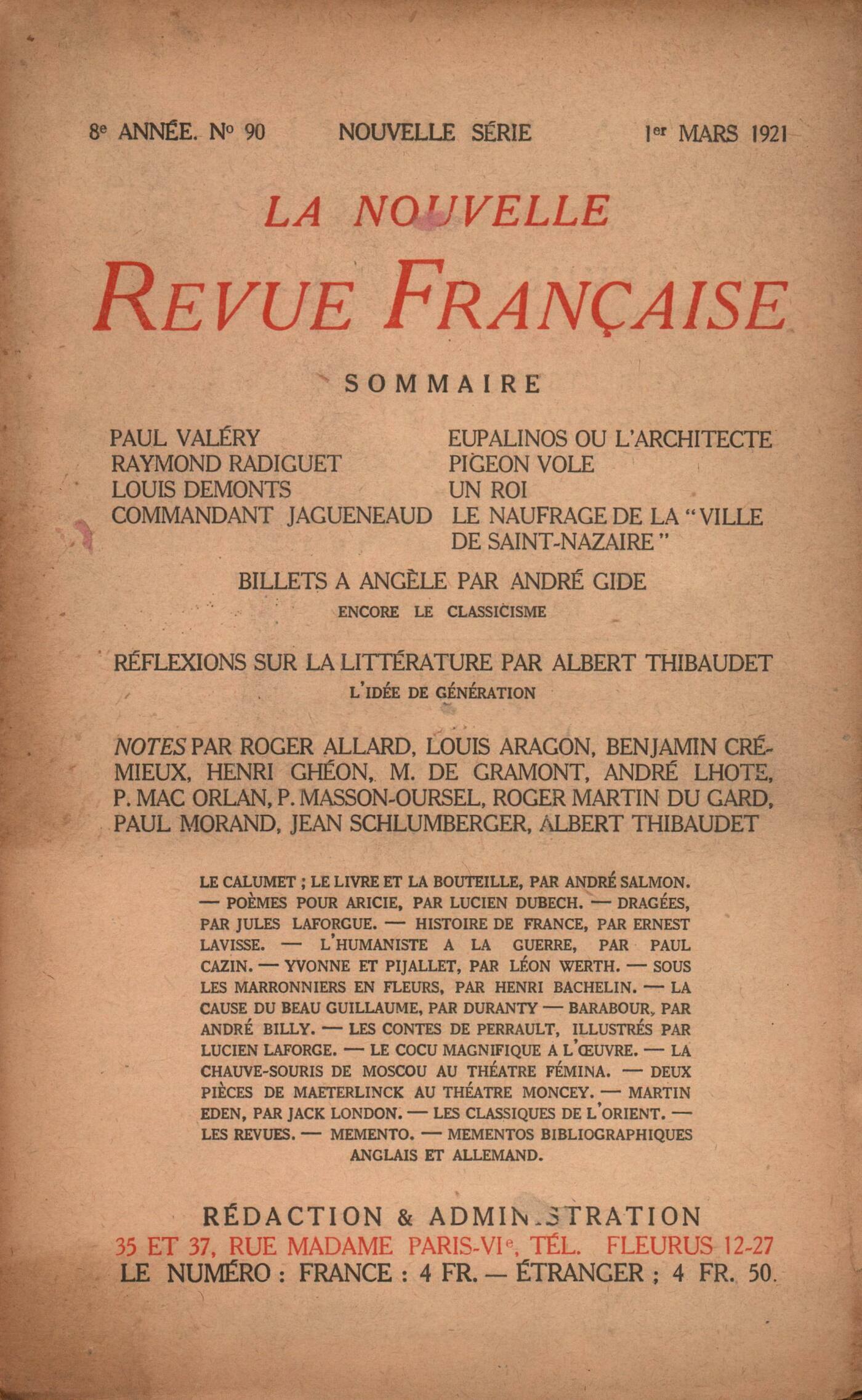 Paul Valéry, Eupalinos ou l'architecteRaymond Radiguet, Pigeon vole Automne Le hamacLouis Demonts, Un roiPaul Jagueneaud, Récit du naufrage de la ŤVille-de-Saint-NazaireťAndré Gide, Billets ŕ AngčleRéflexions sur la littérature : Albert Thibaudet, L'idée de générationNotes : André Lhote, Le trente-deuxičme Salon des IndépendantsRoger Martin du Gard, Les Jardins, par André Véra (Émile-Paul)Roger Allard, Le Calumet, par André Salmon (Éditions de la Nouvelle Revue Française) - Le Livre et la Bouteille, par André Salmon (Camille Bloch) - Počmes pour Aricie, par Lucien Dubech (Société littéraire de France)Benjamin Crémieux, Dragées, par Jules Laforgue (Éditions de la Connaissance)Albert Thibaudet, Histoire de France. La Révolution, par P. Sagnac et E. ParisotHenri Ghéon, L'humaniste ŕ la guerre, par Paul Cazin (Plon)Benjamin Crémieux, Yvonne et Pijallet, par Léon Werth (Albin Michel) - Sous les marronniers en fleurs, par Henri Bachelin (Société littéraire de France)Albert Thibaudet, La cause du beau Guillaume, par Duranty (Éditions de la Sirčne) - Barabour ou l'harmonie universelle, par André Billy (La Renaissance du Livre)Louis Aragon, Les Contes de Perrault, illustrés par Lucien Laforge (Éditions de la Sirčne)Paul Morand, Le Cocu magnifique, de Crommelynck (Théâtre de l'uvre)Michel de Gramont, La Chauve-Souris de Moscou au Théâtre FeminaJean Schlumberger, Deux pičces de M. Maeterlinck au Théâtre MonceyPierre Mac Orlan, Martin Eden, par Jack London (Édition Française Illustrée)Paul Masson-Oursel, Les Classiques de l'OrientDivers : Anonymes, Mémento - Mémento bibliographique