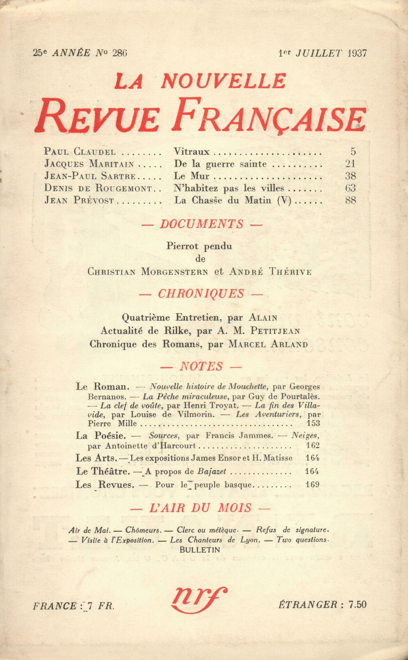 Paul Claudel, VitrauxJacques Maritain, De la guerre sainteJean-Paul Sartre, Le MurDenis de Rougemont, N'habitez pas les villesJean Prévost, La Chasse du Matin (V)Documents : Christian Morgenstern, Pierrot penduChroniques : Alain, Entretiens chez le sculpteur : Quatričme entretienArmand-M. Petitjean, ŤActualitéť de RilkeChronique des romans : Marcel Arland, Nouvelle histoire de Mouchette, par Georges Bernanos - La Pęche miraculeuse, par Guy de Pourtalčs - La clef de voűte, par Henri TroyatNotes : le roman : Jean Cocteau, La Fin des Villavide, par Louise de Vilmorin (Éditions de la N. R. F.)Jean Prévost, Le Dernier Civil, par Ernest Glaeser (Grasset)Jean Vaudal, Les Aventuriers, par Pierre Mille (Calmann-Lévy)Notes : la poésie : Léon-Paul Fargue, Sources, par Francis Jammes (Le Divan) - Neiges, par Antoinette d'Harcourt (Stock)Notes : le théâtre : Benjamin Crémieux, Ŕ propos de BajazetNotes : les arts : André Lhote, James Ensor (Galerie de l'Élysée) - Henri Matisse (Galerie Paul Rosenberg)Les revues : François Mauriac, Pour le peuple basqueL'air du mois : Francis Jammes, Air de maiArmand-M. Petitjean, ChômeursJulien Benda, Clerc ou métčque? - Refus de signatureA. Rolland de Renéville, Premičres visites ŕ l'ExpositionBoris de Schlzer, Les chanteurs de LyonCharles-Albert Cingria, Two Questions Anonymes, Bulletin