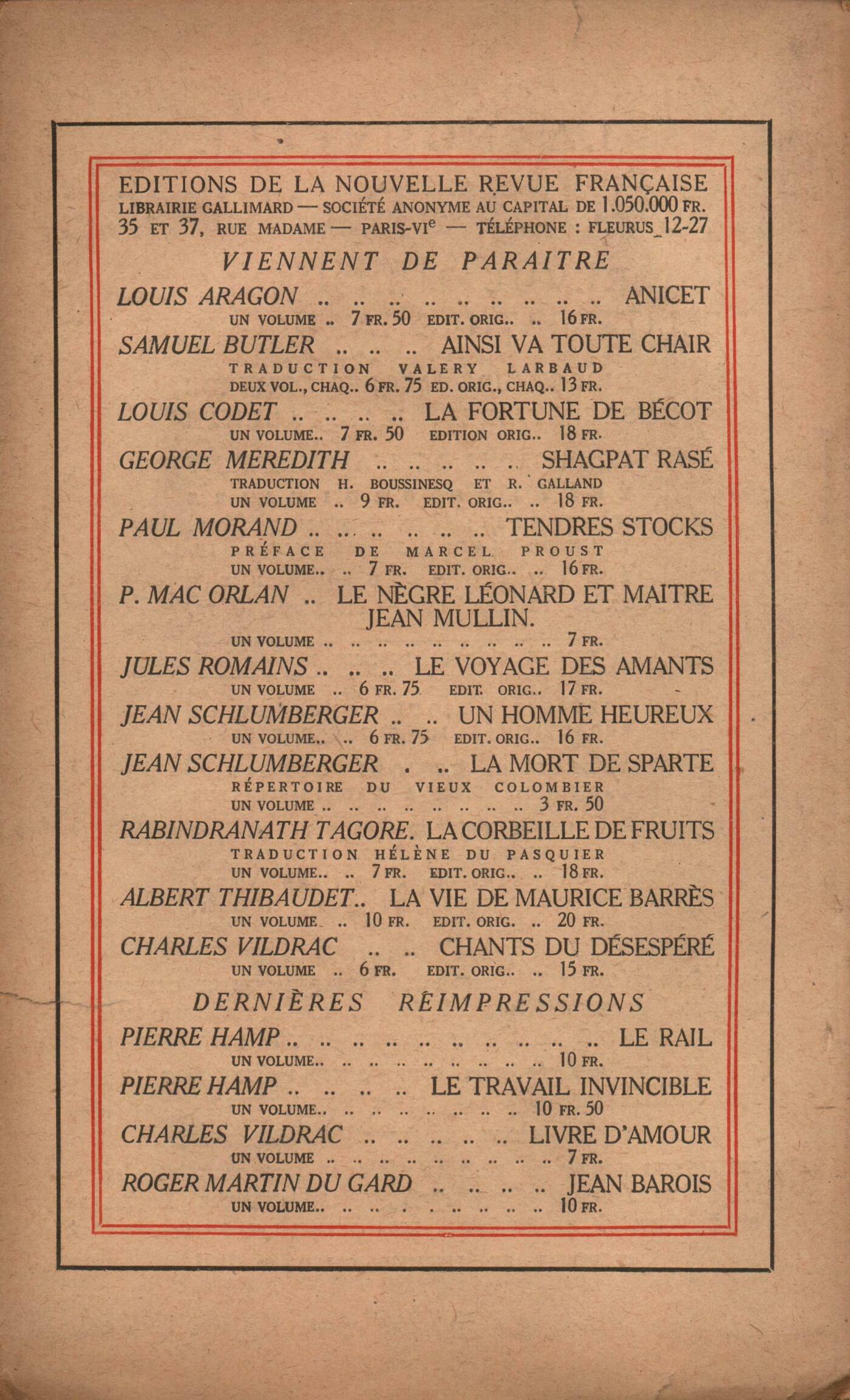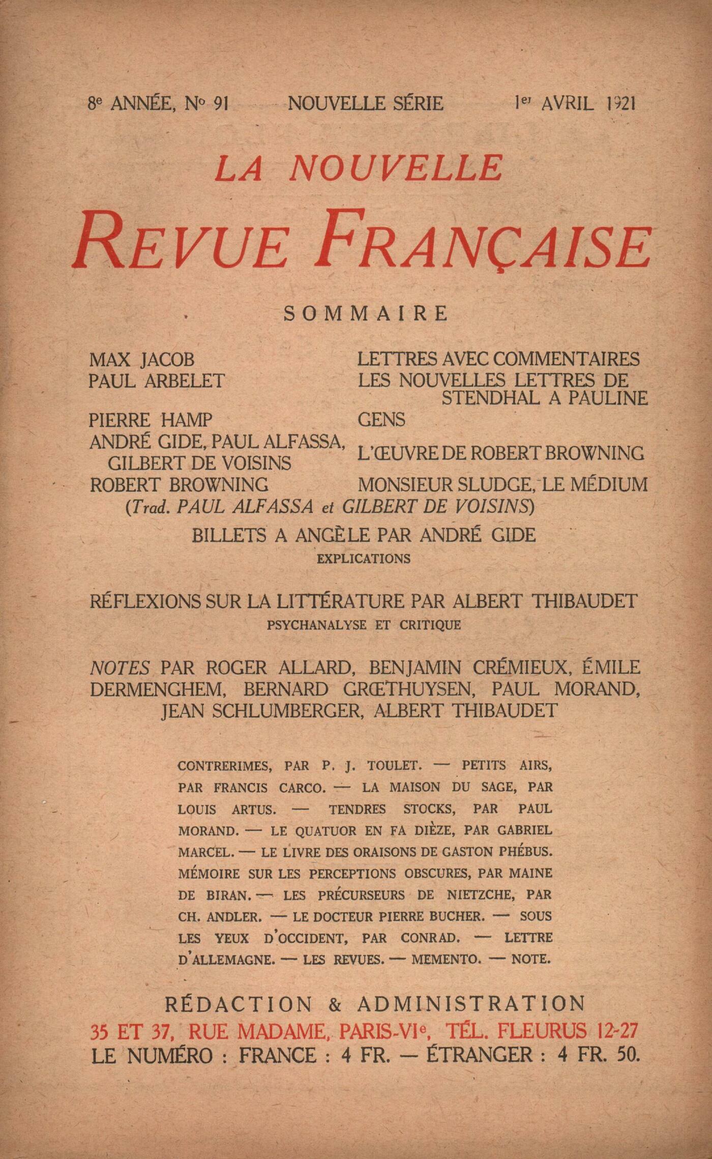 Max Jacob, Lettres avec commentairesPaul Arbelet, Les nouvelles lettres de Stendhal ŕ PaulinePierre Hamp, GensAndré Gide - Paul Alfassa - Auguste Gilbert de Voisins, L'uvre de Robert BrowningRobert Browning, Monsieur Sludge, le médiumAndré Gide, Billets ŕ AngčleRéflexions sur la littérature : Albert Thibaudet, Psychanalyse et critiqueNotes : Roger Allard, Les Contrerimes, par P. J. Toulet (Éditions du Divan) - Petits Airs, par Francis Carco (Ronald Davis et Cie)Jean Schlumberger, La Maison du Sage, par Louis Artus (Émile-Paul)Benjamin Crémieux, Tendres Stocks, par Paul Morand (Éditions de la Nouvelle Revue Française) - Le Quatuor en fa dičse, par Gabriel MarcelÉmile Dermenghem, Le Livre des Oraisons de Gaston Phébus (La Sirčne)Albert Thibaudet, Mémoire sur les perceptions obscures, par Maine de Biran (Colin) - Les précurseurs de Nietzsche, par Charles Andler (Bossard)Jean Schlumberger, Le docteur Pierre BucherPaul Morand, Sous les yeux d'Occident, par Joseph Conrad (Éditions de la Nouvelle Revue Française)Bernard Groethuysen, Lettre d'AllemagneRevues : Anonymes, La comédie de caractčre au cinéma - Dans la ŤRondať de Rome (décembre 1920), signé de Lorenzo Montano, un apologue... - MémentoJacques Rivičre, Note