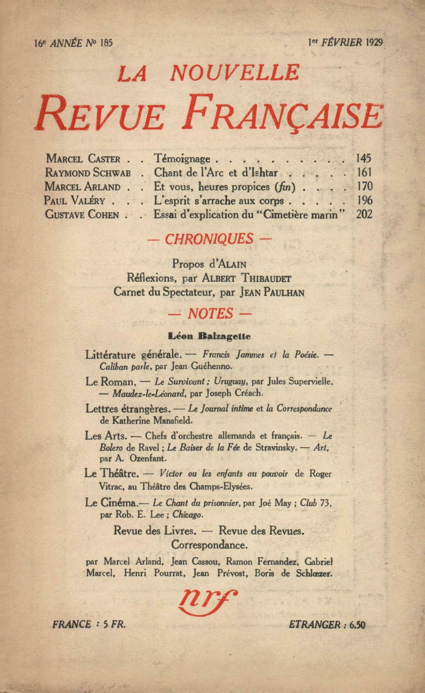 Marcel Caster, TémoignageRaymond Schwab, Chant de l'Arc et d'IshtarMarcel Arland, Et vous, heures propices... (Fin)Paul Valéry, L'esprit s'arrache aux corps...Gustave Cohen, Essai d'explication du Cimetičre marin de Paul Valéry Alain, ProposRéflexions : Albert Thibaudet, Tortoni et l'Europe - CalliopeJean Paulhan, Carnet du SpectateurJean Prévost, Léon BazalgetteNotes : littérature générale : Marcel Arland, Francis Jammes et la poésieRamon Fernandez, Caliban parle, par Jean Guéhenno (Grasset)Notes : le roman : Henri Pourrat, Le Survivant, par Jules Supervielle (Éditions de la N. R. F.) - Uruguay, par Jules Supervielle (Émile-Paul)Marcel Arland, Maudez le Léonard, par Joseph Créach (Plon)Notes : lettres étrangčres : Gabriel Marcel, Lectures [Journal posthume et Correspondance de Katherine Mansfield]Notes : les arts : Boris de Schlzer, Chronique musicaleNotes : le théâtre : Jean Prévost, Victor ou Les enfants au pouvoir, par Roger Vitrac (Théâtre des Champs-Élysées)Notes: le cinéma : Jean Prévost, Le Chant du prisonnier, par Joé May - Club 73, par Rob. E. Lee - ChicagoRevue des livres : Marcel Arland, Un gosse, par Auguste Brepson (Rieder) Daniel-Rops, Alfred de Vigny, par Robert de Traz (Hachette)Georges Dupeyron, L'Impasse, par Albert Marchon (Grasset)Jean Cassou, El Aguila y la Serpiente, par Martin Luis Guzman (Madrid)Claude Roger-Marx, La légende et la vie d'Utrillo, par Francis Carco (Bernard Grasset)Benjamin Crémieux, Le théâtre français contemporain, par Edmond Sée (Colin)Revue des revues : Benjamin Crémieux, Pégaso Anonymes, Mémento des revues - DiversCorrespondance : Jean Schlumberger, Une lettre