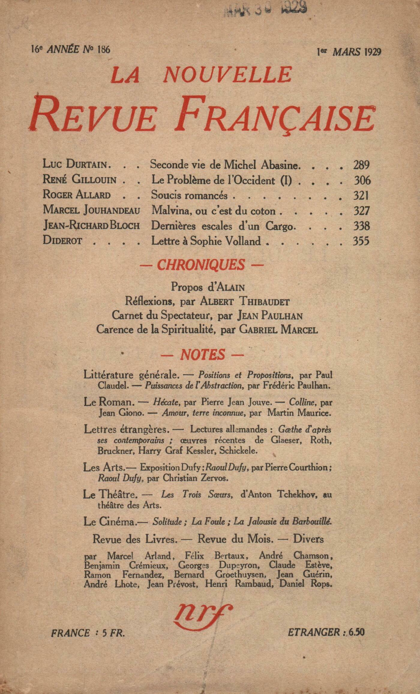 Luc Durtain, Seconde vie de Michel AbasineRené Gillouin, Le Problčme de l'Occident (I)Roger Allard, Soucis romancésMarcel Jouhandeau, Malvina ou C'est du cotonJean-Richard Bloch, Derničres escales d'un CargoDenis Diderot, Lettre ŕ Sophie Volland Alain, ProposRéflexions : Albert Thibaudet, Aprčs vingt ansGabriel Marcel, Carence de la spiritualitéJean Paulhan, Carnet du SpectateurNotes : littérature générale : Henri Rambaud, Positions et propositions, par Paul Claudel (Éditions de la N. R. F.)Ramon Fernandez, Les Puissances de l'Abstraction, par Frédéric Paulhan (Éditions de la N. R. F.)Notes : le roman : Bernard Groethuysen, Hécate, par Pierre Jean Jouve (Éditions de la N. R. F.)André Chamson, Colline, par Jean Giono (Bernard Grasset)Marcel Arland, Amour, terre inconnue, par Martin Maurice (Éditions de la N. R. F.)Notes : lettres étrangčres : Félix Bertaux, Lectures allemandesNotes : les arts : André Lhote, Exposition Raoul Dufy (Le Portique) - Raoul Dufy, par Pierre Courthion (Chroniques du Jour) - Raoul Dufy, par Christian Zervos (Cahiers d'Art)Notes : le théâtre : Benjamin Crémieux, Les Trois Surs, d'Anton Tchekhov (Théâtre des Arts)Notes : le cinéma : Jean Prévost, Solitude - La Foule, de King Vidor - La Jalousie du Barbouillé, par A. CavalcantiRevue des livres : Georges Dupeyron, L'Abbesse, par Henri Duclos (Grasset)Claude Estčve, Tragédie de la pureté, par Paul Amance (N. R. F.) Daniel-Rops, Les gentilshommes de ceinture, par Alexandre Arnoux (Grasset)Revue du mois : Jean Guérin, Caliban parle...Divers : Jean Guérin, Correspondance - JeunesseCharles-Ferdinand Ramuz, Difficultés de l'uvre d'artJean Guérin, Le retour de l'enfant prodigue