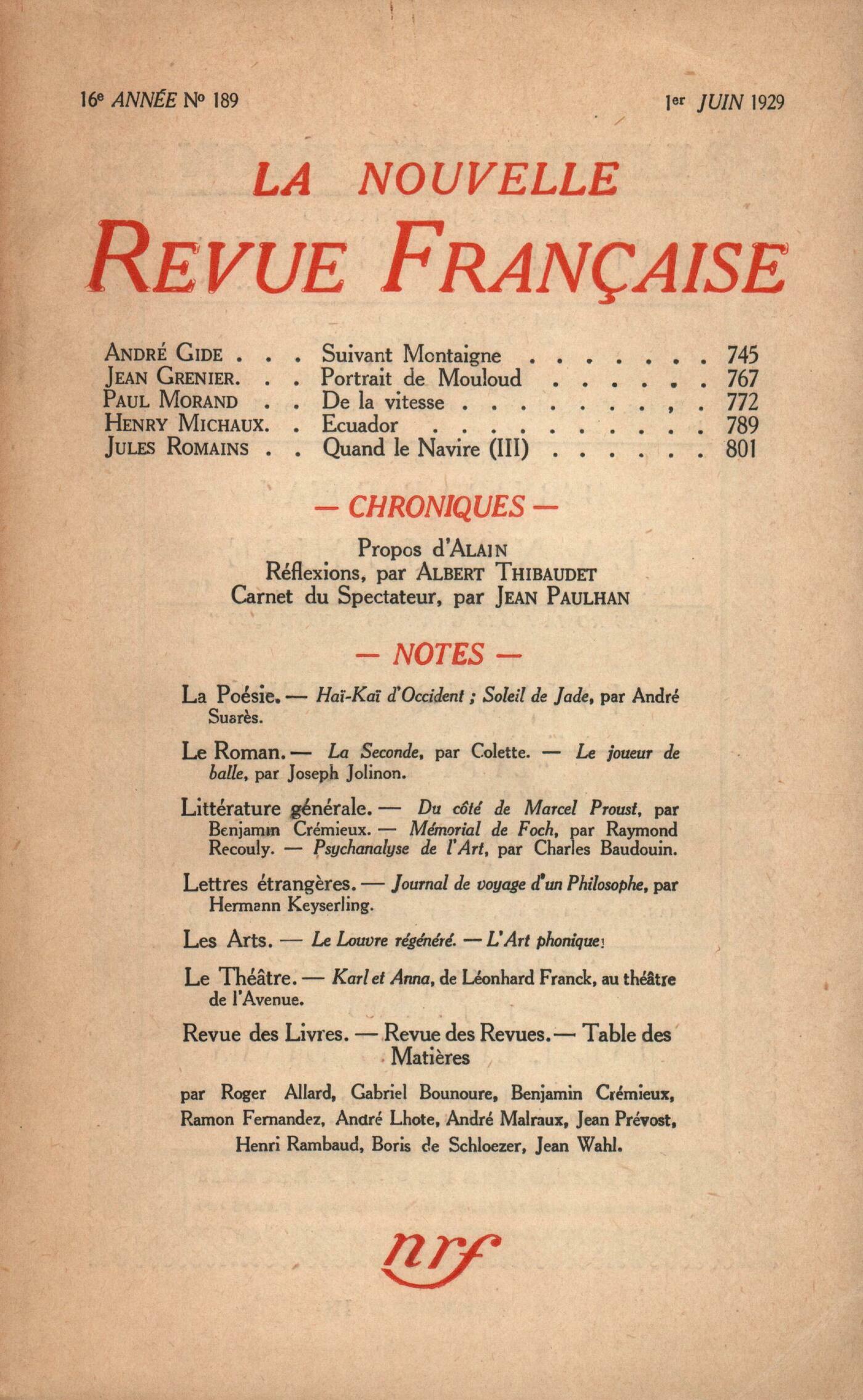 André Gide, Suivant MontaigneJean Grenier, Portrait de MouloudPaul Morand, De la vitesseHenri Michaux, EcuadorJules Romains, Quand le navire (III) Alain, ProposRéflexions : Albert Thibaudet, Homo faberJean Paulhan, Carnet du SpectateurNotes :la poésie : Gabriel Bounoure, Haď-kaď d'Occident, par André Suarčs (Marcelle Lesage) - Soleil de jade, par André Suarčs (Léon Pichon)Notes : le roman : Roger Allard, La Seconde, par Colette (Ferenczi)Benjamin Crémieux, Le Joueur de Balle, par Joseph Jolinon (Rieder)Notes : littérature générale : Ramon Fernandez, Du côté de Marcel Proust, par Benjamin Crémieux (Éditions Lemarget)Benjamin Crémieux, Mémorial de Foch, par Raymond Recouly (Éd. de France) - En écoutant le maréchal Foch, par le commandant Bugnet (Grasset)Jean Wahl, Psychanalyse de l'art, par Charles Baudouin (Alcan)Notes : lettres étrangčres : André Malraux, Journal de voyage d'un philosophe, par Hermann Keyserling (Stock)Notes : les arts : André Lhote, Le Louvre régénéréBoris de Schlzer, L'art phoniqueNotes : le théâtre : Benjamin Crémieux, Karl et Anna, de Léonhard Franck (Théâtre de l'Avenue)Revue des livres : Jean Prévost, La vie de Mahomet, par E. Dermenghem (Plon)Henri Rambaud, Sous l'il en fleurs de Madame de Noailles, par René Benjamin (Librairie des Champs-Élysées)Ramon Fernandez, Avec les yeux de l'Esprit, par René Béhaine (Grasset)Benjamin Crémieux, Espagne, par Azorin (Rieder)Revu des revues : Nathaniel Hawthorne, Idées et germes de nouvelles Anonymes, Mémento