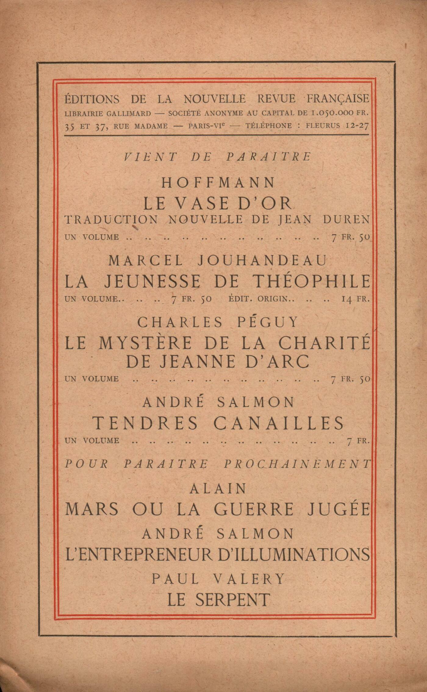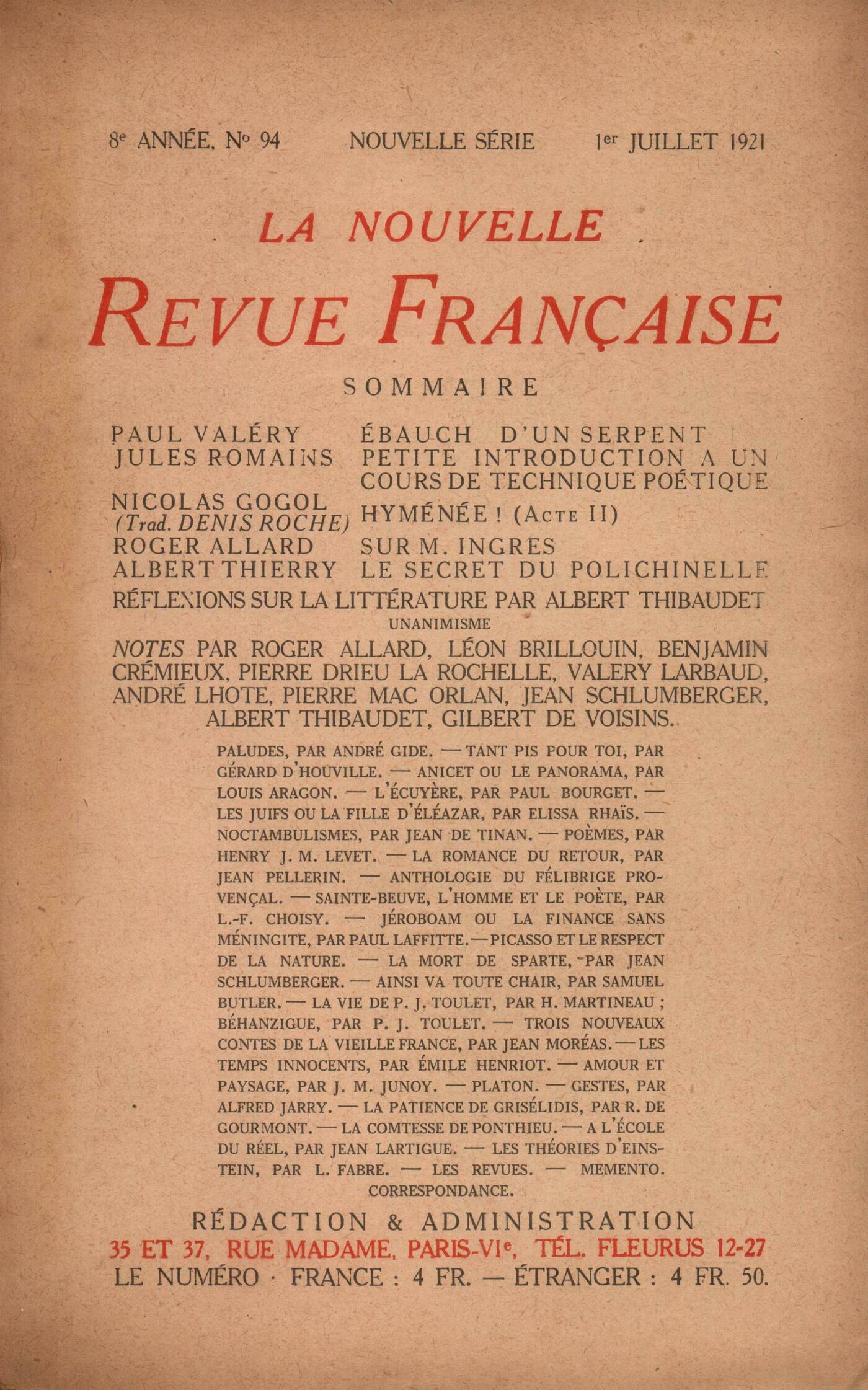 Paul Valéry, Ébauche d'un serpentJules Romains, Petite introduction ŕ un cours de technique poétiqueNicolas Gogol, Hyménée! (Acte II)Roger Allard, Sur M. IngresAlbert Thierry, Le Secret du PolichinelleRéflexions sur la littérature : Albert Thibaudet, UnanimismeNotes : Valery Larbaud, Paludes, par André Gide (Éditions de la Nouvelle Revue Française)Albert Thibaudet, Tant pis pour toi, par Gérard d'Houville (Fayard)Pierre Drieu la Rochelle, Anicet, par Louis Aragon (Éditions de la Nouvelle Revue Française)Benjamin Crémieux, L'Écuyčre, de Paul Bourget (Plon-Nourrit) - Les Juifs ou La fille d'Éléazar, par Elissa Rhaďs (Plon-Nourrit)Roger Allard, Noctambulismes, par Jean de Tinan (Ronald Davis)Benjamin Crémieux, Počmes, par Henry J.-M. Levet (La Maison des Amis des livres)Pierre Mac Orlan, La Romance du Retour, par Jean Pellerin (Éditions de la Nouvelle Revue Française)Albert Thibaudet, Anthologie du félibrige provençal, I (collection Pallas) - Sainte-Beuve, l'homme et le počte, par Louis-Frédéric Choisy (Plon)Jean Schlumberger, Jéroboam ou La finance sans méningite, par Paul Laffitte (La Sirčne)André Lhote, Picasso et le Ťrespect de la natureťAlbert Thibaudet, La mort de Sparte, par Jean Schlumberger (Éditions de la Nouvelle Revue Française)Auguste Gilbert de Voisins, Ainsi va toute chair, par Samuel Butler (Éditions de la Nouvelle Revue Française)Roger Allard, La vie de P.-J. Toulet, par Henri Martineau (Éditions du Divan) - Béhanzigue, par P.-J. Toulet (Bibliothčque du Hérisson) - Trois nouveaux contes de la vieille France, par Jean Moréas (Émile-Paul) - Les temps innocents, par Émile Henriot (Émile-Paul) - Amour et paysage, par J. M. JunoyAlbert Thibaudet, Platon, II (éd. Alfred Croiset) (Les Belles-Lettres)Roger Allard, Gestes, par Alfred Jarry (Le Sagittaire) - La patience de Grisélidis, par Remy de Gourmont (Le Sagittaire) - La comtesse de Ponthieu (La Sirčne) Anonymes, Ŕ l'École du Réel, par Jean Lartigue (La Connaissance)Léon Brillouin, Une nouvelle figure du monde : les théories d'Einstein, par Lucien Fabre (Payot)Revues : Anonymes, De certaines causes de malentendu - L'Esprit nouveau et l'architecture - - MémentoCorrespondance : Jacques Boulenger, Une lettre