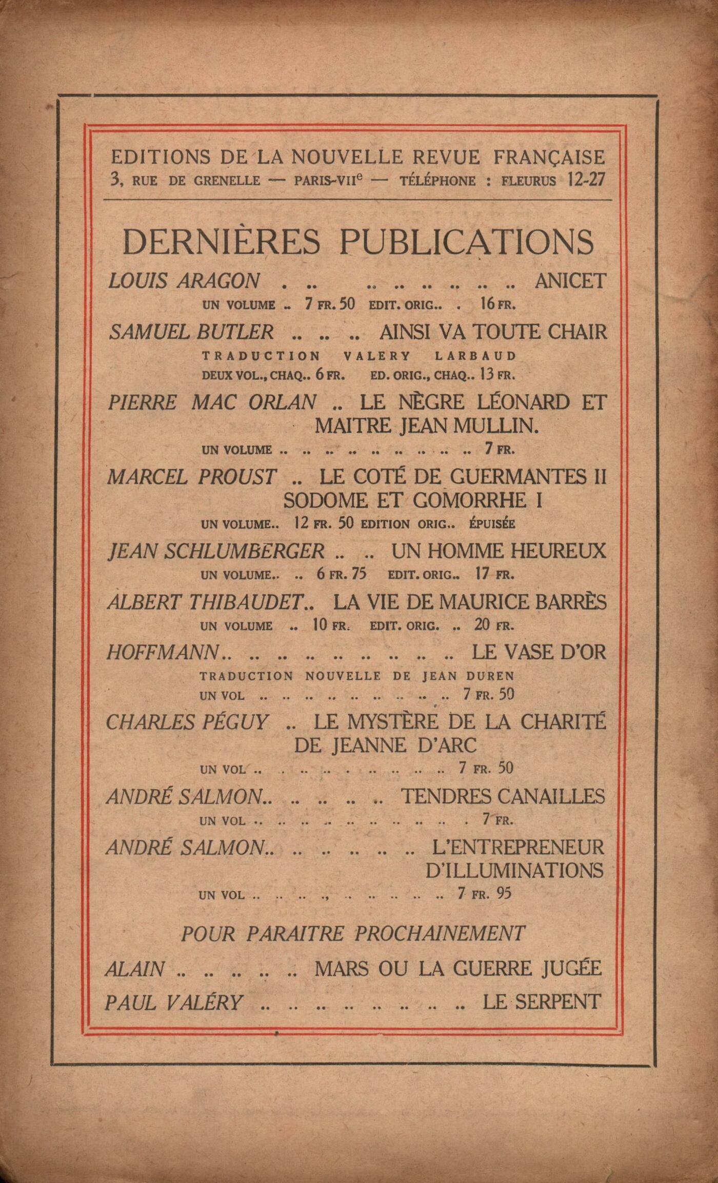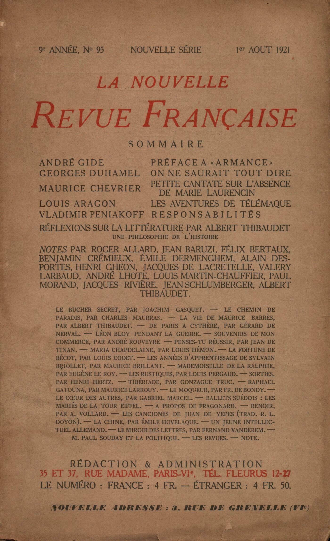 André Gide, Préface ŕ ArmanceGeorges Duhamel, On ne saurait tout direMaurice Chevrier, Petite cantate sur l'absence de Marie LaurencinLouis Aragon, Les aventures de Télémaque (Fragment)Vladimir Peniakoff, ResponsabilitésRéflexions sur la littérature : Albert Thibaudet, Une philosophie de l'histoireNotes : Roger Allard, Le Bűcher secret, par Joachim Gasquet (Librairie de France)Louis Martin-Chauffier, Le Chemin de Paradis, par Charles Maurras (Éd. de Boccard)Henri Ghéon, La vie de Maurice Barrčs, par Albert Thibaudet (Nouvelle Revue Française)Albert Thibaudet, De Paris ŕ Cythčre, par Gérard de Nerval (Éditions Bossard)Émile Dermenghem, Léon Bloy pendant la guerreRoger Allard, Souvenirs de mon commerce, par André Rouveyre (Crčs)Benjamin Crémieux, Penses-tu réussir? par Jean de Tinan (Sans-Pareil)Jean Schlumberger, Maria Chapedelaine, par Louis Hémon (Les Cahiers verts)Jacques de Lacretelle, La Fortune de Bécot, par Louis Codet (Éditions de la Nouvelle Revue Française)Albert Thibaudet, Les années d'apprentissage de Sylvain Briollet, par Maurice Brillant (Bloud et Gay)Jacques de Lacretelle, Mademoiselle de la Ralphie, par Eugčne Le Roy (F. Rieder)Félix Bertaux, Les Rustiques, par Louis Pergaud (Mercure de France)Benjamin Crémieux, Sorties, par Henri Hertz (Rieder)Albert Thibaudet, Tibériade, par Gonzague Truc (Albin Michel)Benjamin Crémieux, Rafael Gatouna, Français d'occasion, par Maurice Larrouy (Bernard Grasset) - Le moqueur ? par François de Bondy (Bernard Grasset)Jean Schlumberger, Le cur des autres, par Gabriel Marcel (Les Cahiers Verts)Paul Morand, Ballets suédois : Les Mariés de la Tour Eiffel, par Jean CocteauAndré Lhote, Ŕ propos de Fragonard - Renoir, par Ambroise Vollard (Crčs)Jean Baruzi, Les Canciones de Juan de Yepes [Saint Jean de la Croix] (La Connaissance)Félix Bertaux, La Chine, par Émile Hovelaque (Flammarion)Alain Desportes, Un jeune intellectuel allemandValery Larbaud, Le Miroir des Lettres, par Fernand Vandérem (Flammarion)Jacques Rivičre, M. Paul Souday et la politiqueRevues : Anonymes, Fénelon critique - In memoriam - L'Encrier - La résurrection de l'épigramme - Mémento - Note