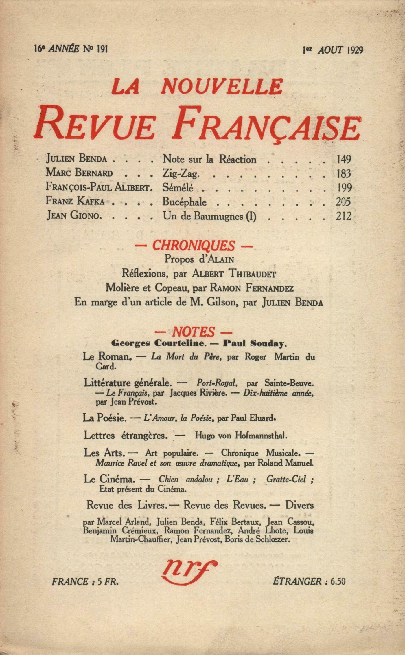 Julien Benda, Note sur la RéactionMarc Bernard, Zig-ZagFrançois-Paul Alibert, SéméléFranz Kafka, Bucéphale et autres récitsJean Giono, Un de Baumugnes (I) Alain, ProposRéflexions : Albert Thibaudet, Le problčme du DiscipleJulien Benda, En marge d'un article de M. GilsonLes essais : Ramon Fernandez, Moličre et Copeau - Georges CourtelineNotes : le roman : Marcel Arland, Paul SoudayNotes : littérature générale : Benjamin Crémieux, La Mort du Pčre, par Roger Martin du Gard (N. R. F.)Jean Prévost, Port-Royal, par Sainte-BeuveLouis Martin-Chauffier, Le Français, par Jacques Rivičre (Claude Aveline)Félix Bertaux, Dix-huitičme année, par Jean Prévost (N. R. F.)Notes : la poésie : Jean Prévost, L'Amour, la Poésie, par Paul Éluard (Éditions de la N. R. F.)Notes : lettres étrangčres : Jean Cassou, Hugo von HofmannsthalNotes : les arts : André Lhote, Art populaireBoris de Schlzer, Chronique musicale - Maurice Ravel et son uvre dramatique, par Roland-Manuel (Librairie de France)Notes : le cinéma :Jean Prévost, Le Chien andalou, de Buńuel - L'eau - Gratte-ciel (Studio 28)Revue des livres : Jean Guérin, Ŕ l'orée de la Foręt vierge, par A. Schweitzer (Rieder) - Morvan, par M. Constantin-Weyer (Rieder)Jean Cassou, L'Homme-Mithridate, par Pierre Minet (N. R. F.)Marcel Arland, Dormeuse, par Denise van Moppčs (Grasset)Jean Guérin, Marceau-la-Rose, par Élie Richard (Rieder) - La Gabriélide, par Pouchkine (Éd. du Trianon)André Lhote, Livres d'artLes revues : Jean Guérin, Nord - MémentoCorrespondance : Emmanuel Berl, Une lettre