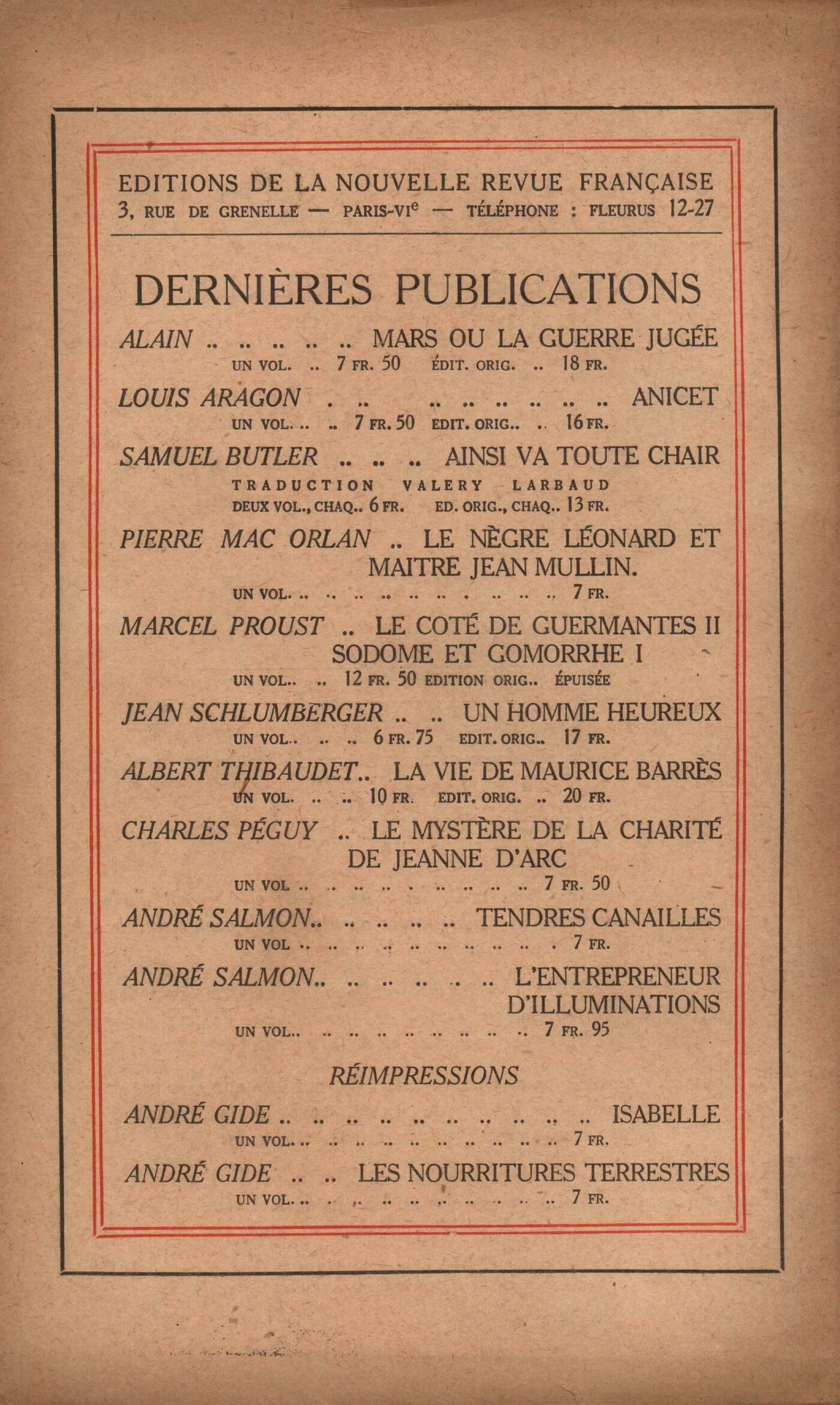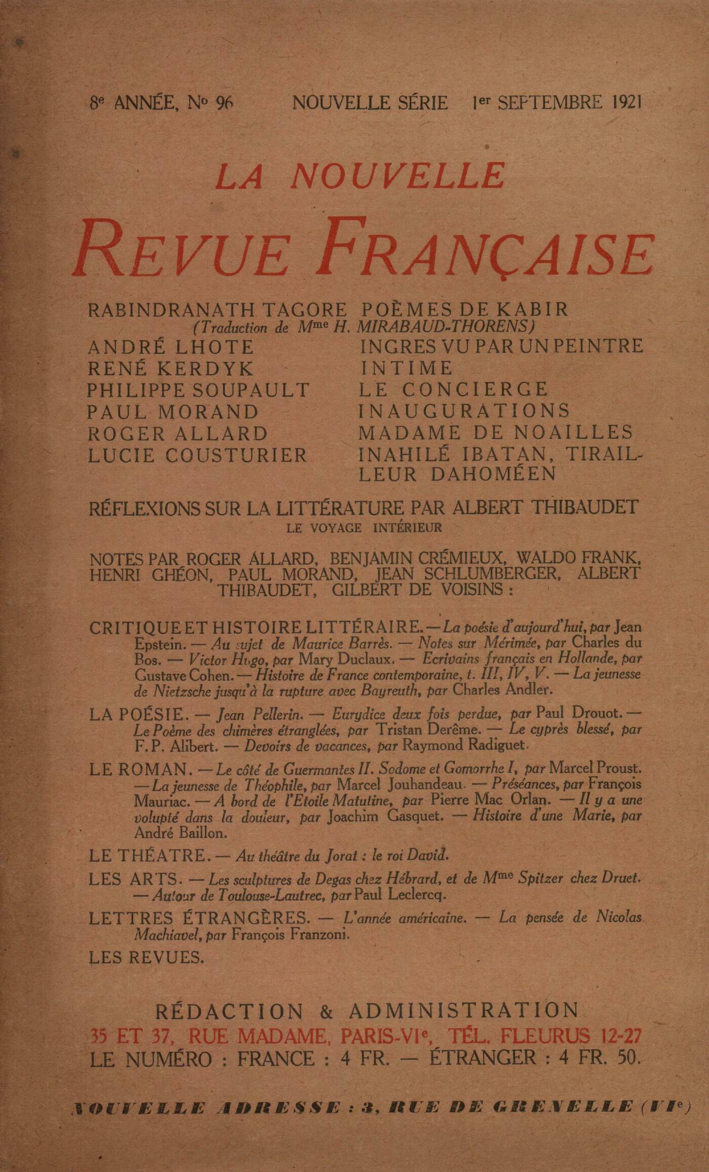 Kabîr, Počmes (Fragments)André Lhote, Ingres vu par un peintreRené Kerdyk, PočmesPhilippe Soupault, PočmesPaul Morand, PočmesRoger Allard, Madame de NoaillesLucie Cousturier, Inahilé Ibatan, tirailleur dahoméenRéflexions sur la littérature : Albert Thibaudet, Le voyage intérieurNotes : critique et histoire littéraire : Paul Morand, La poésie d'aujourd'hui, par Jean Epstein (Éditions de la Sirčne) - Au sujet de Maurice BarrčsAlbert Thibaudet, Notes sur Mérimée, par Charles Du Bos (Crčs) - Victor Hugo, par Mary Duclaux (Constable) - Écrivains français en Hollande, par Gustave Cohen (Champion) - Histoire de France contemporaine III, IV, V - La jeunesse de Nietzsche jusqu'ŕ la rupture avec Bayreuth, par Charles Andler (Éditions Bossard)Notes : la poésie : Roger Allard, Jean PellerinAuguste Gilbert de Voisins, Eurydice deux fois perdue, par Paul Drouot (Société littéraire de France)Roger Allard, Le počme des chimčres étranglées, par Tristan Deręme (Émile-Paul)Jean Schlumberger, La complainte du cyprčs blessé, par François-Paul Alibert (Pierre Polčre)Paul Morand, Devoirs de vacances, par Raymond Radiguet (Éditions de la Sirčne)Notes : le roman : Roger Allard, Le côté de Guermantes, II Sodome et Gomorrhe, I, par Marcel Proust (Éd. de la N. R. F.)Paul Morand, La jeunesse de Théophile, par Marcel Jouhandeau (Éditions de la N. R. F.)Albert Thibaudet, Préséances, par François Mauriac (Émile-Paul)Benjamin Crémieux, Ŕ bord de l'Étoile Matutine, par Pierre Mac Orlan (Crčs)Albert Thibaudet, Il y a une volupté dans la douleur, par Joachim Gasquet (Grasset)Benjamin Crémieux, Histoire d'une Marie, par André Baillon (Rieder)Notes : le théâtre : Henri Ghéon, Le roi David, de René Morax (Théâtre du Jorat)Notes : les arts : Henri Ghéon, Les sculptures de Degas (Hébrard) et de Madame Spitzer (Druet)Roger Allard, Autour de Toulouse-Lautrec, par Paul Leclercq (Floury)Notes : lettres étrangčres : Waldo Frank, L'année américaineBenjamin Crémieux, La pensée de Nicolas Machiavel, par François Franzoni (Payot)Revues : Anonymes, La technique du Vieux-Colombier - Signaux - L'art décoratif, et l'art - Mémento