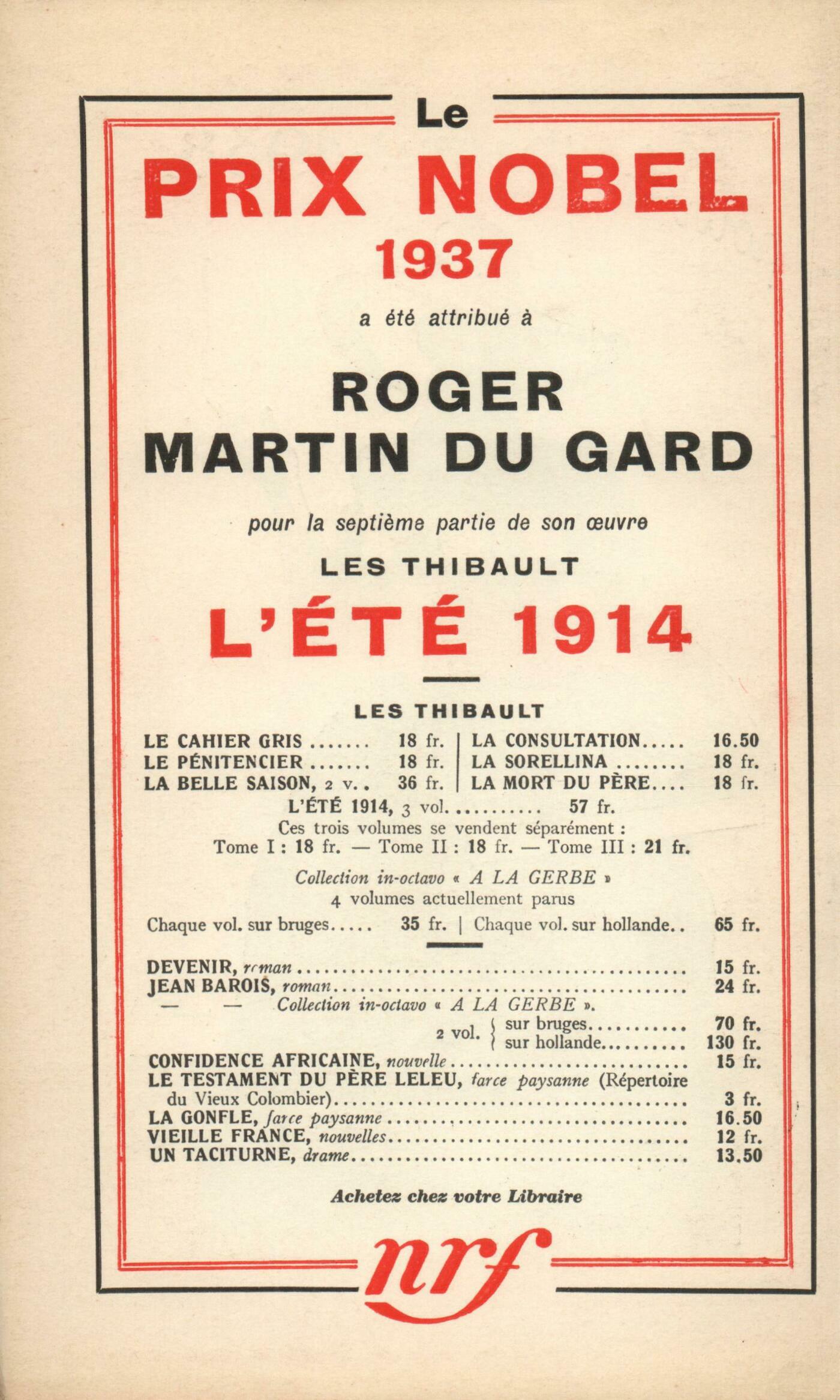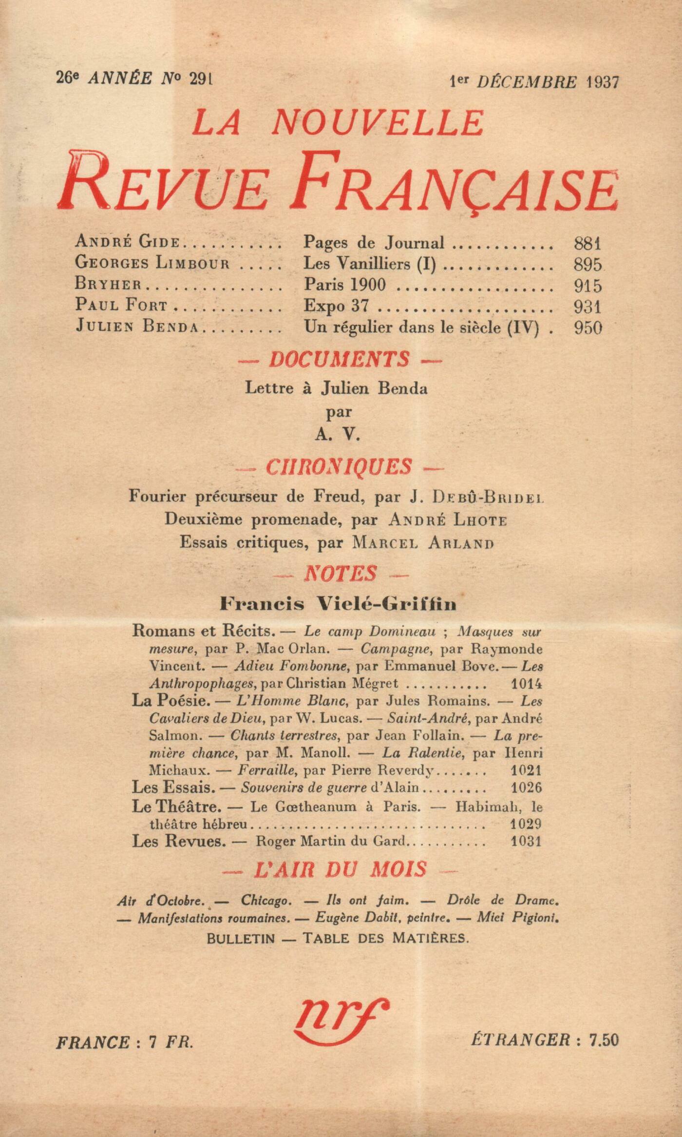 André Gide, Pages de JournalGeorges Limbour, Les Vanilliers (I) Bryher, Paris 1900Paul Fort, Expo 37Julien Benda, Un régulier dans le sičcle (IV)Documents : A. V., Lettre ŕ Julien BendaChroniques : Jacques Debű-Bridel, Fourier psychologue et précurseur de FreudAndré Lhote, Deuxičme promenade ŕ l'ExpositionEssais critiques : Marcel Arland, Doubrowski, par Pouchkine - Conte de Noël, par Jacques Lemarchand - L'École des Parents, par Kléber Haedens - L'Épée du Roi, par Georges Magnane - Le Mérinos, par Henri CaletHenri Ghéon, Sur Francis Viélé-GriffinNotes : romans et récits : Denis Marion, Le Camp Domineau, par Pierre Mac Orlan (Éditions de la N. R. F.) - Masques sur mesure, par Pierre Mac Orlan (Éditions de la N. R. F.)Jean Vaudal, Campagne, par Raymonde Vincent (Stock) - Adieu Fombonne, par Emmanuel Bove (Éditions de la N. R. F.)P. P. Seeligmann, Les Anthropophages, par Christian Mégret (Fayard)Notes : la poésie : Benjamin Crémieux, L'Homme blanc, par Jules Romains (Flammarion)Julien Lanoë, Les Cavaliers de Dieu, par Wilfrid Lucas (Grasset) - Saint André, par André Salmon (Gallimard) - Chants terrestres, par Jean Follain (Denoël) - La Premičre Chance, par Michel Manoll (La Hune) - La Ralentie, par Henri Michaux (G. L. M.) - Ferraille, par Pierre Reverdy (Les Cahiers du Journal des Počtes)Notes : les essais : Jean Schlumberger, Souvenirs de guerre, par Alain (Paul Hartmann)Notes : le théâtre : René Daumal, Scčnes de Faust, par le Goetheanum - Habimah, théâtre hébreu de PalestineLes revues : Louis Martin-Chauffier, Roger Martin du GardL'air du mois : Francis Jammes, Air d'octobre Étiemble, ChicagoJean Grenier, Ils ont faimDenis Marion, Drôle de drameA. Rolland de Renéville, Manifestations roumainesRaymond Guérin, Eugčne Dabit, peintreCharles-Albert Cingria, Miei Pigioni Anonymes, Bulletin