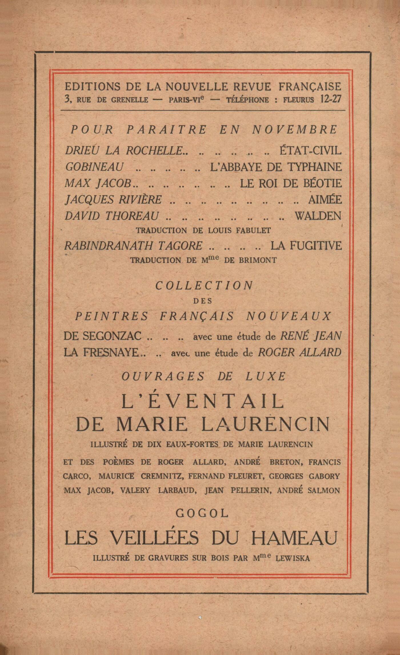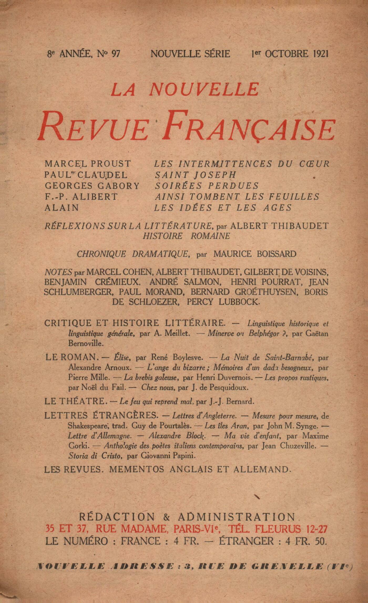 Marcel Proust, Les intermittences du curPaul Claudel, Saint JosephGeorges Gabory, Soirées perduesFrançois-Paul Alibert, Ainsi tombent les feuilles Les voix ŕ la fontaine Alain, Les idées et les âgesRéflexions sur la littérature : Albert Thibaudet, Histoire romaineNotes : critique et histoire littéraire : Maurice Boissard, Chronique dramatiqueMarcel Cohen, Linguistique historique et linguistique générale, par A. Meillet (Champion)Notes : le roman : Albert Thibaudet, Minerve ou Belphégor? par Gaëtan Bernoville (Bloud) - Élise, par René Boylesve (Calmann-Lévy)Auguste Gilbert de Voisins, La nuit de Saint Barnabé, par Alexandre Arnoux (Albin Michel)Benjamin Crémieux, L'ange du bizarre, par Pierre Mille (Ferenczi) - Mémoires d'un dada besogneux, par Pierre Mille (Crčs)André Salmon, La brebis galeuse, par Henri Duvernois (Flammarion)Henri Pourrat, Les Propos Rustiques, de Noël du Fail (Bossard)Notes : le théâtre : Henri Pourrat, Chez nous, par Joseph de Pesquidoux (Plon)Notes : lettres étrangčres : Jean Schlumberger, Le Feu qui reprend mal, par Jean-Jacques Bernard (Illustration du 6 aoűt)Percy Lubbock, Lettre d'AngleterreJean Schlumberger, Mesure pour Mesure, de Shakespeare (Société littéraire de France)Paul Morand, Les îles Aran, par John M. Synge (Rieder)Bernard Groethuysen, Lettre d'AllemagneBoris de Schlzer, Alexandre BlockBenjamin Crémieux, Ma vie d'enfant, par Maxime Gorki - Anthologie des počtes italiens contemporains, par Jean Chuzeville (Bibliothčque Universelle) - Storia di Cristo, par Giovanni Papini (Vallechi)Paul Morand, Anthologie nčgre, par Blaise Cendrars (La Sirčne)Revues : Anonymes, Les Trois Impostures, de P.-J. Toulet - Les jardins sauvages - Amiel et la pluralité des locutions - Lettres de soldats - Mémento - Mémento bibliographique : littérature anglaise - Mémento bibliographique : littérature allemande