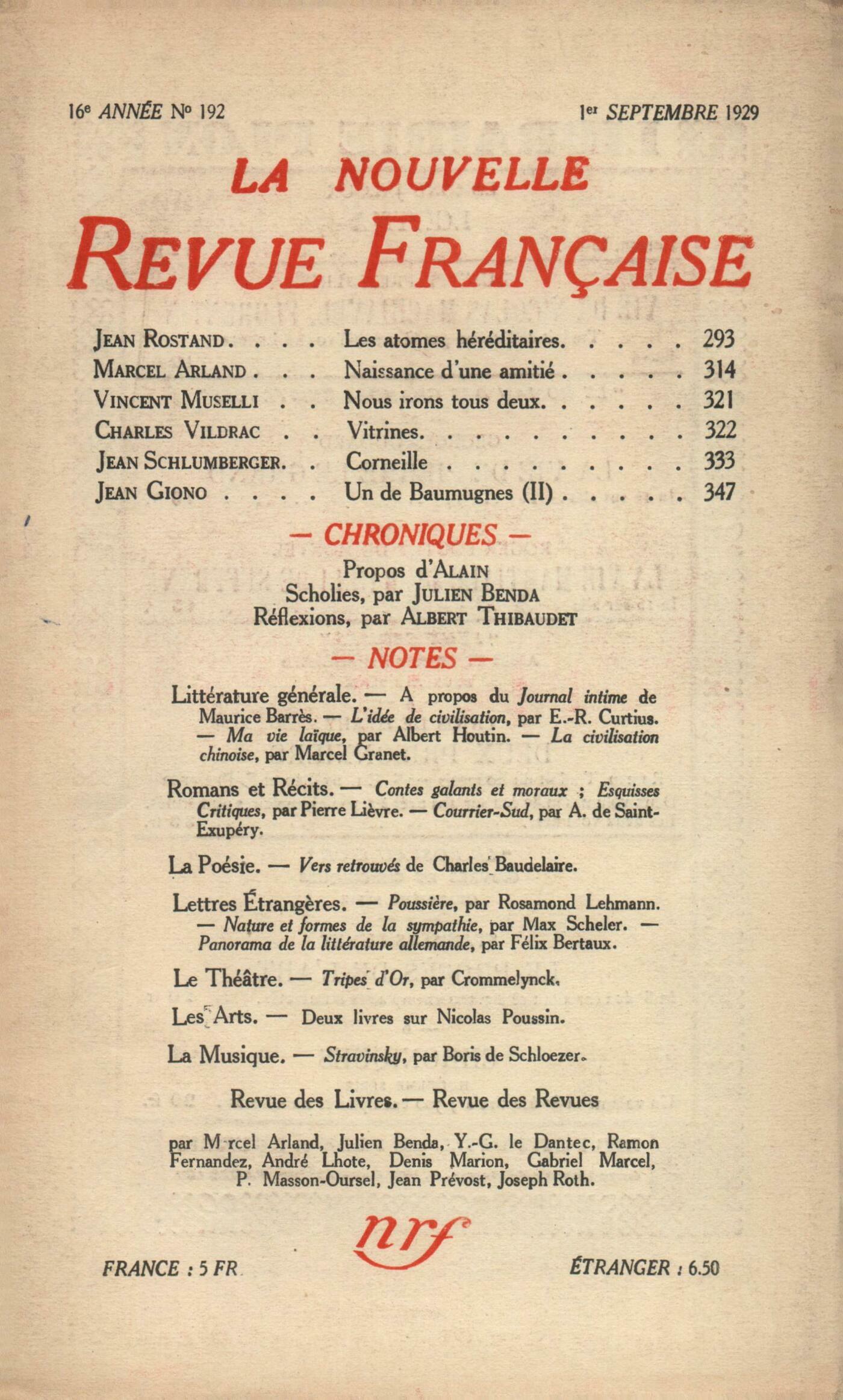 Jean Rostand, Les atomes héréditairesMarcel Arland, Naissance d'une amitiéVincent Muselli, Nous irons tous deuxCharles Vildrac, VitrinesJean Schlumberger, CorneilleJean Giono, Un de Baumugnes (II) Alain, ProposRéflexions : Albert Thibaudet, Enfants TerriblesScholies : Julien Benda, Sur la Pensée bourgeoiseNotes : littérature générale : Marcel Arland, Maurice BarrčsRamon Fernandez, L'Idée de civilisation dans la conscience française, par Ernst Robert Curtius (Publications de la Conciliation Internationale)Julien Benda, Ma vie laďque, par Albert Houtin (Rieder)Paul Masson-Oursel, La civilisation chinoise, par Marcel Granet (Renaissance du livre)Notes : le roman, les récits : Jean Prévost, Ouvrages galants et moraux, par Pierre Ličvre (N. R. F.) - Esquisses critiques, par Pierre Ličvre (Le Divan) - Courrier Sud, par Antoine de Saint-Exupéry (Éditions de la N. R. F.)Notes : la poésie : Y.-G. Le Dantec, Vers retrouvés, par Charles Baudelaire (Émile-Paul)Notes : lettres étrangčres : Marcel Arland, Poussičre, par Rosamond Lehmann (Plon)Jean Prévost, Nature et forme de la sympathie, par Max Scheler (Payot)Joseph Roth, Panorama de la littérature allemande contemporaine, par Félix Bertaux (Kra)Notes : le théâtre : Denis Marion, Tripes d'Or, par Fernand CrommelynckNotes : les arts : André Lhote, Deux livres sur Nicolas PoussinNotes : la musique : Gabriel Marcel, Stravinsky, par Boris de Schoezer (Claude Aveline)Revue des livres : Jean Prévost, La vie martiale du Bailli de Suffren, par R. Boutet de Monvel (Plon)Marcel Arland, Histoire de la Commune de 1871, par Lissagaray (Librairie du Travail)Jean Prévost, Le mythe de Jésus, par Arthur Drews (Payot) - Le voyage de Shakespeare, par Léon Daudet (N. R. F.) - Clio, par André Chamson (Hazan) - Panoramique du cinéma, par Léon Moussinac (Au Sans Pareil)Revue des revues : Jean Guérin, Le Grand Jeu - Marc Chagall - Sur la création poétique