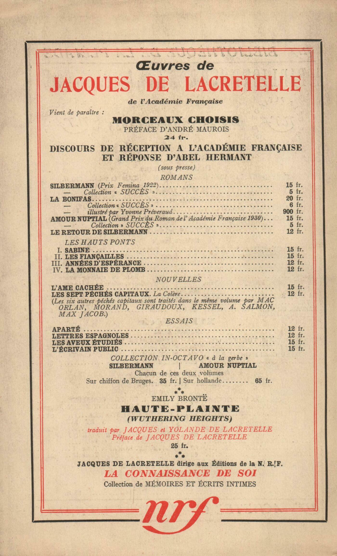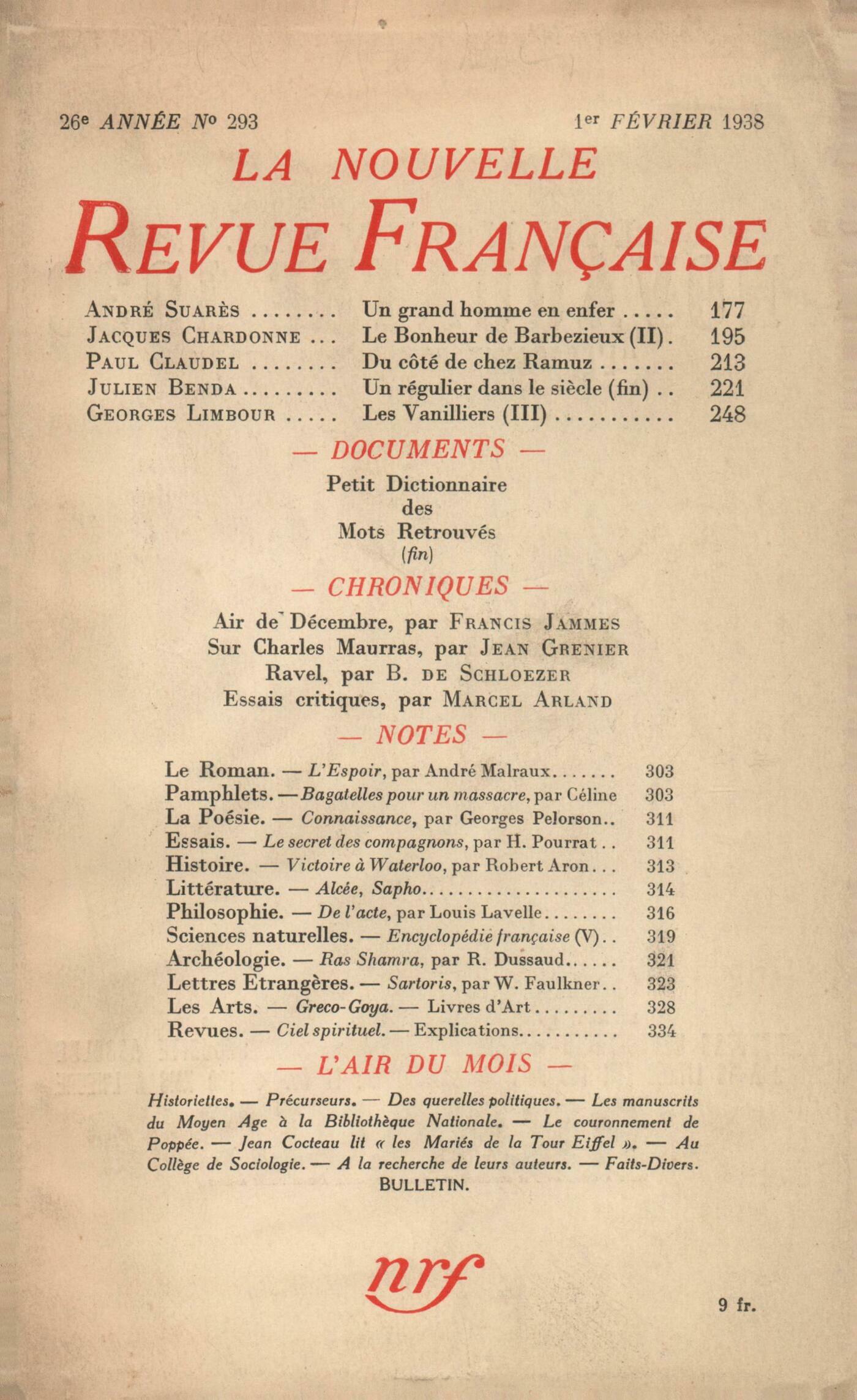 André Suarčs, Un grand homme en enferJacques Chardonne, Le bonheur de Barbezieux (II)Paul Claudel, Du côté de chez RamuzJulien Benda, Un Régulier dans le sičcle (Fin)Georges Limbour, Les Vanilliers (III)Documents : Anonymes, Petit dictionnaire des mots retrouvés (Fin)Chroniques : Francis Jammes, Air de décembreJean Grenier, Réflexions sur Charles MaurrasBoris de Schlzer, Maurice RavelEssais critiques : Marcel Arland, L'Espoir, par André Malraux - Bagatelles pour un massacre, par Louis-Ferdinand CélineNotes : la poésie : Jean Wahl, Connaissance, par Georges Pelorson (Fustier)Notes : les essais : Marcel Caster, Le secret des compagnons, par Henri Pourrat (Éditions de la N. R. F.) - La veillée de novembre, par Henri Pourrat (Éditions de la Cigale)Notes : histoire : Denis de Rougemont, Victoire ŕ Waterloo, par Robert Aron (Albin Michel)Notes : littérature : Marie Delcourt, Alcée Sapho (Les Belles-Lettres)Notes : philosophie : Gabriel Marcel, De l'acte, par Louis Lavelle (Éditions Montaigne)Notes : sciences naturelles : René Daumal, Encyclopédie française, VNotes : archéologie : Édouard Dhorme, Les découvertes de Ras Shamra (Ugarit) et l'Ancien Testament, par René Dussaud (Geuthner)Notes : lettres étrangčres : Jean-Paul Sartre, Sartoris, par William Faulkner (Éditions de la N. R. F.)Notes : les arts : André Lhote, Gréco-Goya - Le Gréco, par Legendre et Hartmann (Hypérion) - Guernica, par Picasso (Cahiers d'Art)Les revues : André Suarčs, Ciel spirituelJean Paulhan, ExplicationsL'air du mois : Maurice Sachs, HistoriettesJean Grenier, Deux précurseursJulien Benda, Des querelles politiquesCharles-Albert Cingria, Les plus beaux manuscrits du Moyen Âge ŕ la Bibliothčque NationaleJean Schlumberger, Le Couronnement de Poppée ŕ l'Opéra-ComiqueRoger Lannes, Jean Cocteau lit Les mariés de la tour EiffelJean Wahl, Au Collčge de SociologieMarcel Lecomte, Ŕ la recherche de leurs auteursJacques Audiberti, Faits-diversJean Guérin, Bulletin
